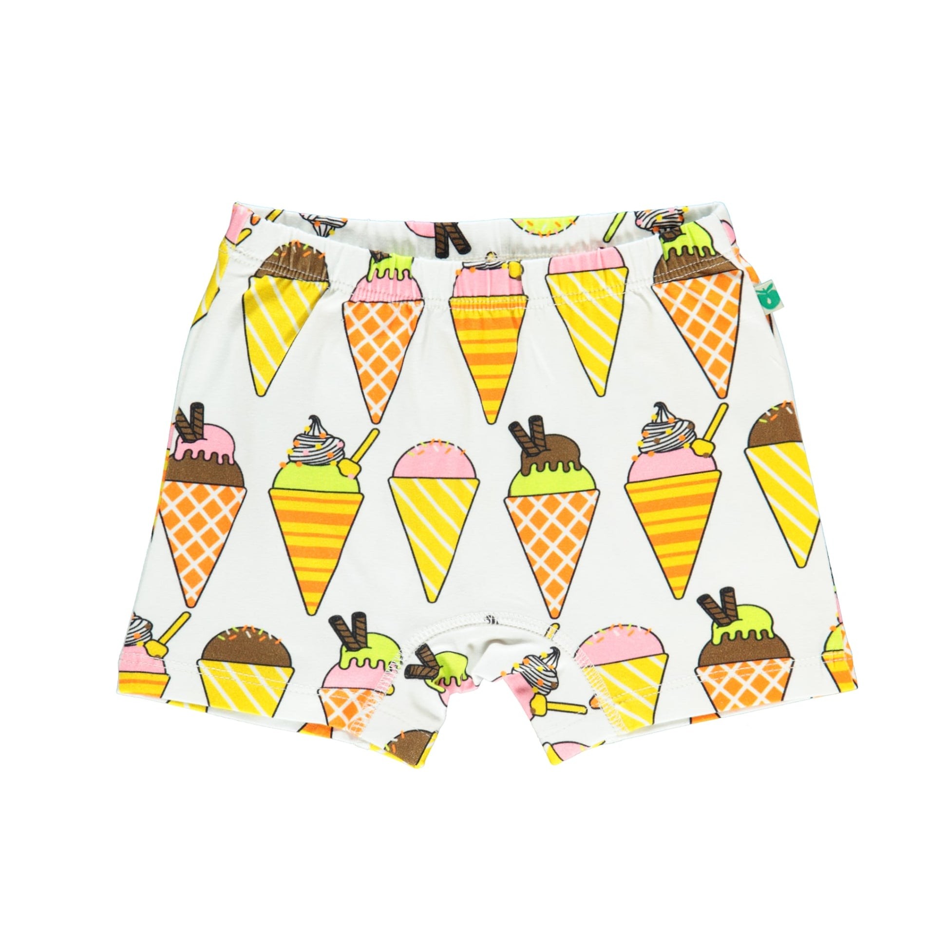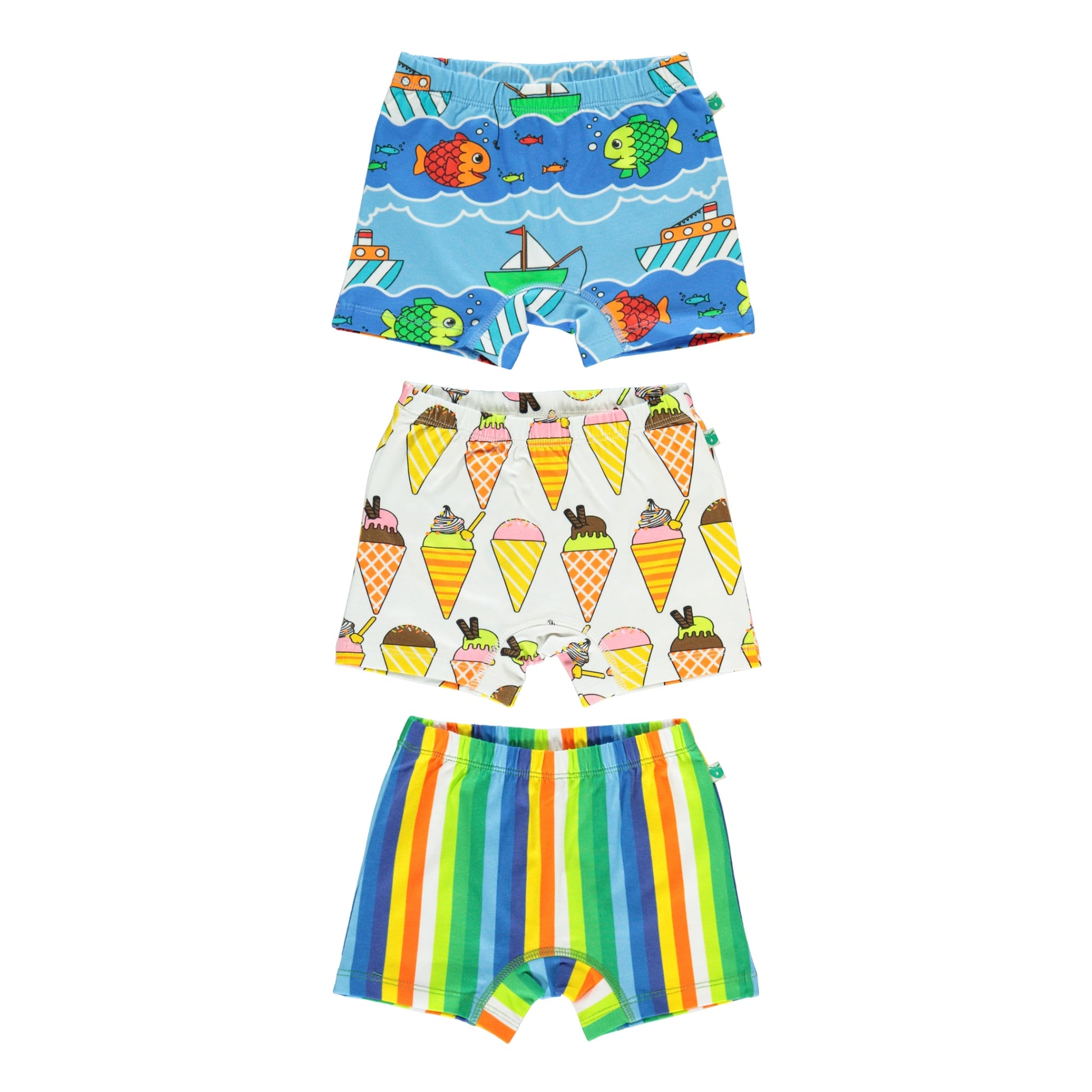 3-Pack Unterwäsche-Set mit Eiscreme, Streifen, Boot und Fisch von Småfolk, hergestellt aus dehnbarem Bio-Baumwolljersey. Dieses Set ist nach OEKO-TEX Standard 100® zertifiziert, was bedeutet, dass die Unterhosen hergestellt und auf Schadstoffe getestet wurden, sodass Sie sich um die Haut und Gesundheit Ihres Kindes kümmern können. Die Unterhose hat eine normale bequeme Passform mit Gummizug in der Taille.