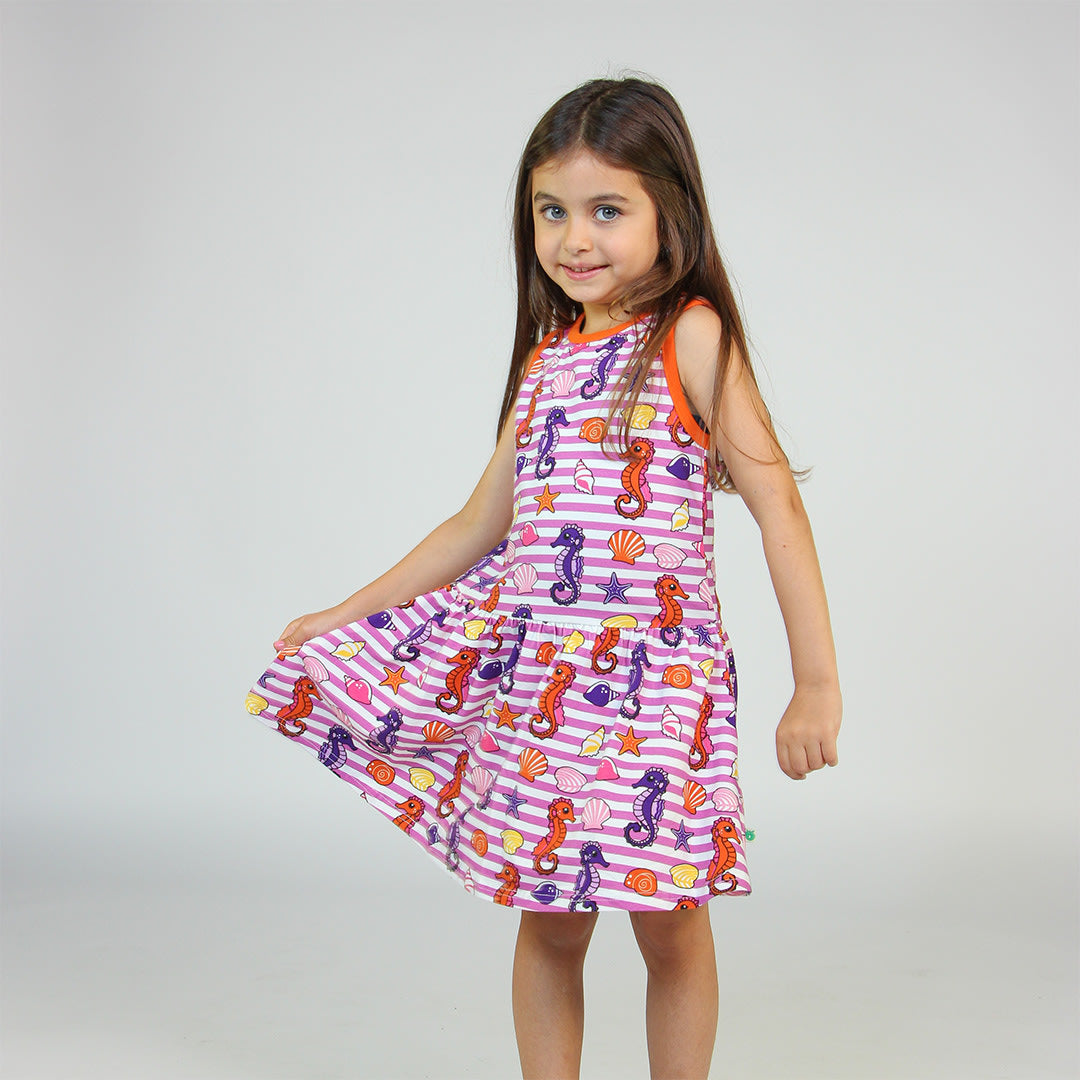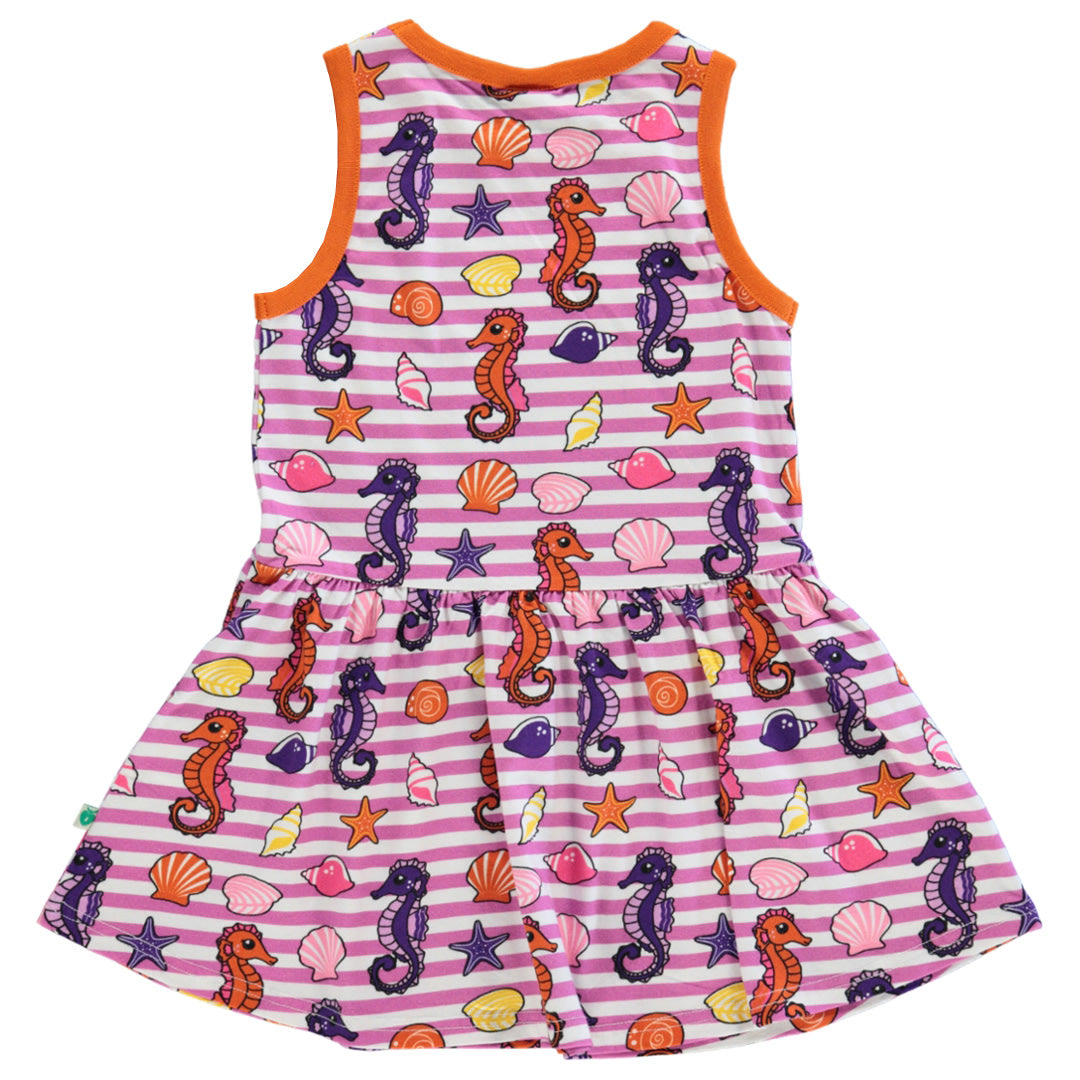 Ärmellos Kleid mit Seepferdchen, hergestellt aus dehnbarem Bio-Baumwolljersey. Dieses Kleid ist nach OEKO-TEX Standard 100® zertifiziert, was bedeutet, dass das Kleid hergestellt und auf Schadstoffe getestet wurde, sodass Sie sich um die Haut und Gesundheit Ihres Kindes kümmern können. Das Kleid hat einen Schnitt in der Taille, der für einen schönen Fall sorgt, sowie Rippbündchen am Hals und an den Ärmeln. Die Kleider von Småfolk werden in Dänemark mit dem Ziel entworfen, unzähligen Abenteuern und Spielen standzuhalten und auch nach mehrmaligem Tragen Form und Farbe zu behalten.