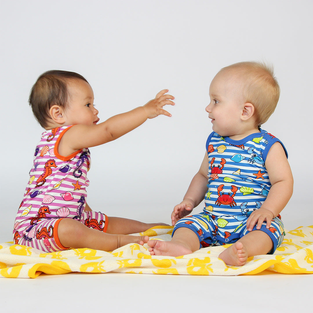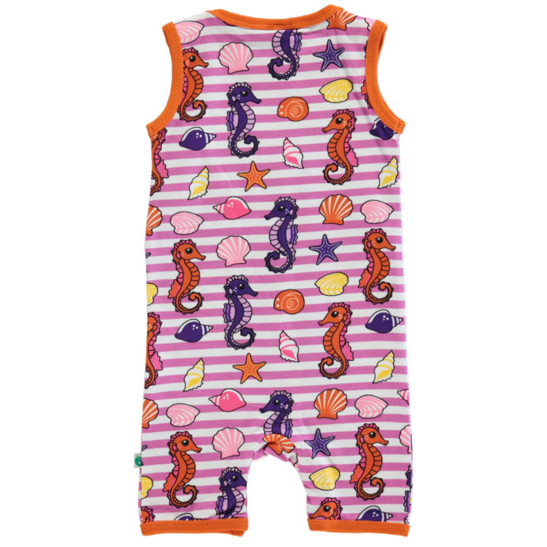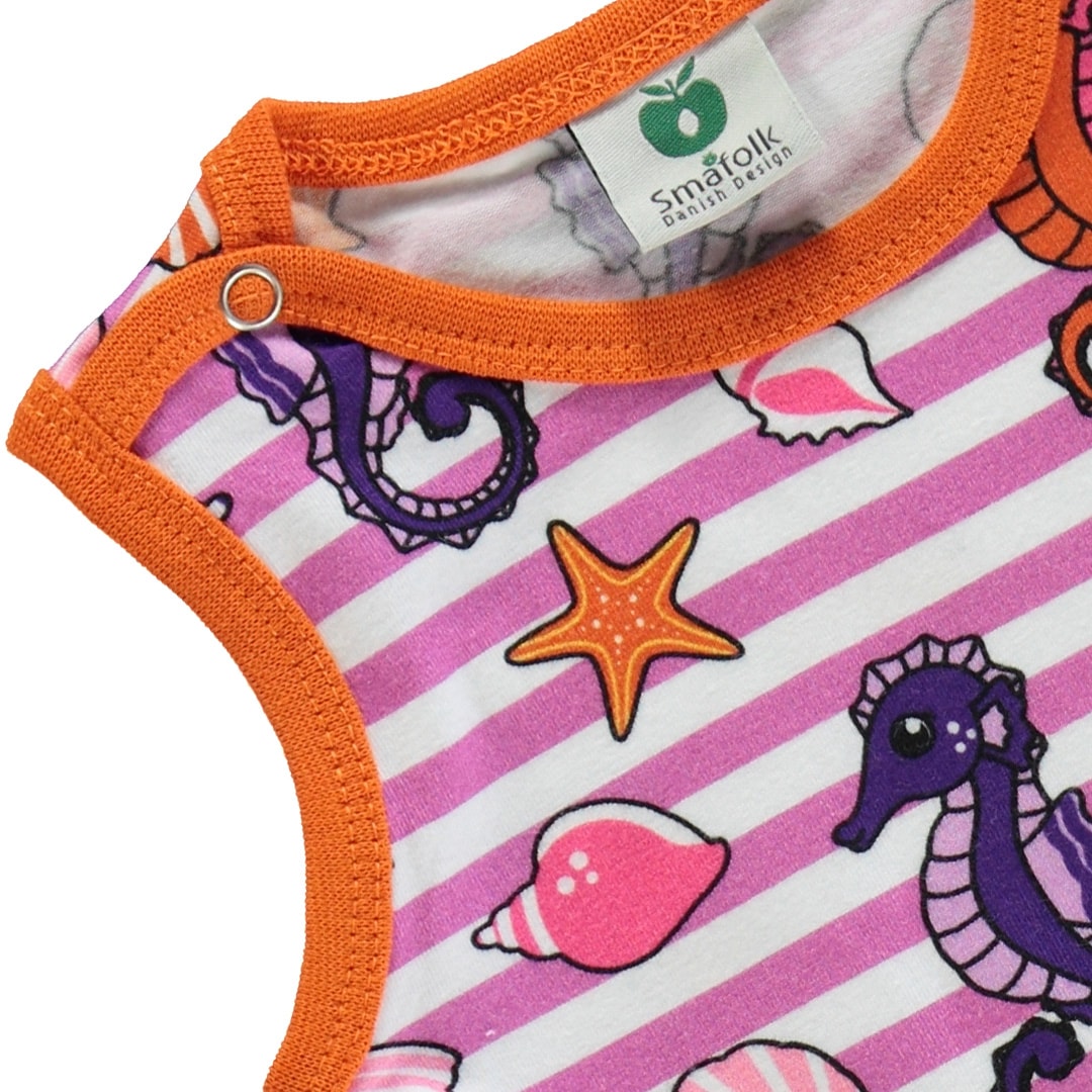 Ärmellos Strampler mit Seepferdchen, hergestellt aus organischem und dehnbarem Baumwolljersey. Dieser Strampler ist nach OEKO-TEX Standard 100® zertifiziert, was bedeutet, dass dieser Strampler hergestellt und auf schädliche Chemikalien getestet wurde, um die Haut und Gesundheit Ihres Kindes zu schützen. Dieser Strampler hat eine normale Passform mit Druckknöpfen sowie Rippbündchen. Der Körper von Småfolk werden in Dänemark entworfen und halten unzähligen Abenteuern und endlosen Spielstunden stand und behalten auch nach mehrmaligem Gebrauch ihre Form und Farbe.