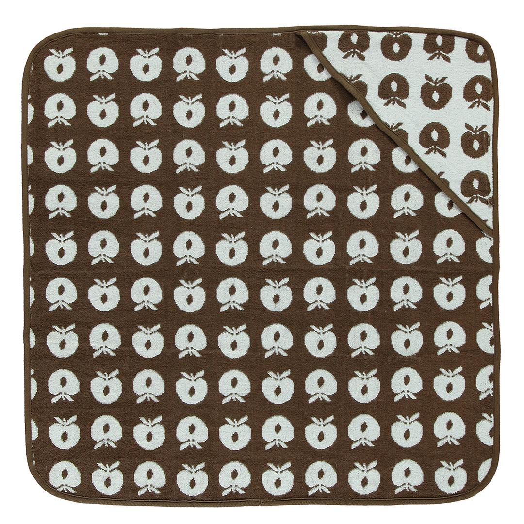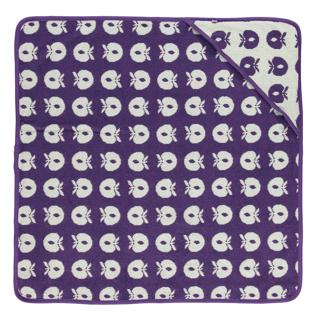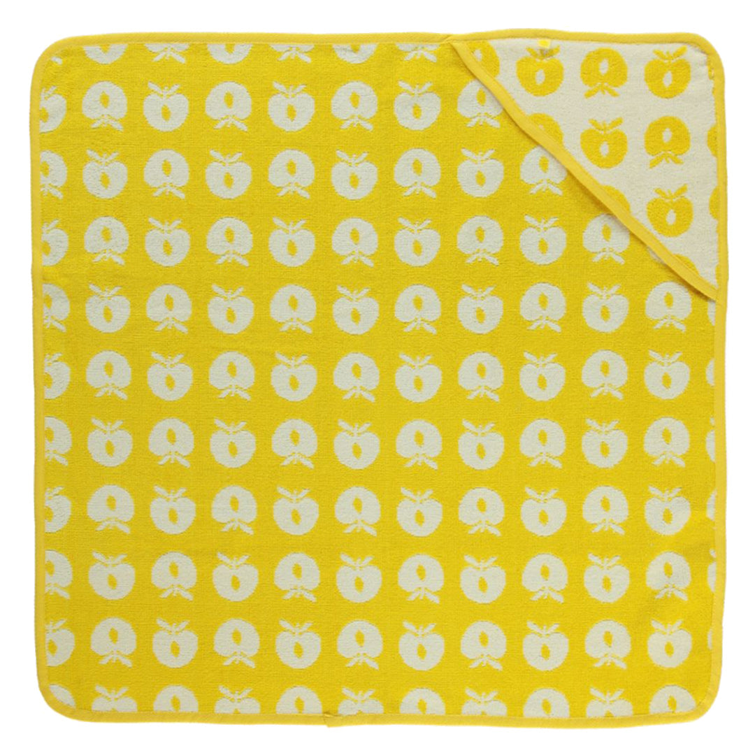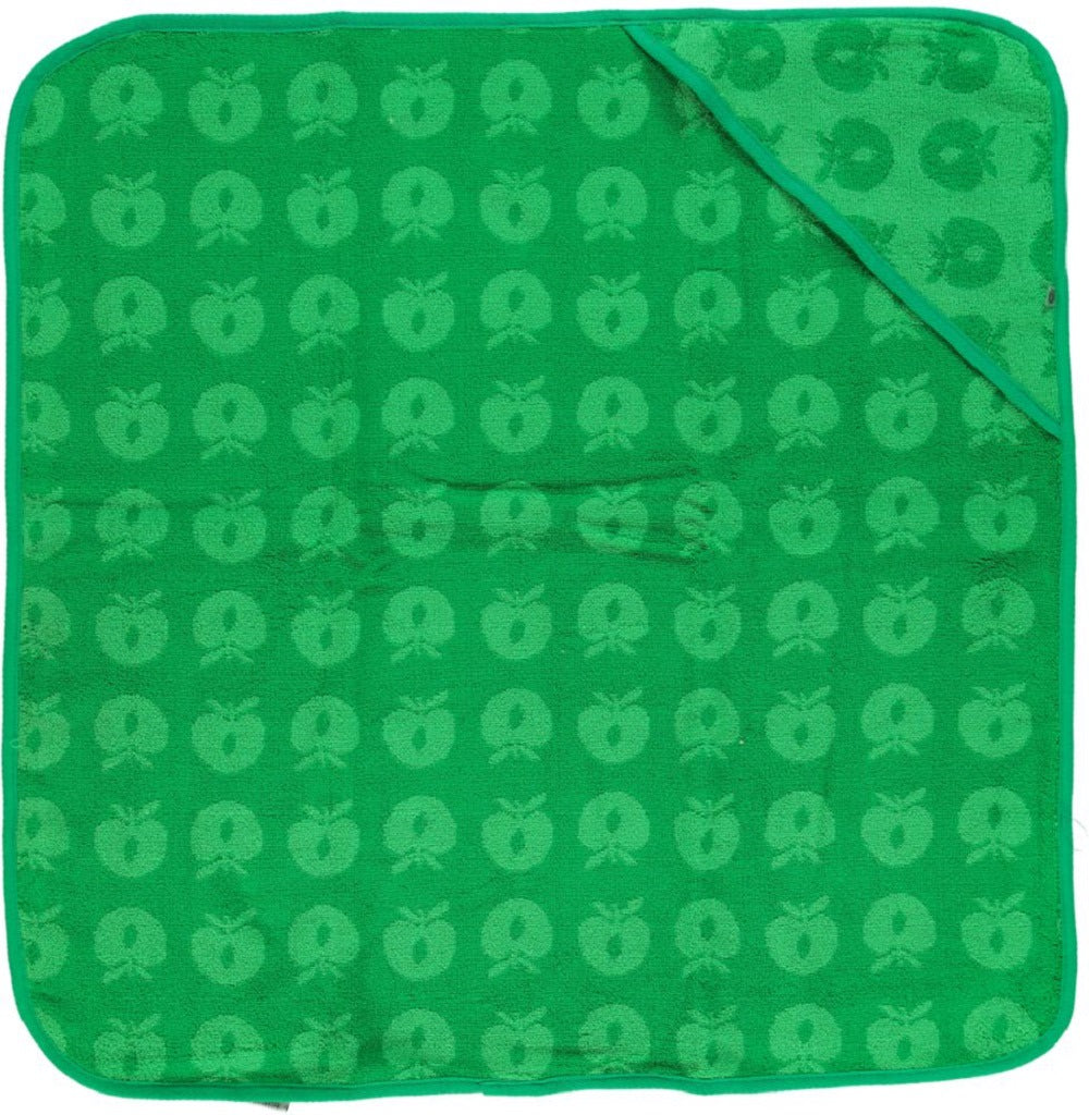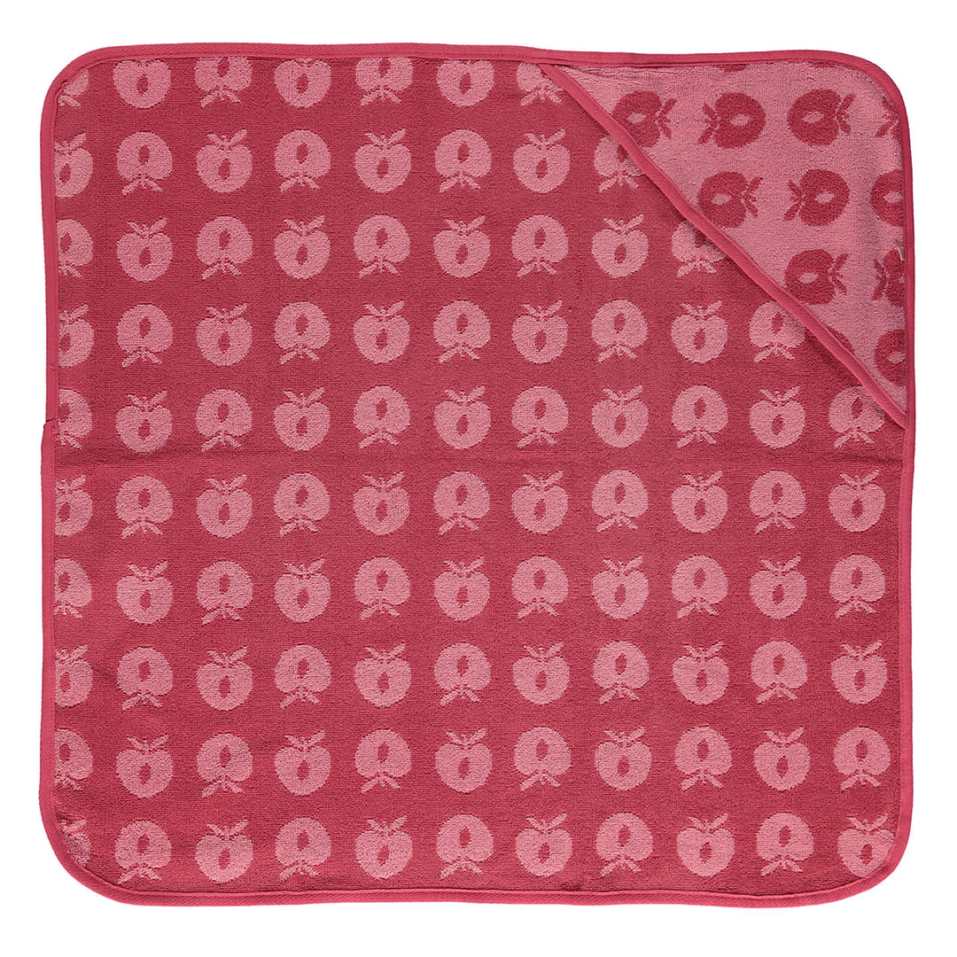 Babyhandtuch mit Äpfeln. Das Handtuch hat eine kleine Kapuze in einer Ecke und ermöglicht so ein einfaches und bequemes Einwickeln des Babys nach einem schönen Bad.