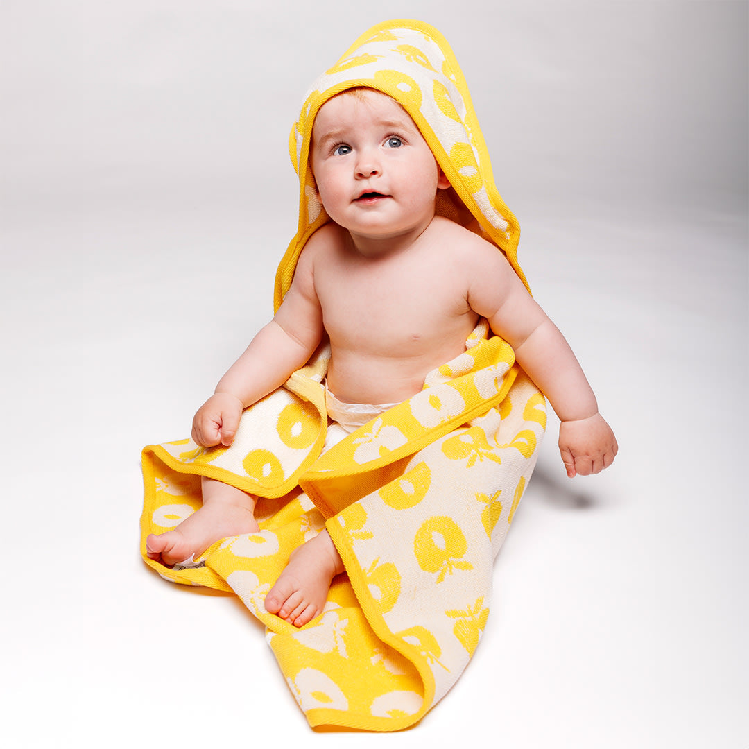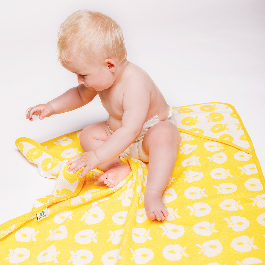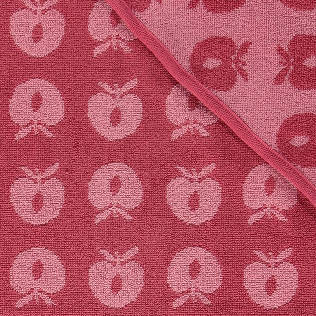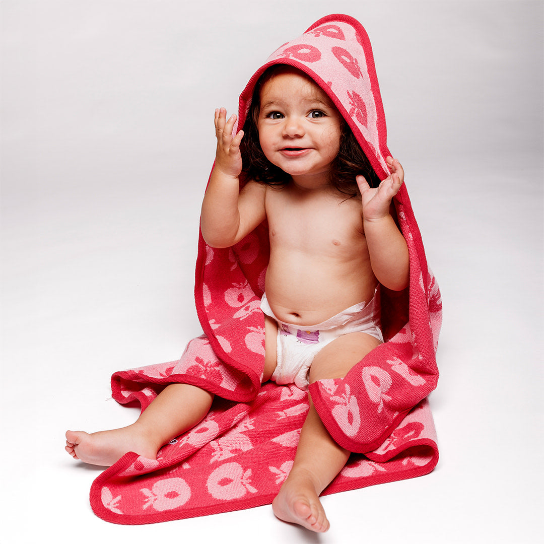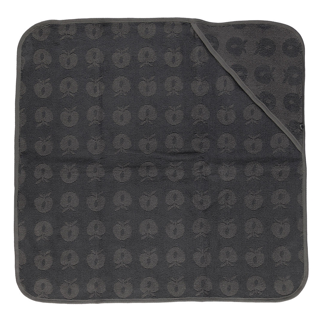 Babyhandtuch mit Äpfeln. Das Handtuch hat eine kleine Kapuze in einer Ecke und ermöglicht so ein einfaches und bequemes Einwickeln des Babys nach einem schönen Bad.