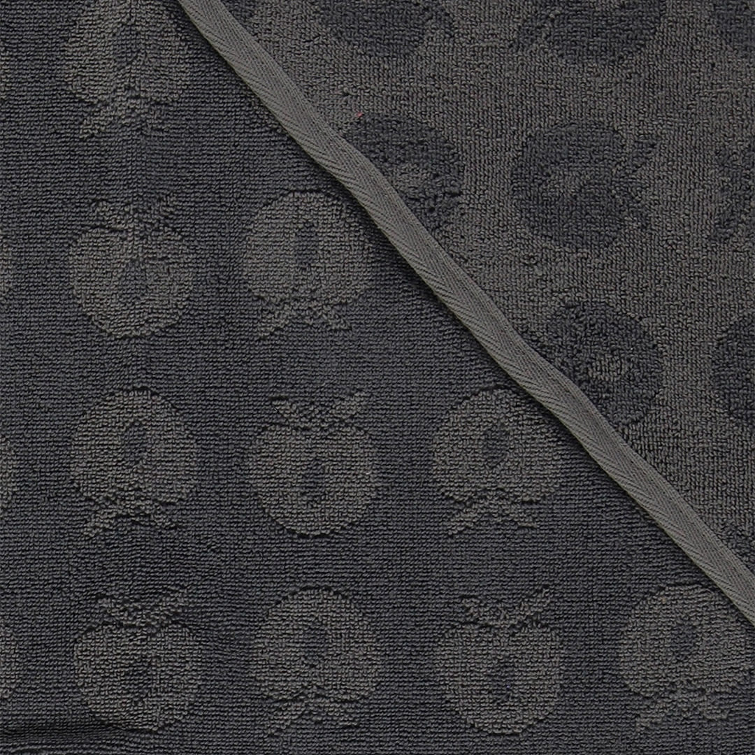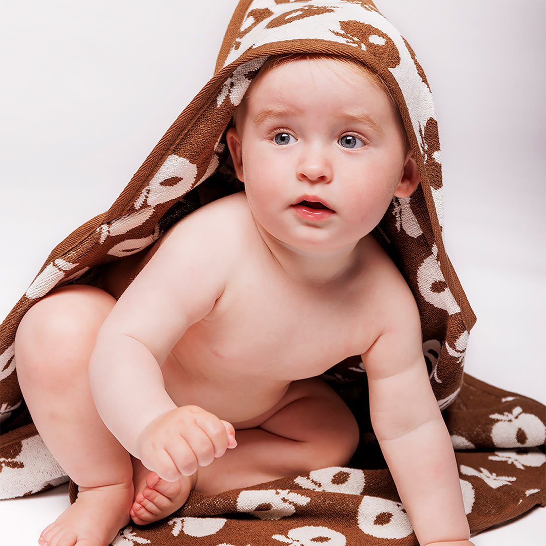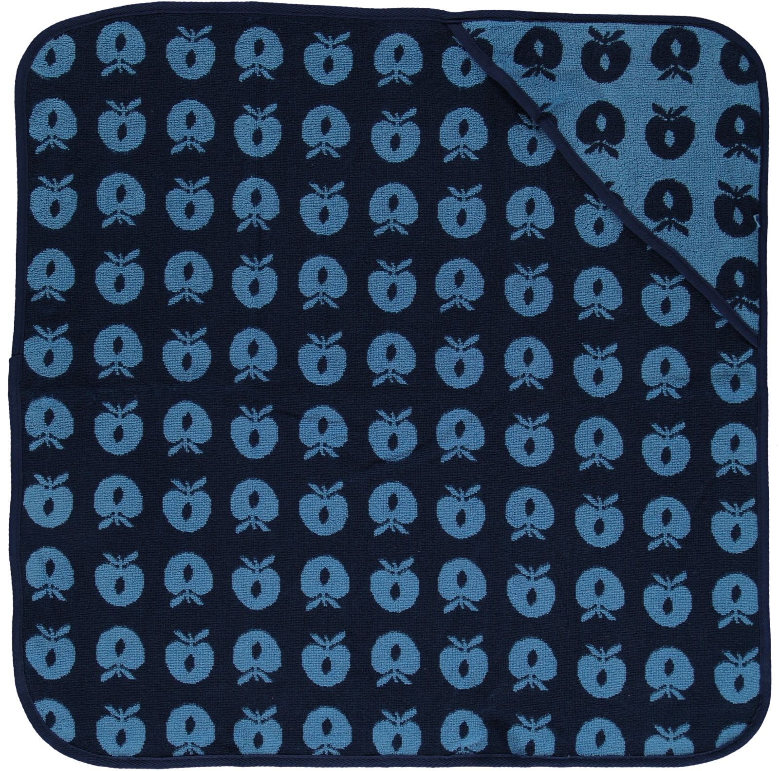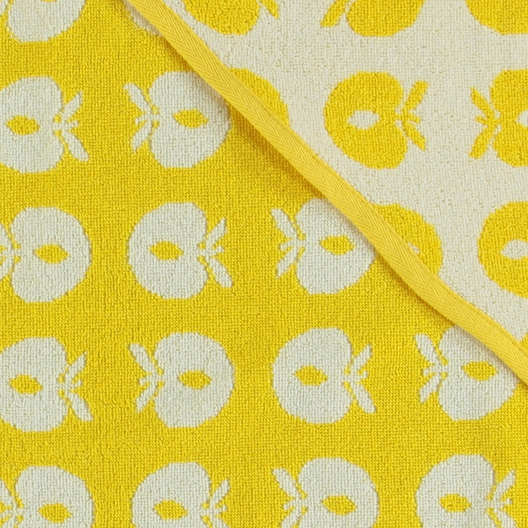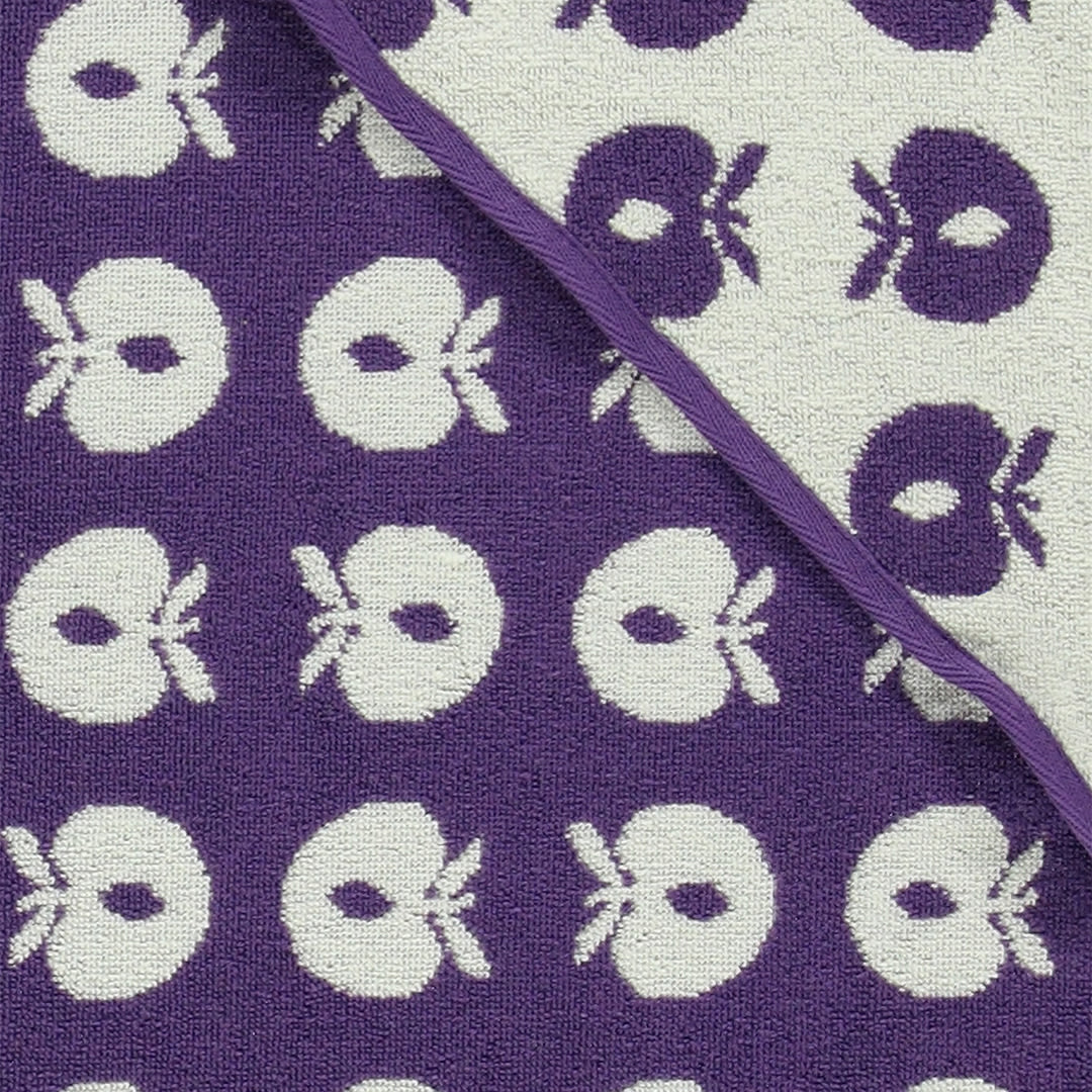 Babyhandtuch mit Äpfeln. Das Handtuch hat eine kleine Kapuze in einer Ecke und ermöglicht so ein einfaches und bequemes Einwickeln des Babys nach einem schönen Bad.