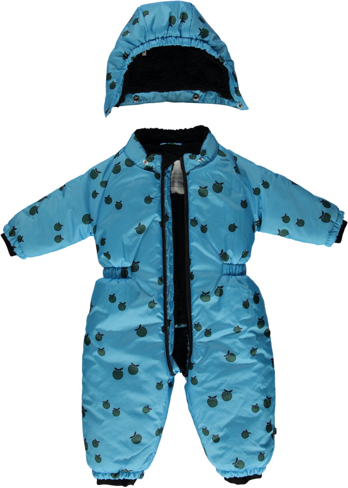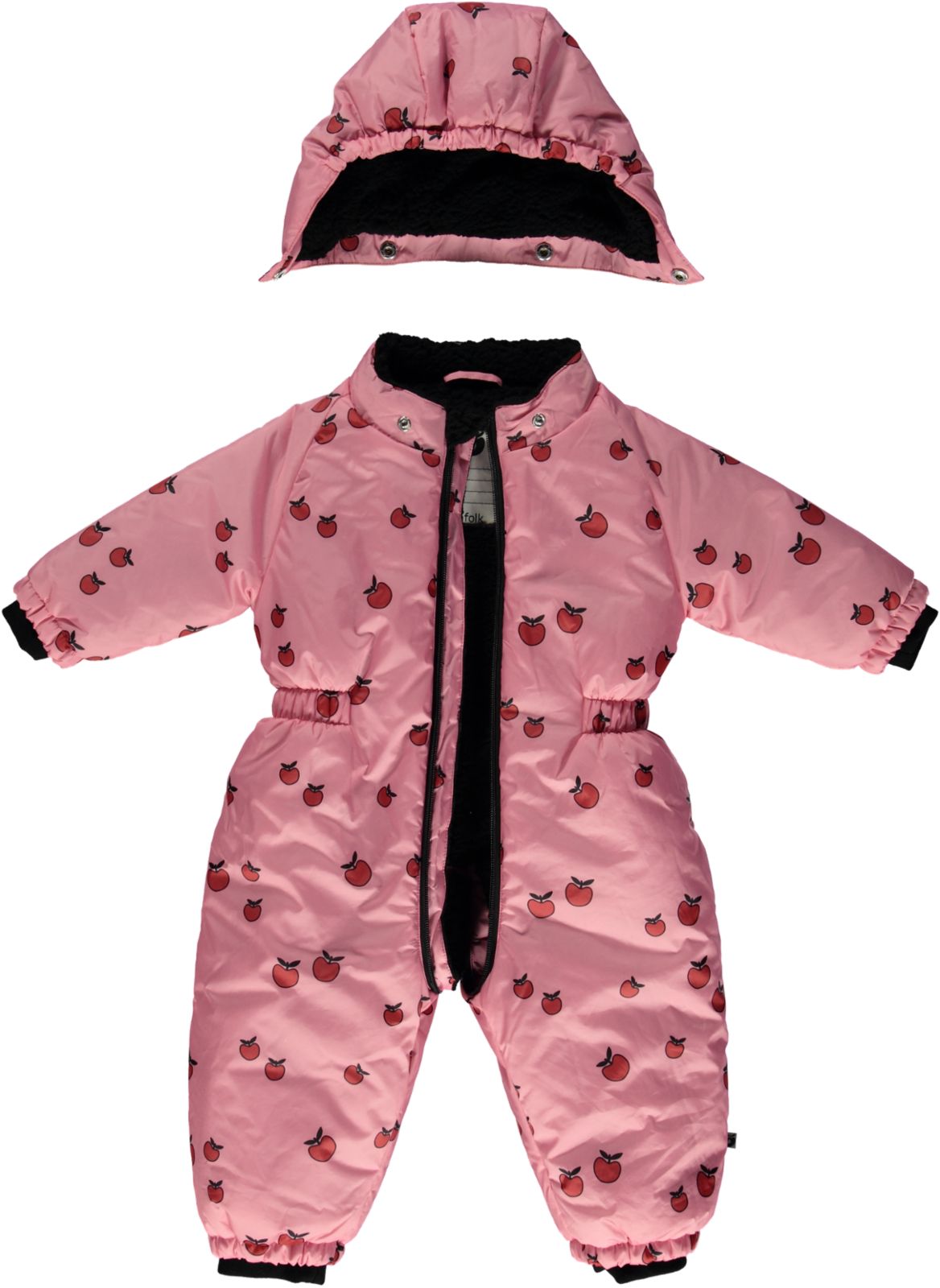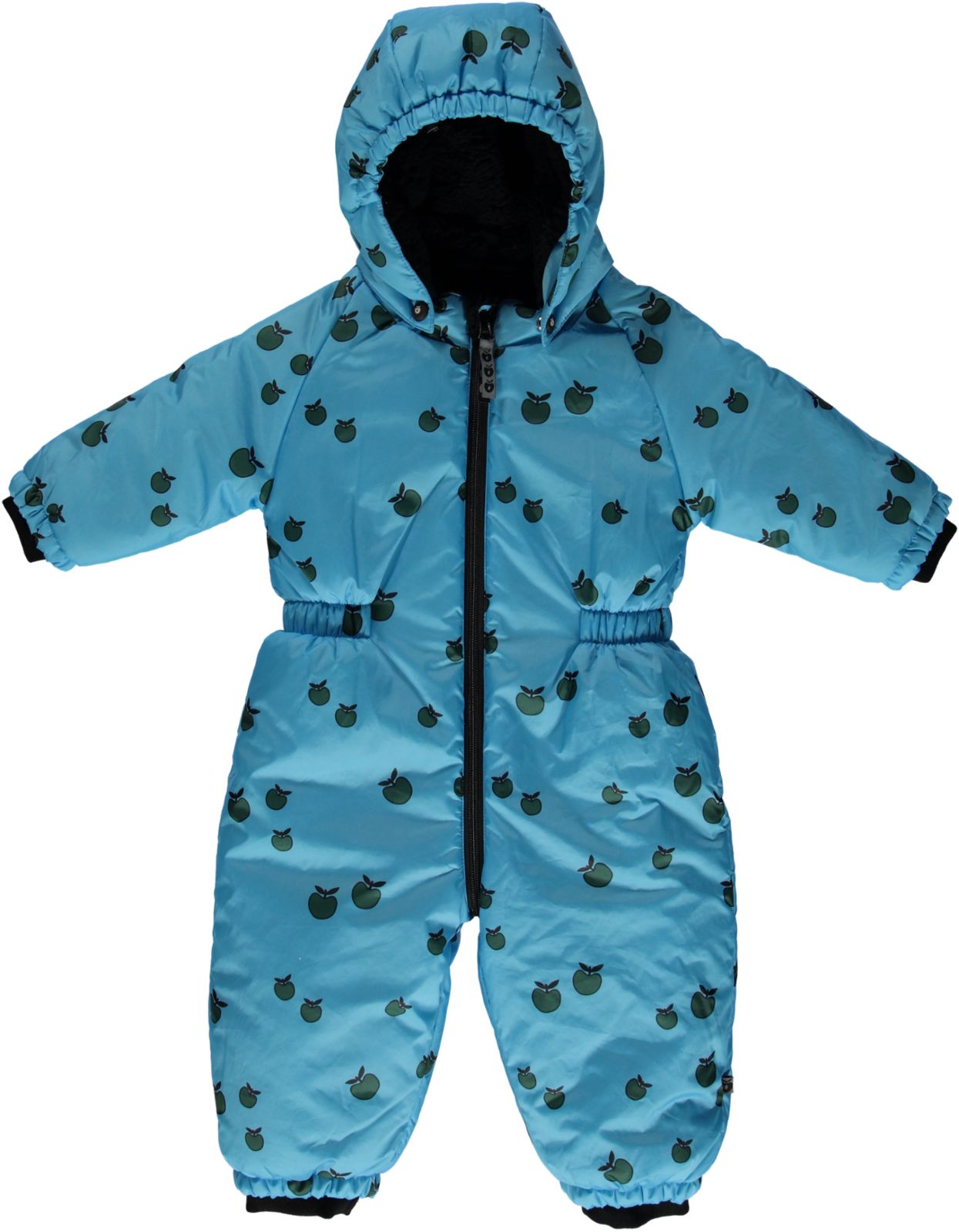 Baby winter suit with Apple print.The suit has soft fleece lining,and wind cuffs at the wristand by the foot.The suit has one zipper that goes form the neckand around to the back, this way is possible tochange diaper without taking the suit of.The suit has elastic waist for better fit.The winter suit has a Thermolite Plus lightweight padding, that keeps your child dry and warm.Bionic Finish Eco:Småfolk outerwear is treated with Bionic Finish Eco, a coating that prevents moisture from passing though to the inside of the garment, yet letting the vapour out. This will keep your child dry and warm.Bionic Finish Eco treatment use NO non-biodegradable organicfluorine compounds.This product is water resistant, windproofand breathable.