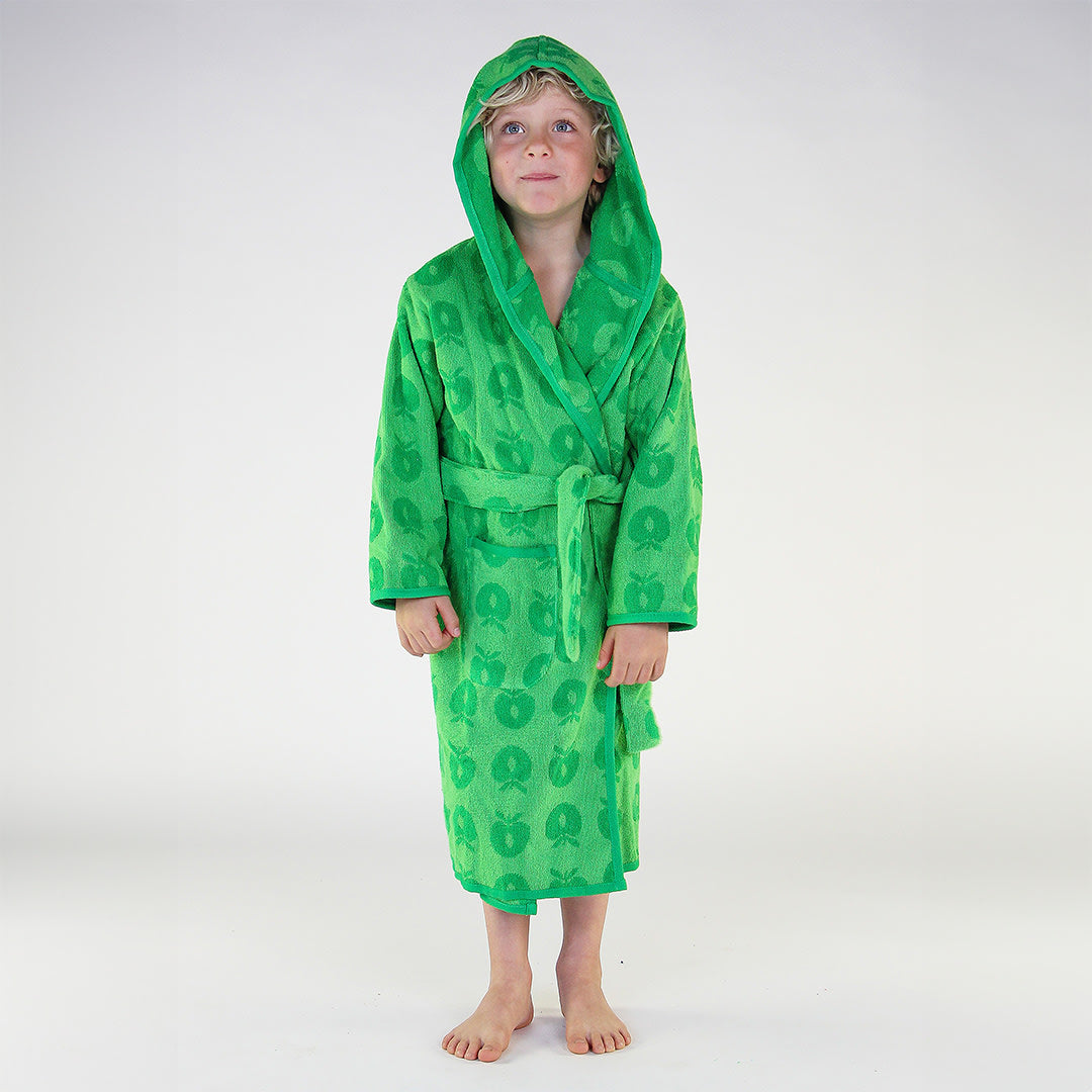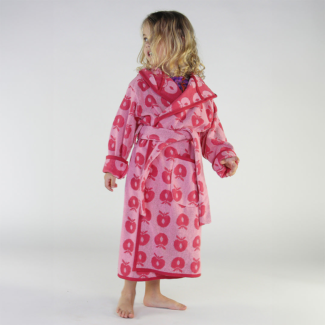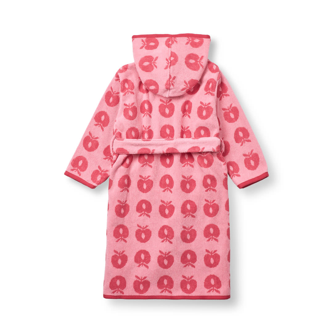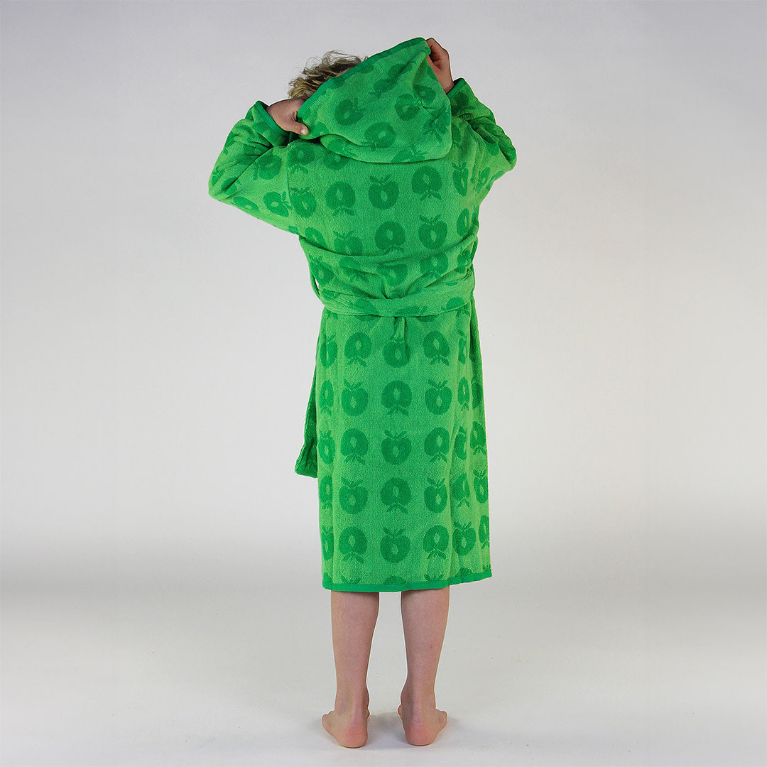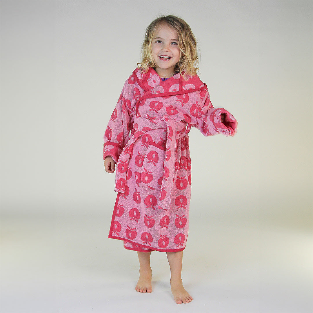 Bademantel mit Äpfeln. Köstlich weicher und warmer Bademantel in supersaugfähiger, dicker Frotteequalität. Der Bademantel hat zwei große Taschen, eine große Kapuze und einen starken Gürtel in der Taille.