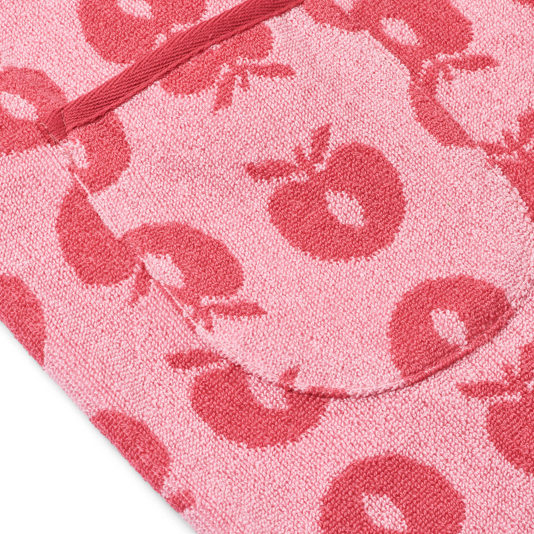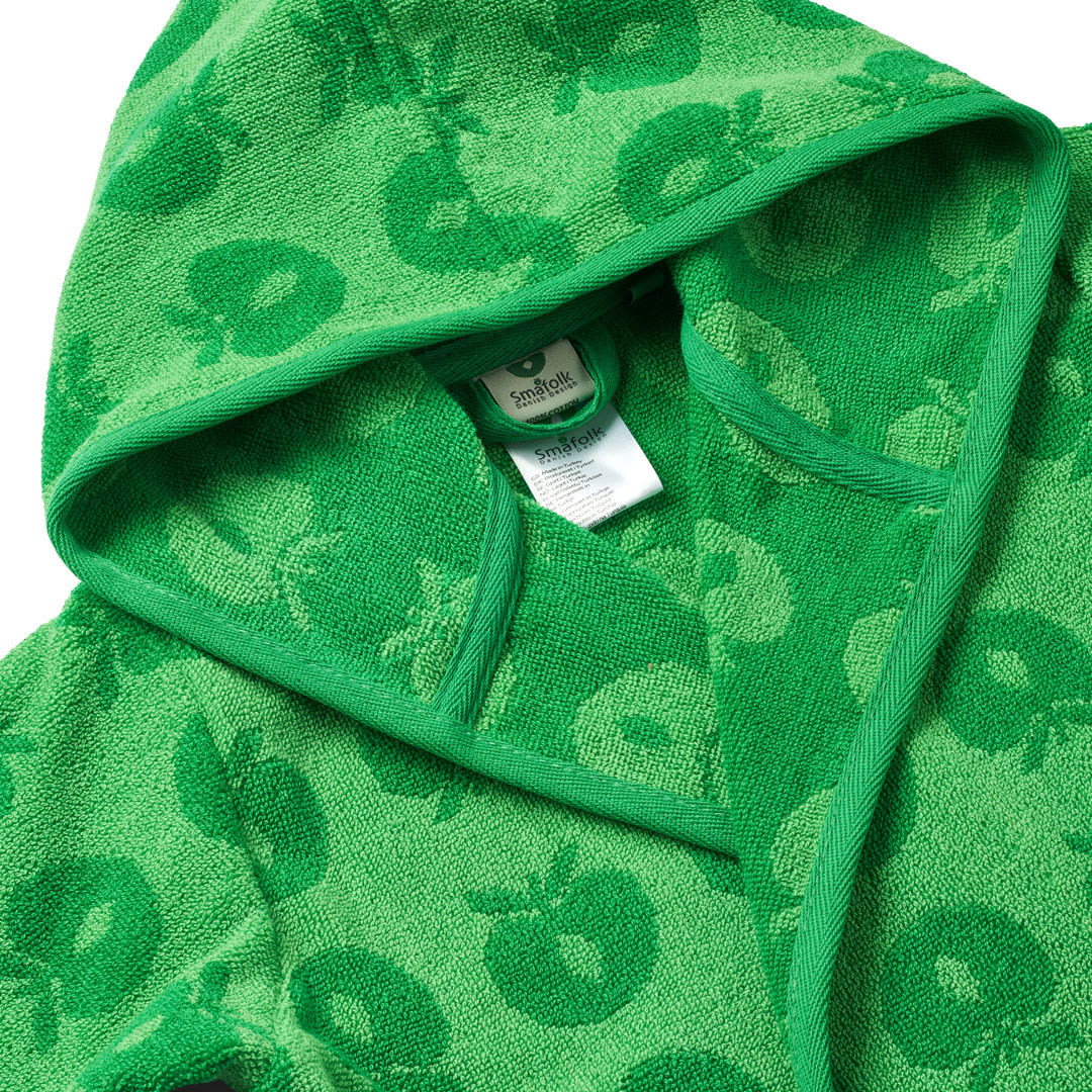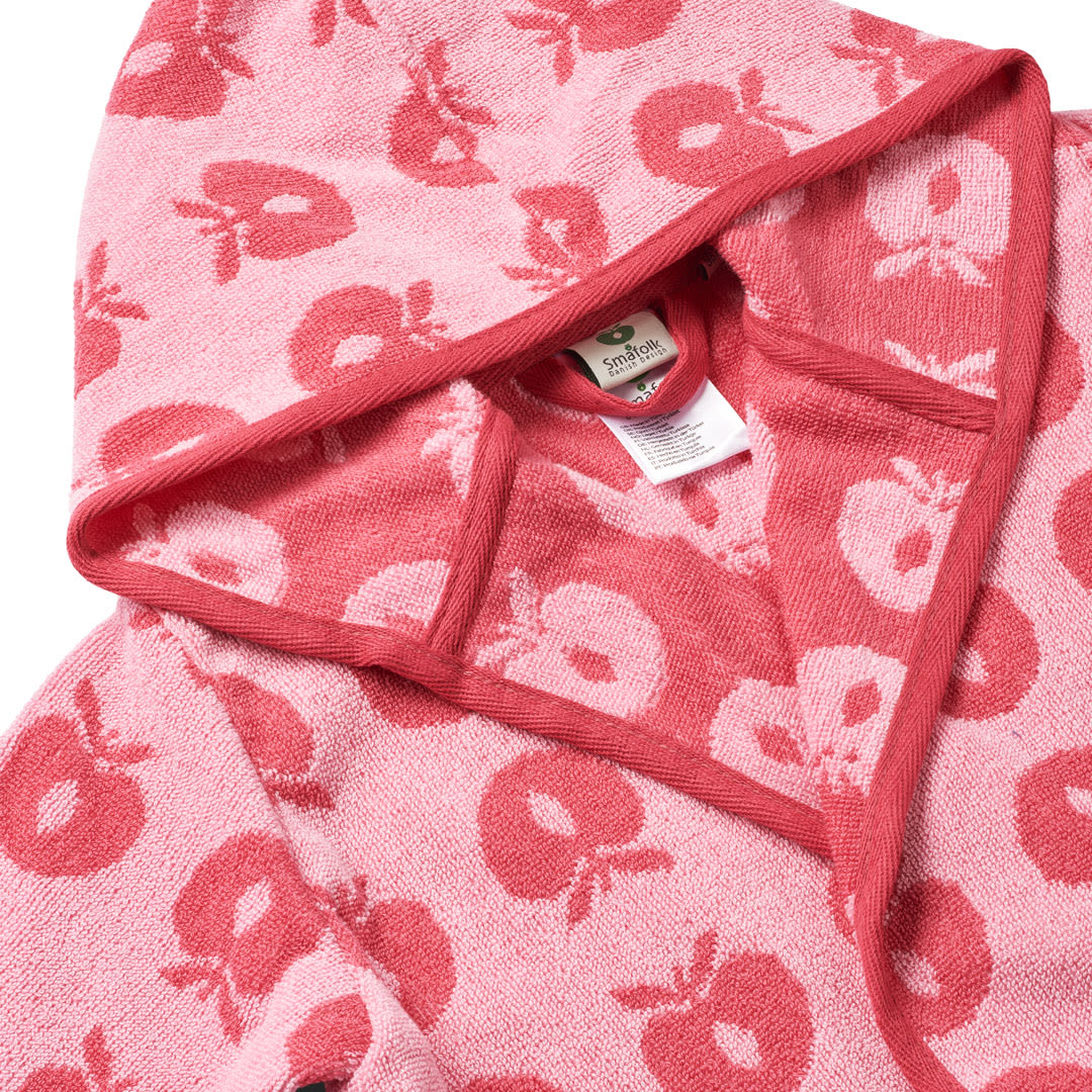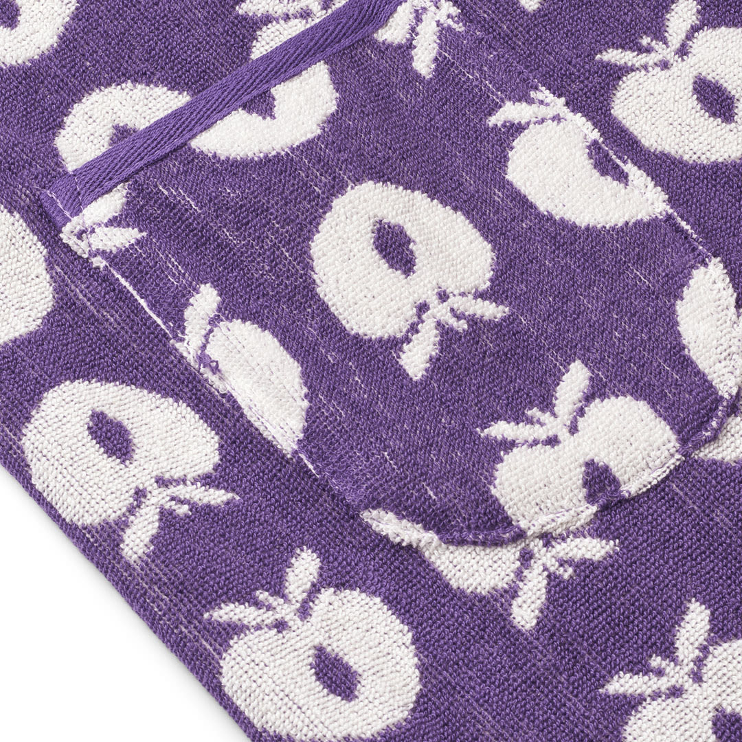 Bademantel mit Äpfeln. Köstlich weicher und warmer Bademantel in supersaugfähiger, dicker Frotteequalität. Der Bademantel hat zwei große Taschen, eine große Kapuze und einen starken Gürtel in der Taille.