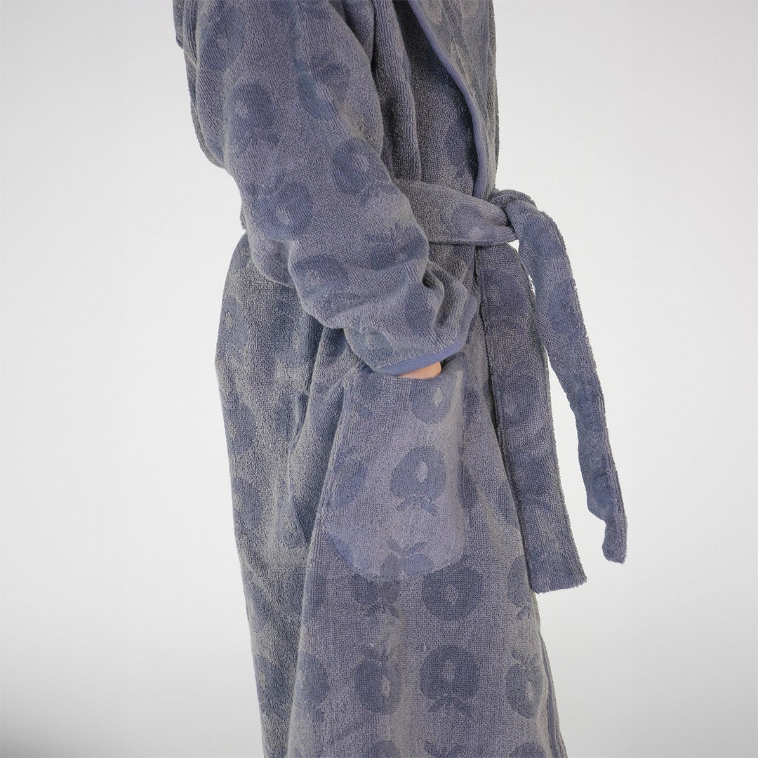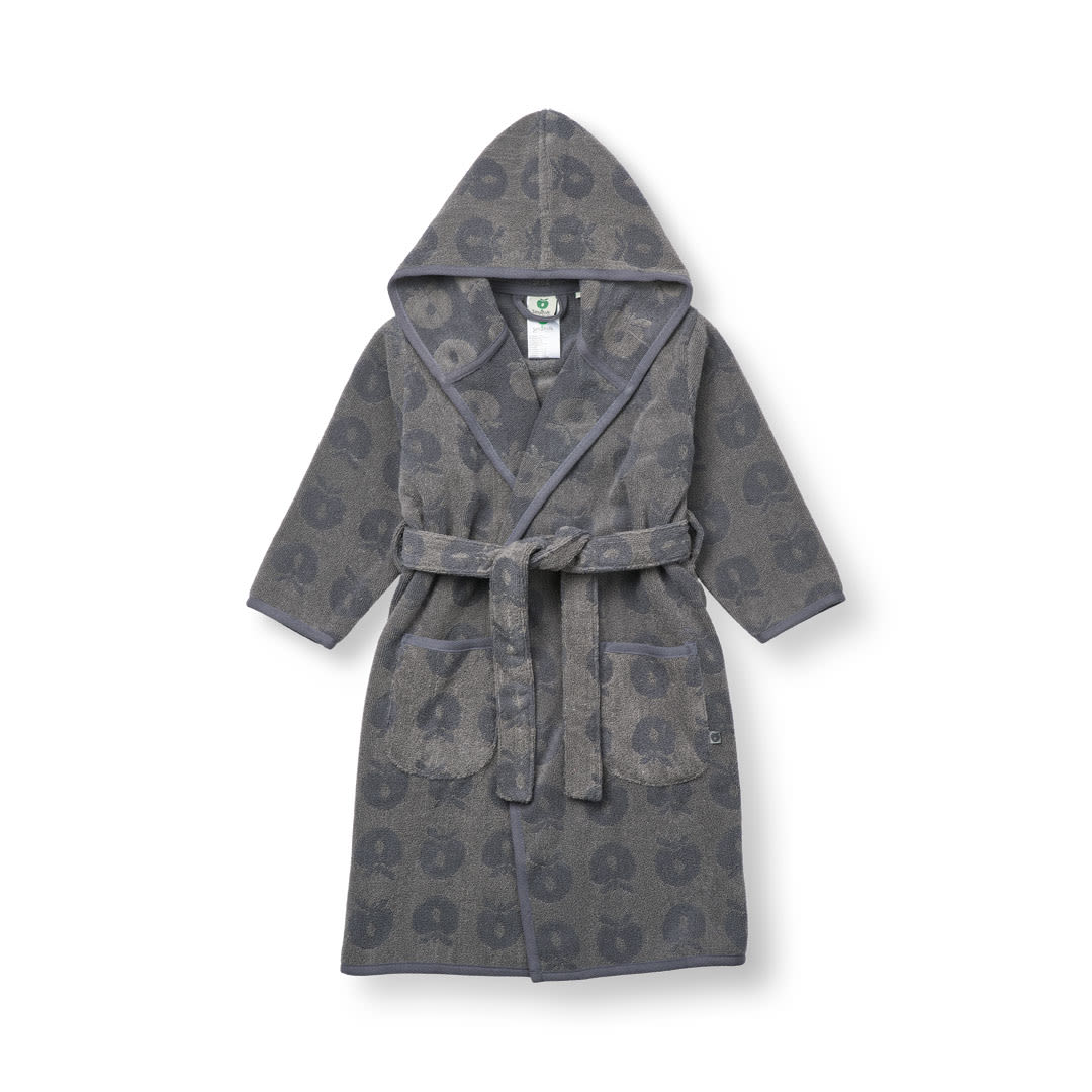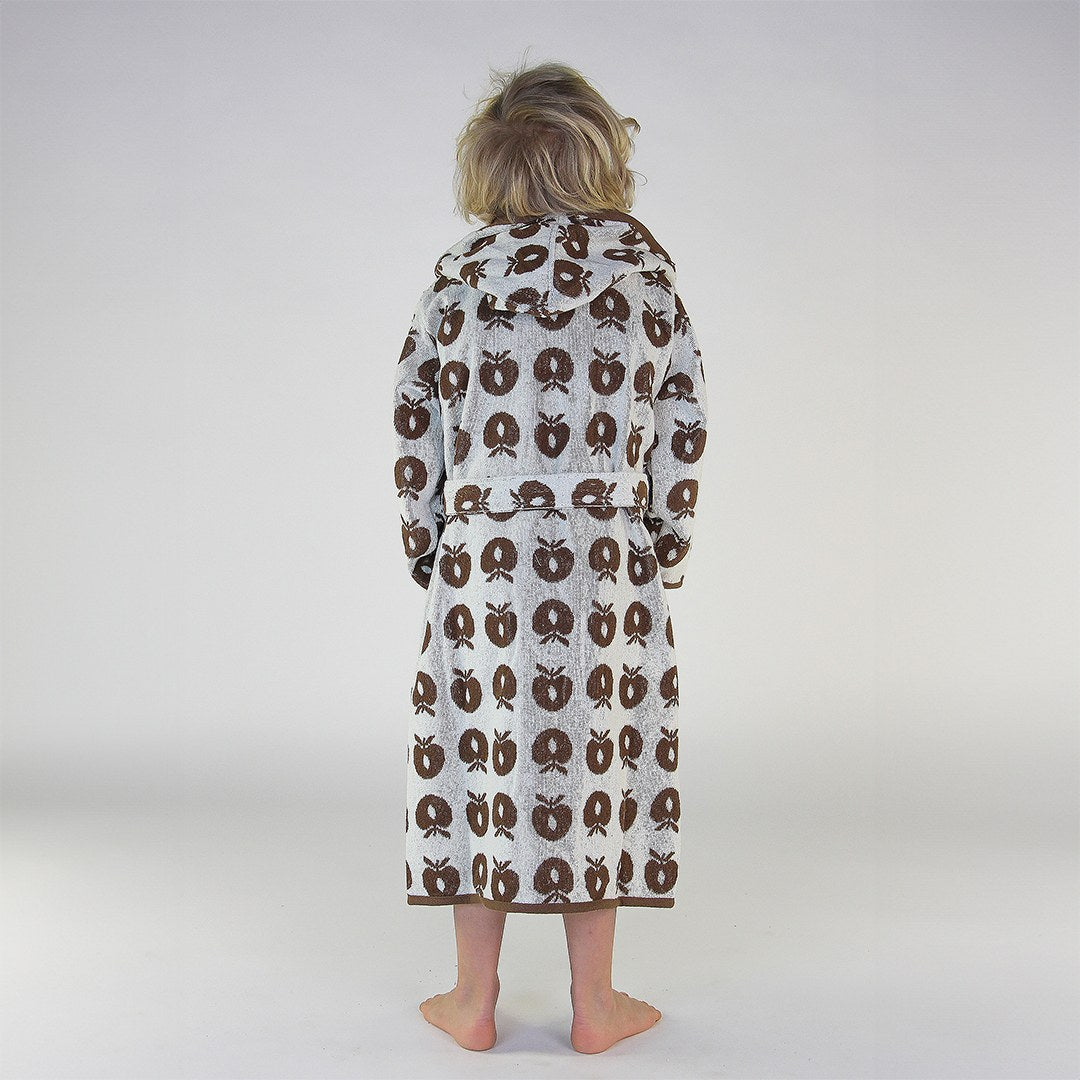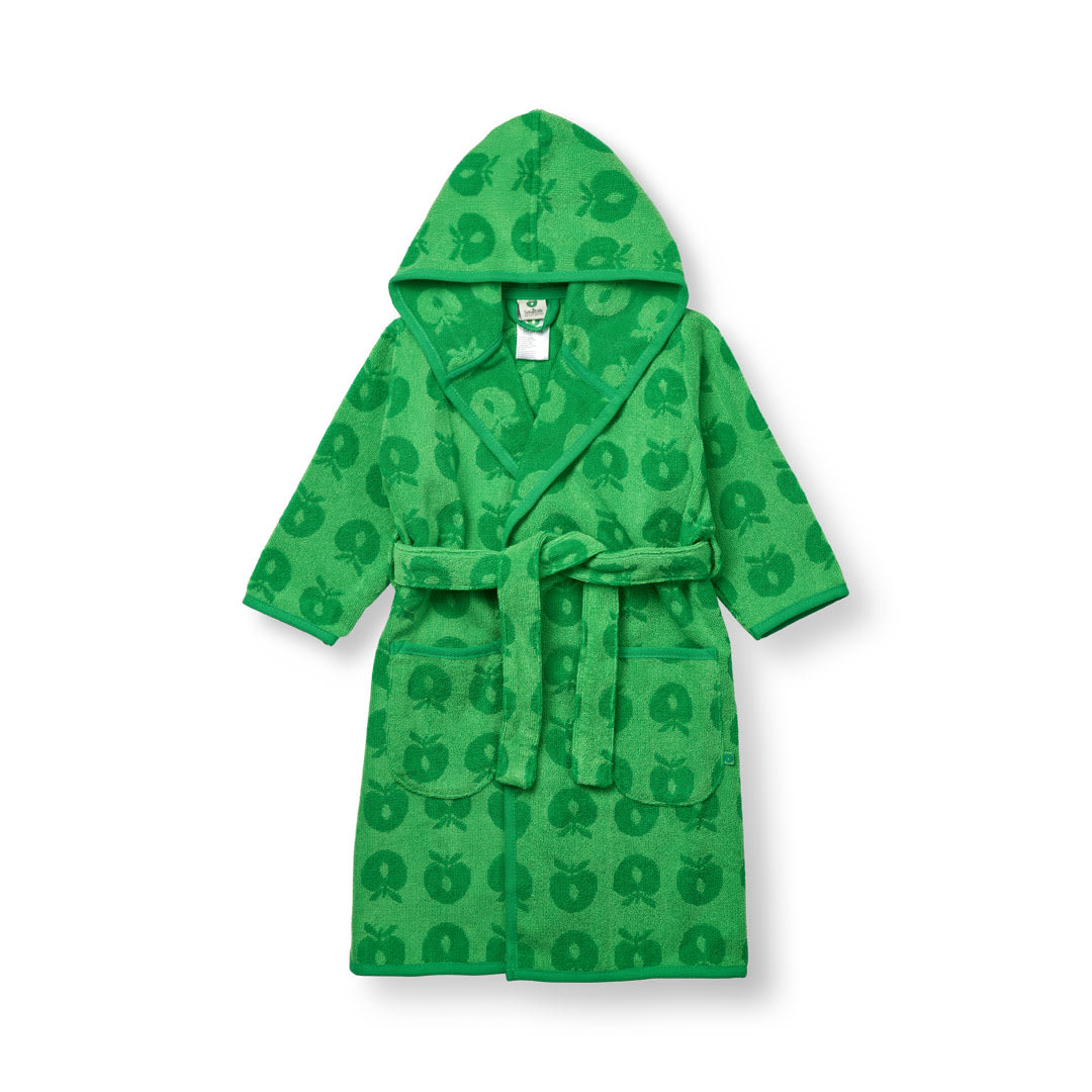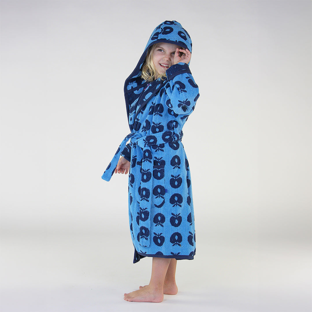 Bademantel mit Äpfeln. Köstlich weicher und warmer Bademantel in supersaugfähiger, dicker Frotteequalität. Der Bademantel hat zwei große Taschen, eine große Kapuze und einen starken Gürtel in der Taille.