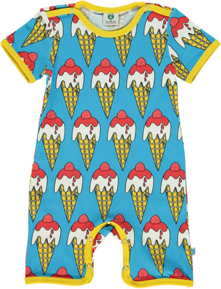 Sommeranzug mit kurzen Ärmeln und Beinen im Eis-Print. Der Anzug hat Druckknöpfe an den Schultern zum einfachen Wechseln und ist in Småfolks ganz eigenem, einzigartigen Retro-Stil gehalten.
