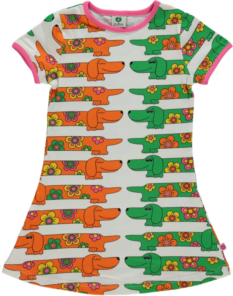 Kurzärmliges A-Kleid mit Dackel-Print in Småfolks ganz eigenem, einzigartigen Retro-Stil. Das Kleid wurde in Dänemark entworfen und aus bester 100 % Bio-Baumwolle und Elastan hergestellt, was das Kleid dehnbar und weich macht und gleichzeitig die Passform behält. Småfolks-Kleider sorgen für gute Bewegungsfreiheit und einen süßen Look. Die Kleider von Småfolk sind in wunderschönen leuchtenden Farben gehalten, in denen Ihr Kind spielen, wachsen und seine Fantasie erforschen kann, während es dem Kind ermöglicht, sich frei zu bewegen. Die Kleider von Småfolk sind ideal für Kindergarten, Schule und feinere Veranstaltungen.