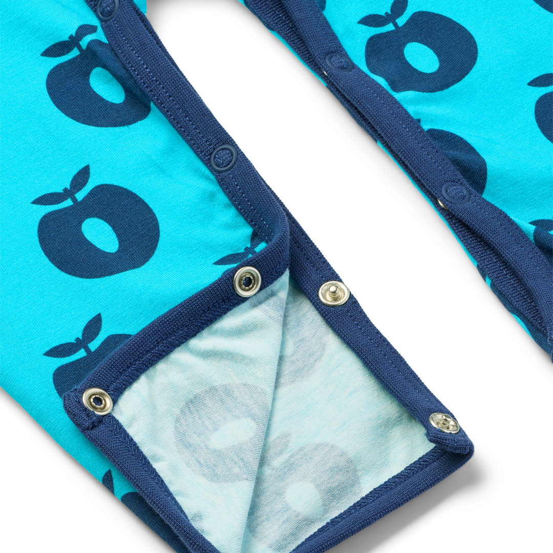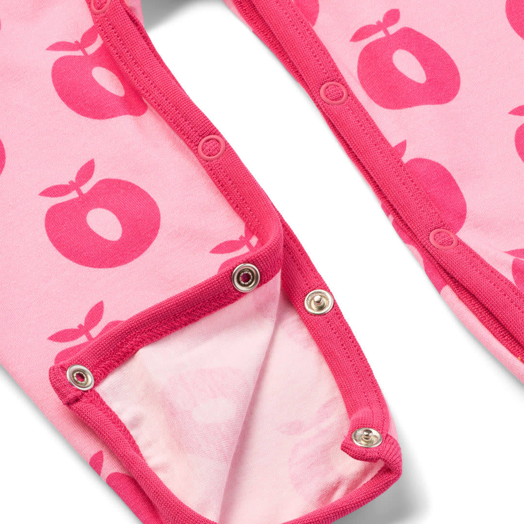 Einteiler für Babys mit Äpfeln, hergestellt aus dehnbarem Bio-Baumwolljersey. Dieser Overall ist nach OEKO-TEX Standard 100® zertifiziert, was bedeutet, dass der Anzug hergestellt und auf Schadstoffe getestet wurde, sodass Sie sich um die Haut und Gesundheit Ihres Kindes kümmern können.