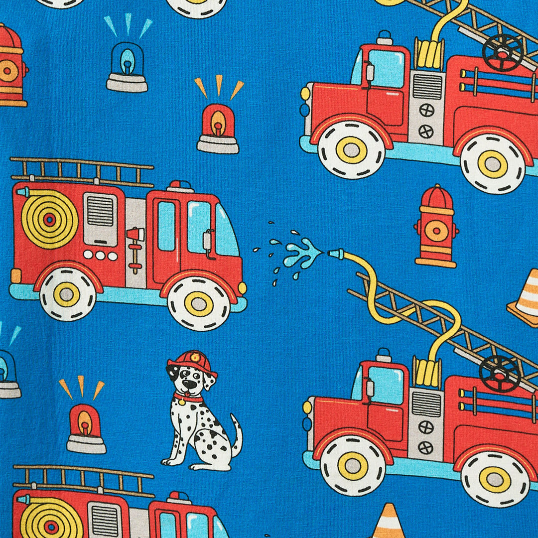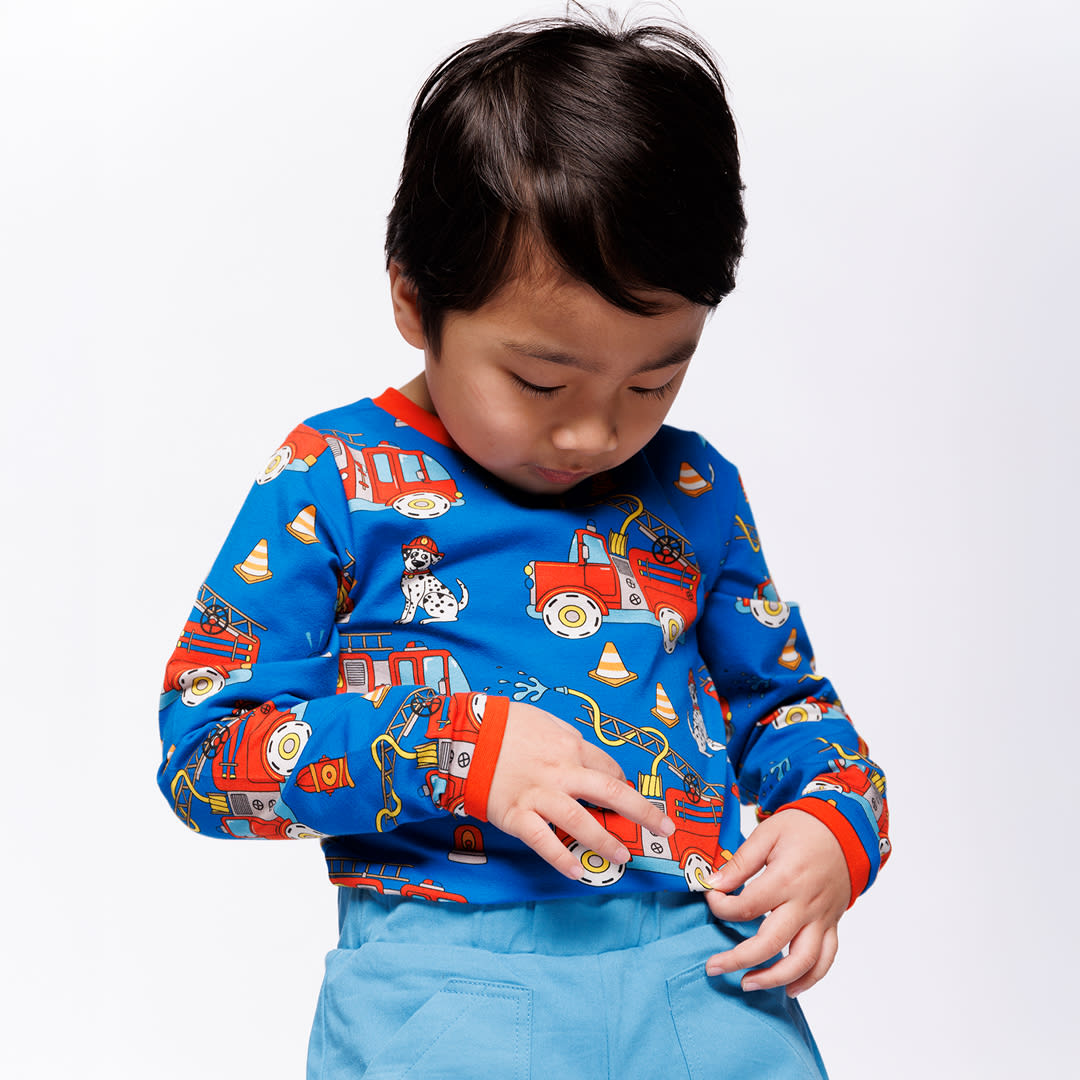 Langarmbluse mit Feuerwehrauto, hergestellt aus dehnbarem Bio-Baumwolljersey. Diese Bluse ist nach OEKO-TEX Standard 100® zertifiziert, was bedeutet, dass die Bluse hergestellt und auf Schadstoffe getestet wurde, sodass Sie sich um die Haut und Gesundheit Ihres Kindes kümmern können.