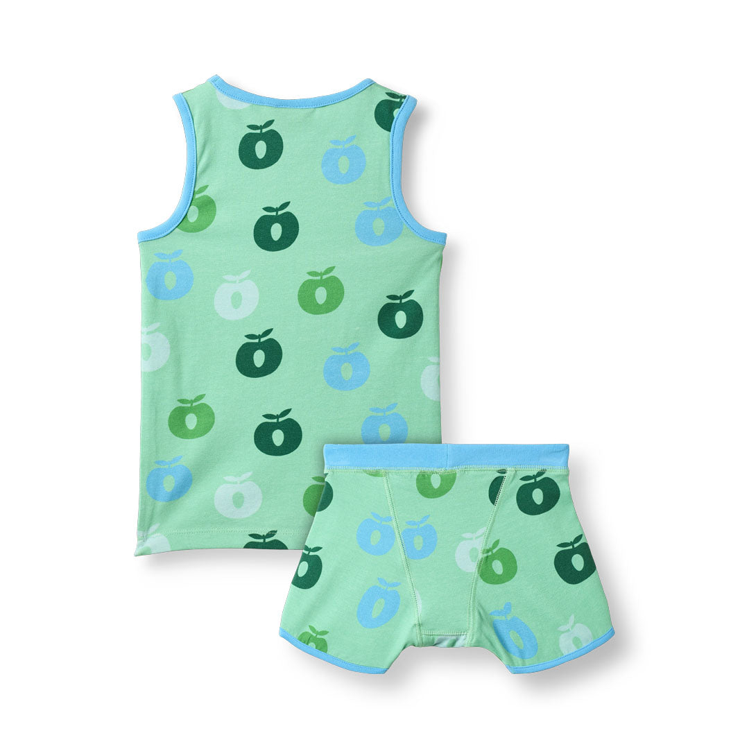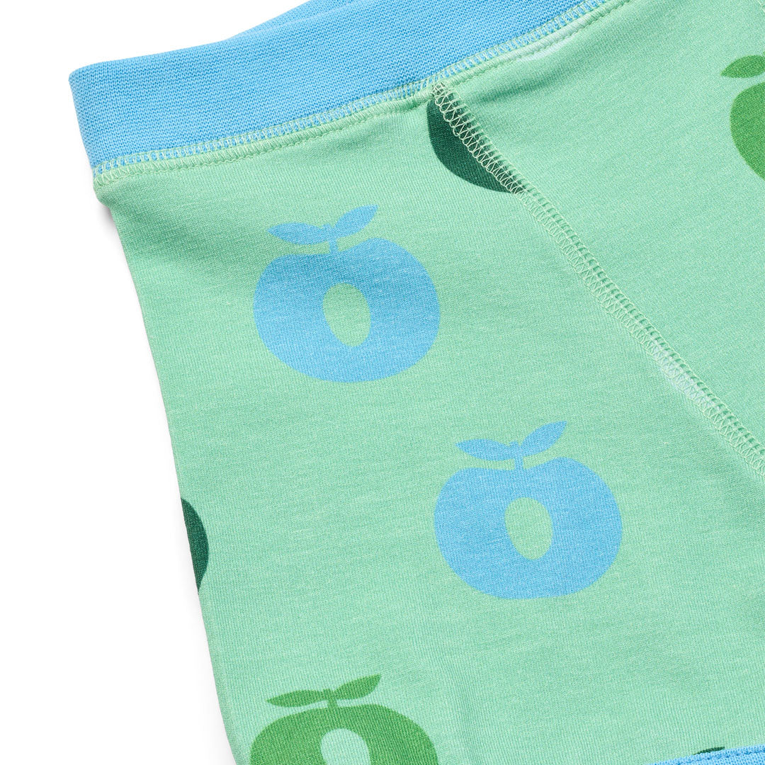 Unterwäsche-Set mit Äpfeln, hergestellt aus organischem und dehnbarem Baumwolljersey. Dieses Set ist nach OEKO-TEX Standard 100® zertifiziert, was bedeutet, dass die Unterwäsche hergestellt und auf Schadstoffe getestet wurde, sodass Sie sich um die Haut und Gesundheit Ihres Kindes kümmern können.