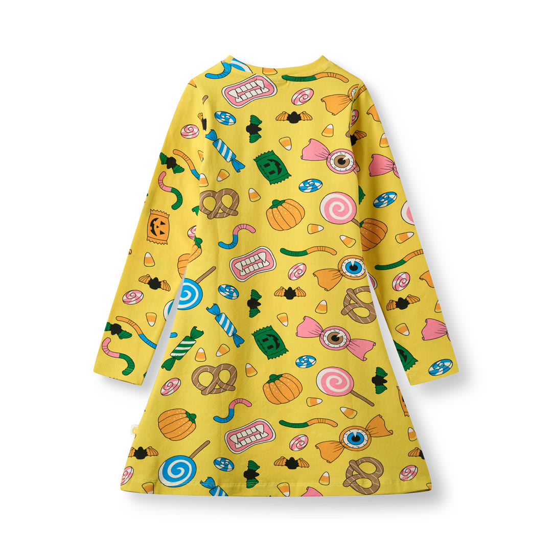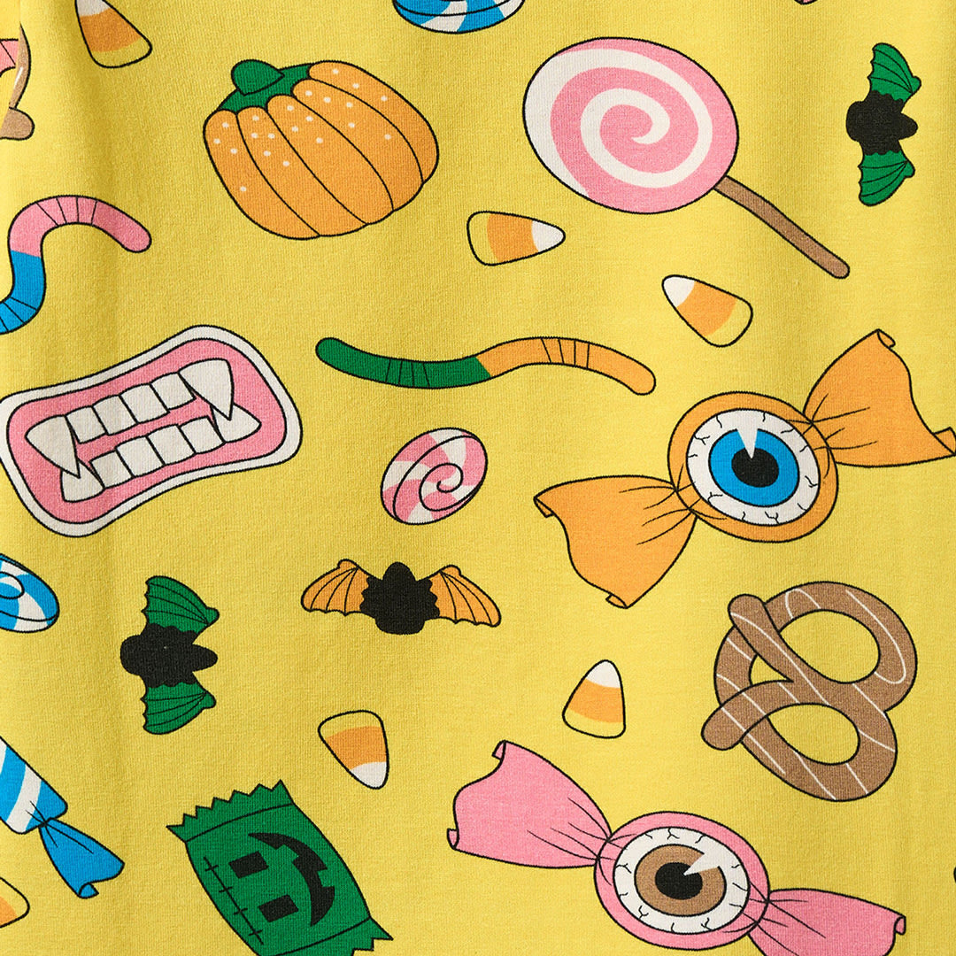 Langärmliges Kleid mit Halloween-Süßigkeiten, hergestellt aus dehnbarem Bio-Baumwolljersey. Dieses Kleid ist nach OEKO-TEX Standard 100® zertifiziert, was bedeutet, dass das Kleid hergestellt und auf Schadstoffe getestet wurde, sodass Sie sich um die Haut und Gesundheit Ihres Kindes kümmern können.