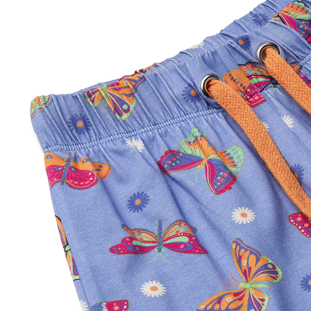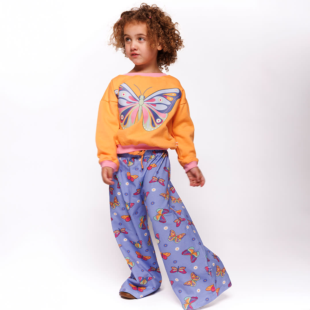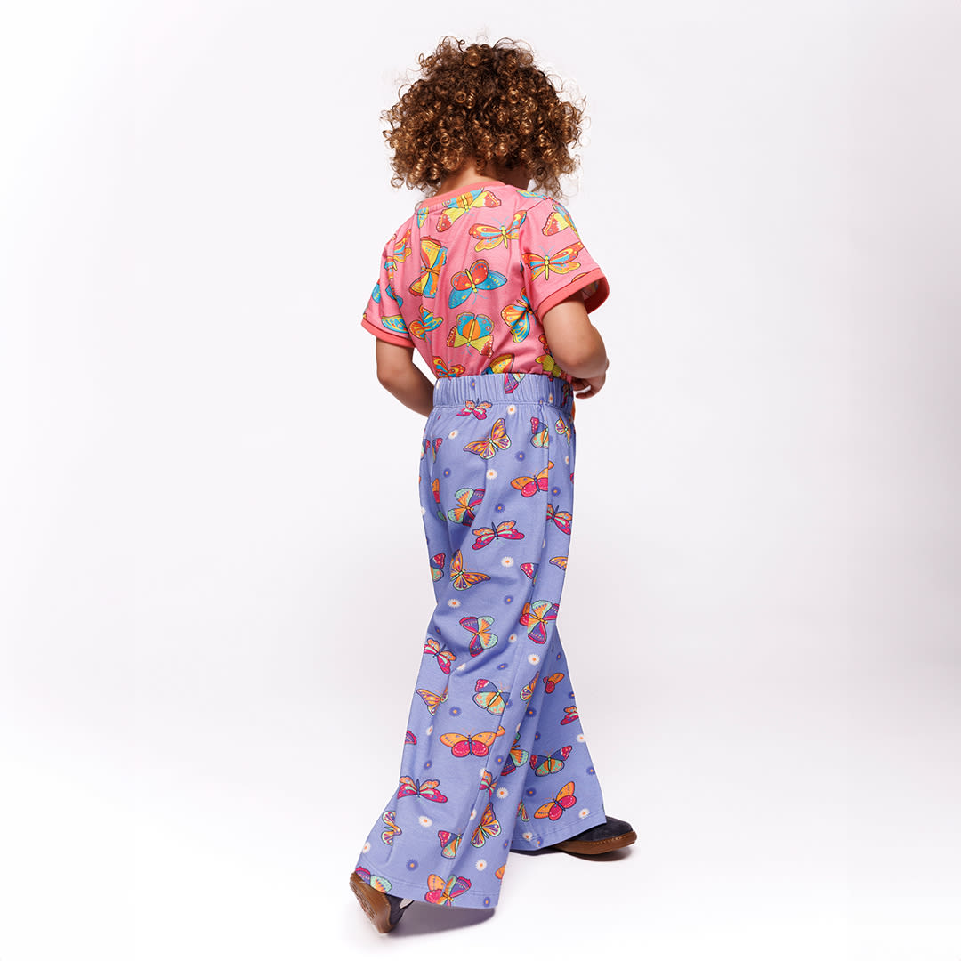 Weite Hose mit bunten Schmetterlingen, hergestellt aus einem dehnbaren Bio-Baumwolljersey. Diese Hose ist nach OEKO-TEX Standard 100® zertifiziert, was bedeutet, dass die Hose auf Schadstoffe hergestellt und getestet wurde, sodass Sie sich um die Haut und Gesundheit Ihres Kindes kümmern können.