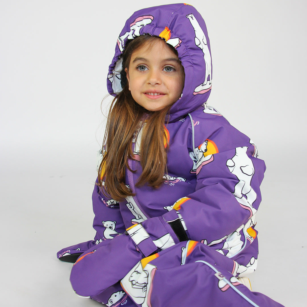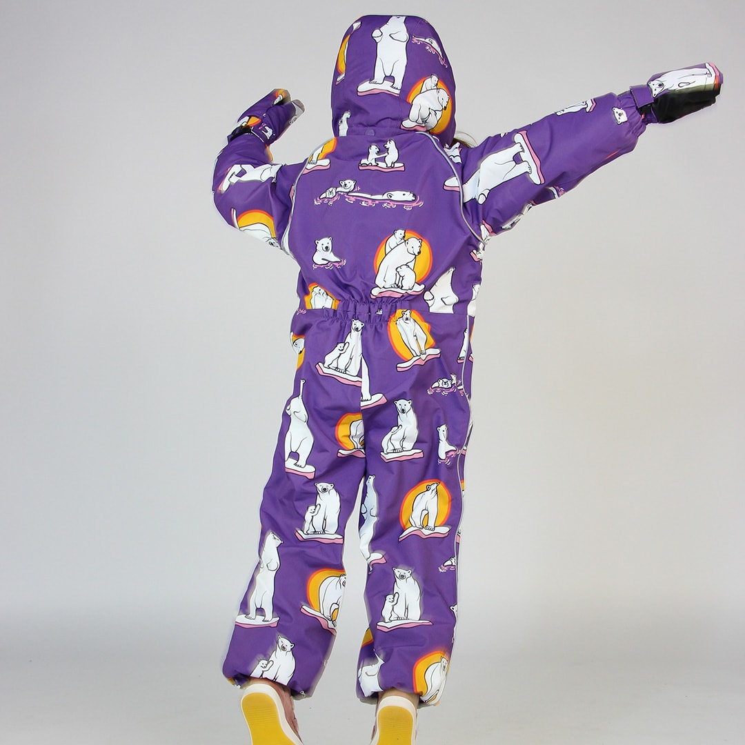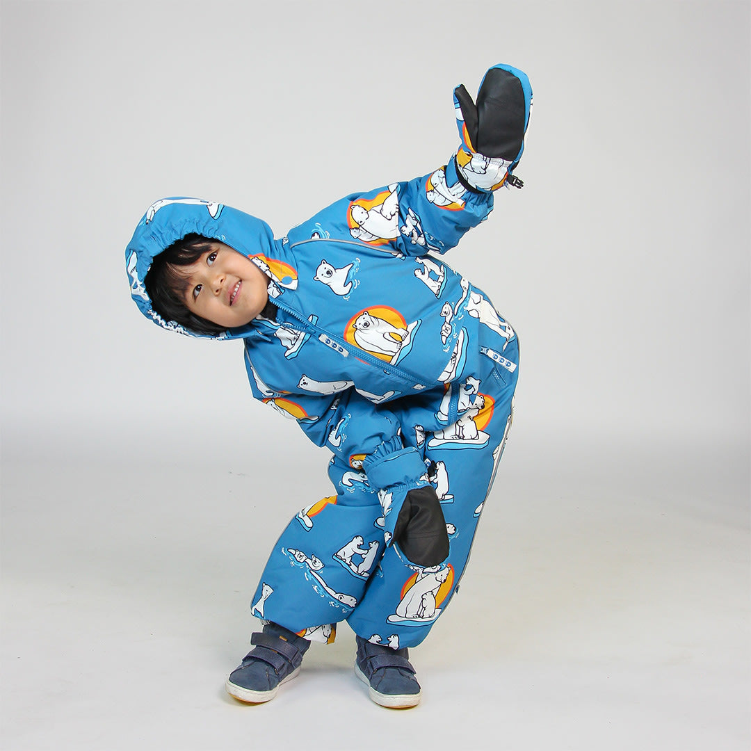 Der Anzug hat abnehmbare Gummibänder an den Füßen und reflektierende Paspeln an der Schulter und an den Hosenbeinen. Der Anzug verfügt über eine DuPont™ Sorona®-Isolierung, die das Kind warm und trocken hält. Der Anzug ist mit BIONIC-FINISH® ECO behandelt, einer biologisch abbaubaren Oberflächenbehandlung. Die Behandlung verhindert, dass Feuchtigkeit in den Stoff eindringt, während überschüssige Körperfeuchtigkeit automatisch an die Oberfläche des Materials transportiert wird, wo sie verdunstet. Die Behandlung ist frei von fluoridhaltigen Substanzen. Der Fluganzug ist schnee- und wasserabweisend, schmutzabweisend und winddicht.