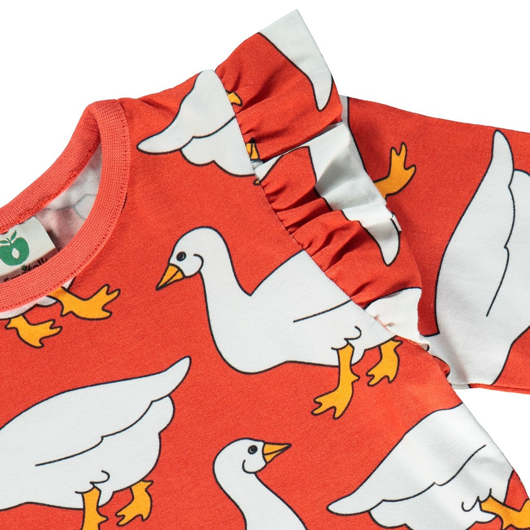 Dieses einzelne Motiv mit niedlichen Gänsen, die in einer Reihe auf einem warmen roten Hintergrund watscheln, kann das ganze Jahr über als Statement-Druck verwendet oder mit anderen Drucken kombiniert werden. Bei der Gestaltung der Drucke von Småfolk liegt der Schwerpunkt auf fröhlichen Farben, Details und Geschichten. Unsere Kleider sind eine großartige Möglichkeit, der Garderobe Ihres Kindes Persönlichkeit zu verleihen und gleichzeitig dafür zu sorgen, dass sich Ihr Kind den ganzen Tag wohlfühlt.