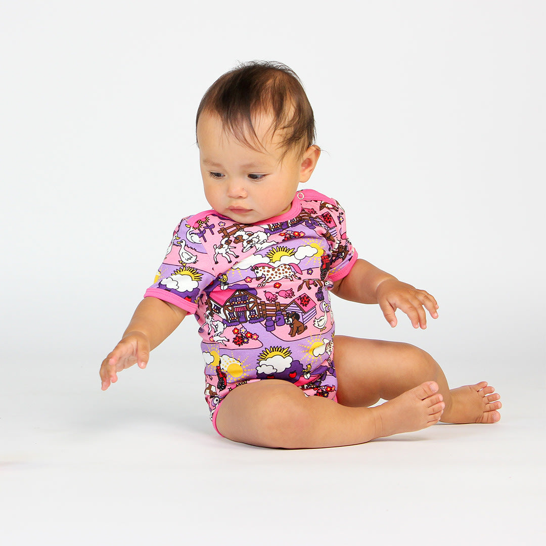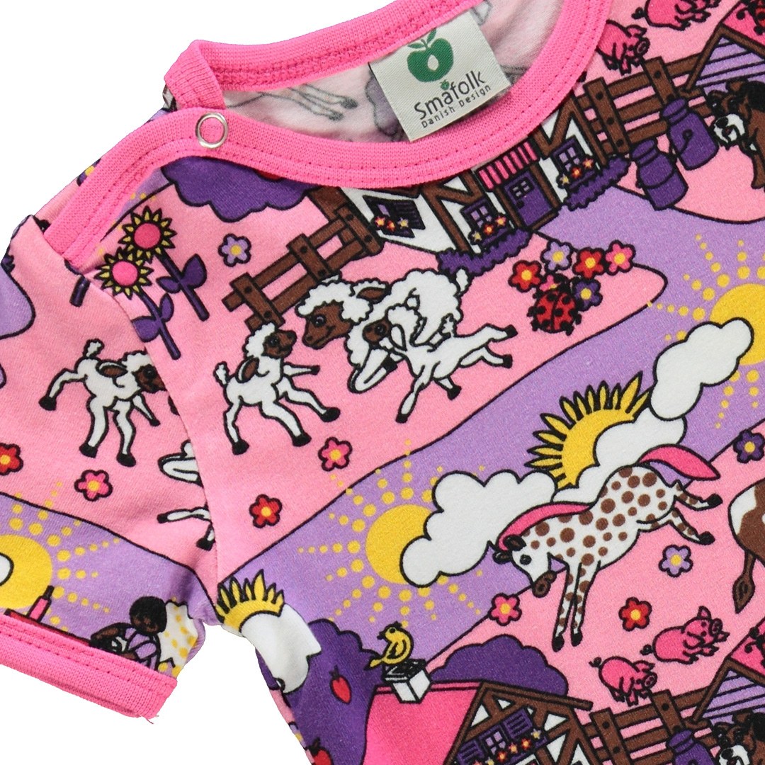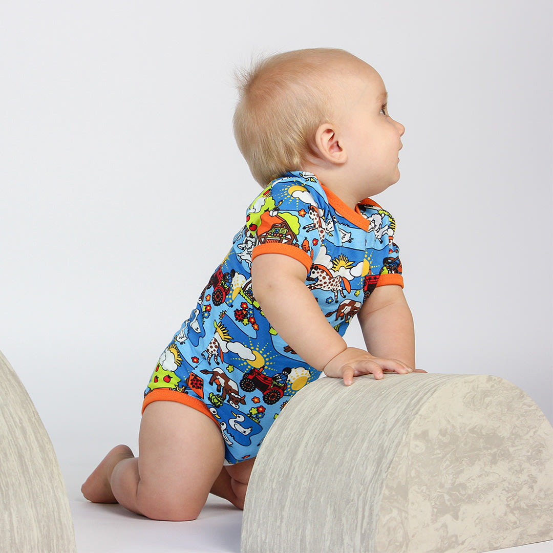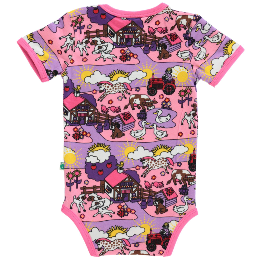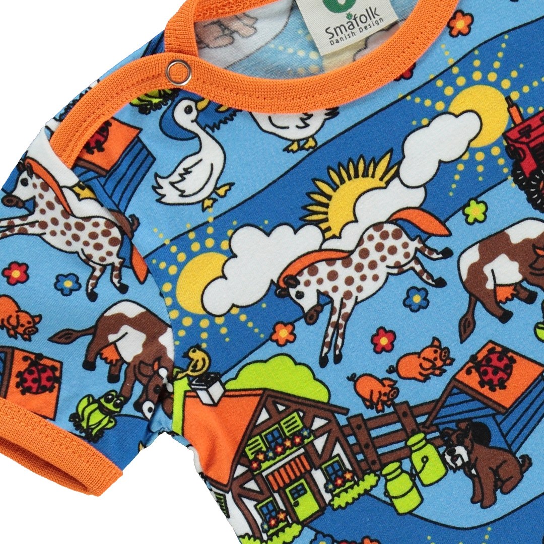 Kurzärmliger Body mit Bauernhof, hergestellt aus organischem und dehnbarem Baumwolljersey. Dieser body ist nach OEKO-TEX Standard 100® zertifiziert, was bedeutet, dass dieser Body hergestellt und auf schädliche Chemikalien getestet wurde, um die Haut und Gesundheit Ihres Kindes zu schützen. Dieser body ist mit Druckknöpfen an den Schultern und am Saum ausgestattet, um das An- und Ausziehen zu erleichtern. Der Körper von Småfolk werden in Dänemark entworfen und halten unzähligen Abenteuern und endlosen Spielstunden stand und behalten auch nach mehrmaligem Gebrauch ihre Form und Farbe.