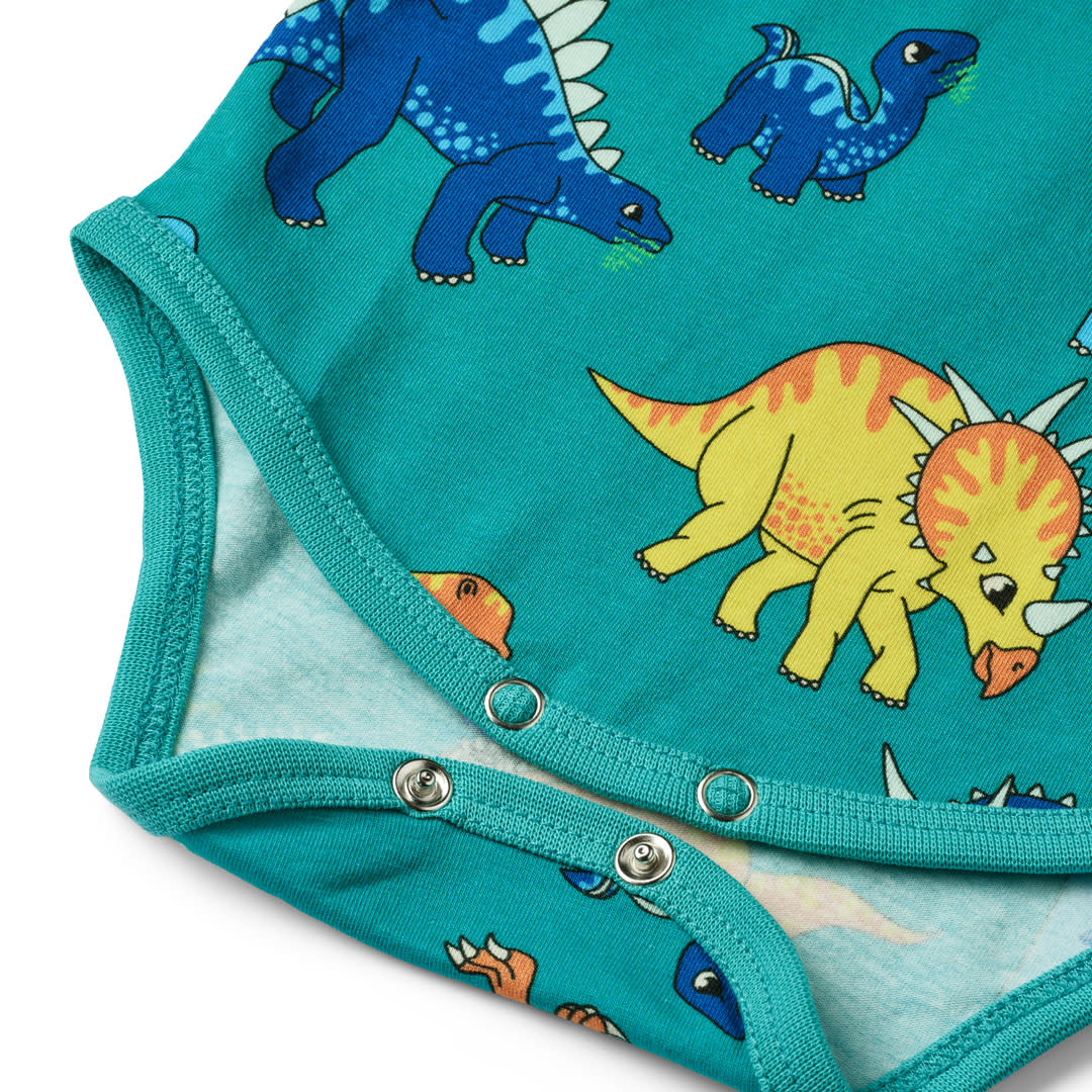 Kurzärmliger Body mit Dinosauriern, hergestellt aus organischem und dehnbarem Baumwolljersey. Dieser body ist nach OEKO-TEX Standard 100® zertifiziert, was bedeutet, dass dieser Body hergestellt und auf schädliche Chemikalien getestet wurde, um die Haut und Gesundheit Ihres Kindes zu schützen. Dieser body ist mit Druckknöpfen an den Schultern und am Saum ausgestattet, um das An- und Ausziehen zu erleichtern. Der Körper von Småfolk werden in Dänemark entworfen und halten unzähligen Abenteuern und endlosen Spielstunden stand und behalten auch nach mehrmaligem Gebrauch ihre Form und Farbe.