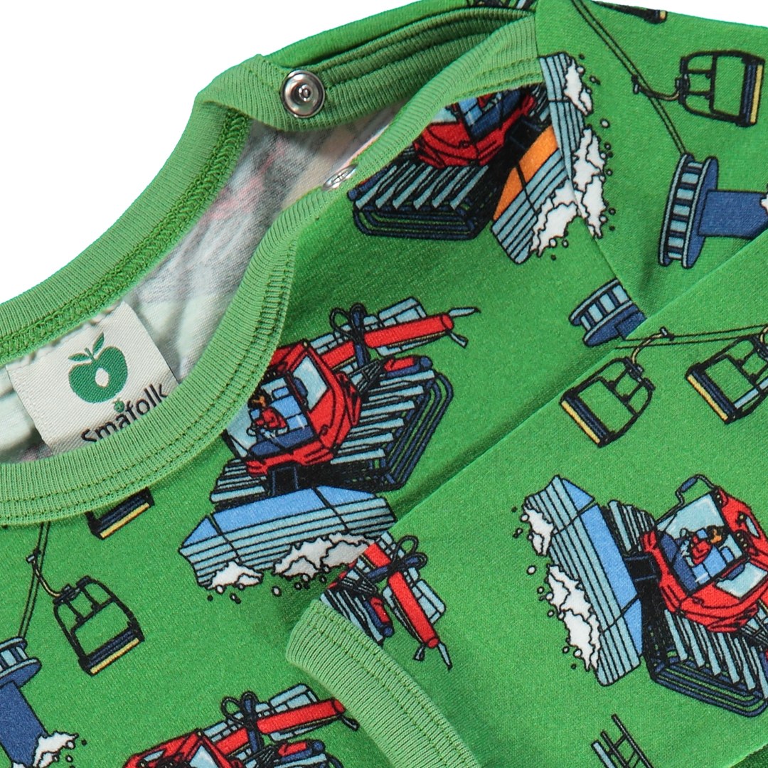Die Pistenraupen sind die wichtigsten Maschinen auf den verschneiten Hügeln. Das Wildschwein fährt mit der Pistenraupe den Hügel hinauf und hinunter, gleicht alle großen Schneehaufen aus und bereitet sich auf einen weiteren Tag im Schnee vor. Bei der Gestaltung der Drucke von Småfolk liegt der Schwerpunkt auf fröhlichen Farben, Details und Geschichten. Unsere Bodys sind eine großartige Möglichkeit, der Garderobe Ihres Kindes Persönlichkeit zu verleihen und gleichzeitig dafür zu sorgen, dass sich Ihr Kind den ganzen Tag wohlfühlt.