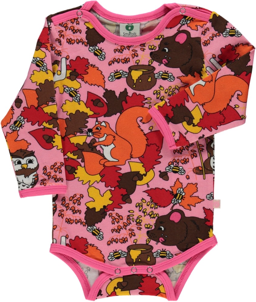Langärmliger Baby Body mit Tiere des Waldes, hergestellt aus organischem und dehnbarem Baumwolljersey. Dieser body ist nach OEKO-TEX Standard 100® zertifiziert, was bedeutet, dass dieser Body hergestellt und auf schädliche Chemikalien getestet wurde, um die Haut und Gesundheit Ihres Kindes zu schützen. Dieser body ist mit Druckknöpfen an den Schultern und am Saum ausgestattet, um das An- und Ausziehen zu erleichtern. Der Körper von Småfolk werden in Dänemark entworfen und halten unzähligen Abenteuern und endlosen Spielstunden stand und behalten auch nach mehrmaligem Gebrauch ihre Form und Farbe.