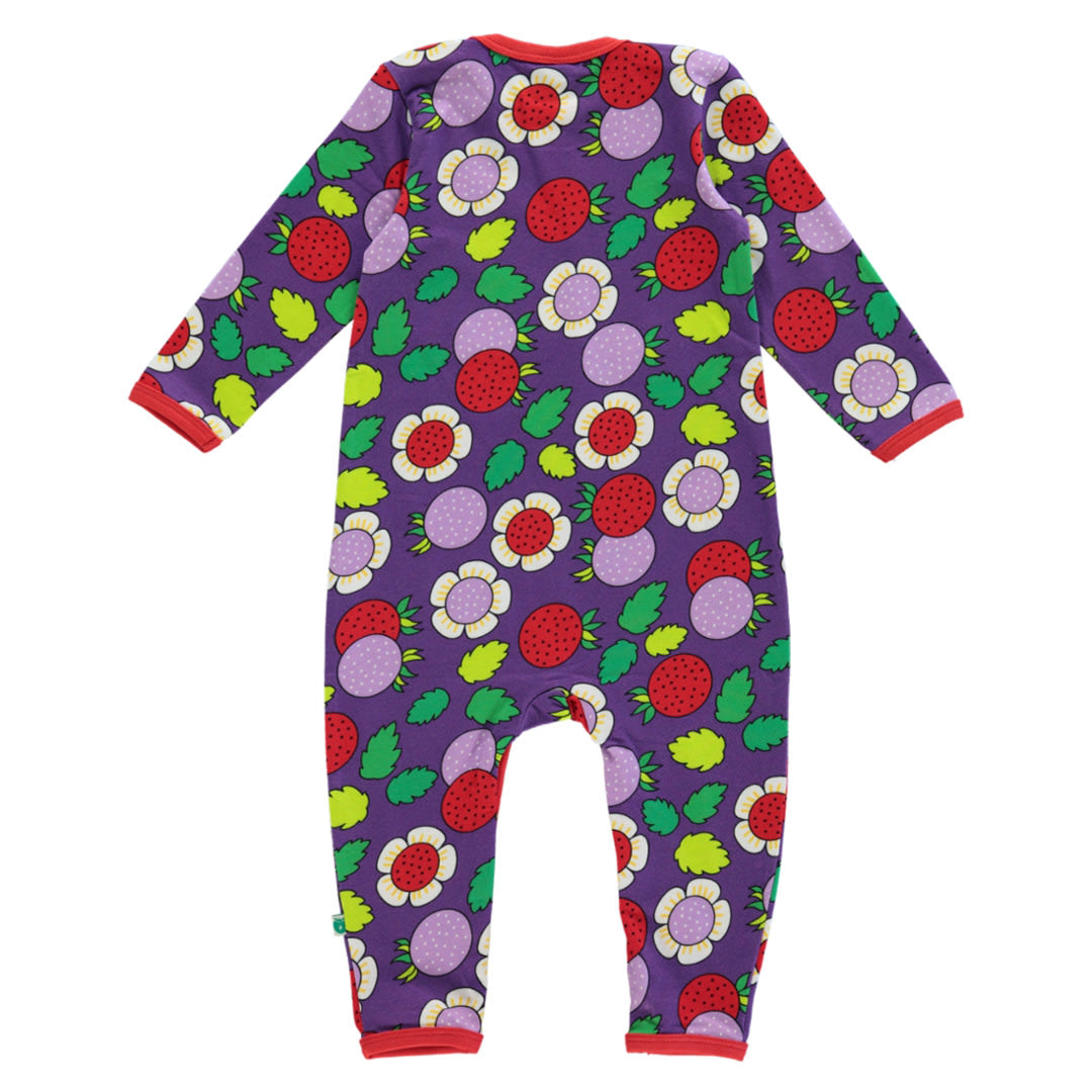 Strampler mit Erdbeerdruck, hergestellt aus organischem und dehnbarem Baumwolljersey. Dieser Strampler ist nach OEKO-TEX Standard 100® zertifiziert, was bedeutet, dass der Strampler hergestellt und auf Schadstoffe getestet wurde, sodass Sie sich um die Haut und Gesundheit Ihres Kindes kümmern können.