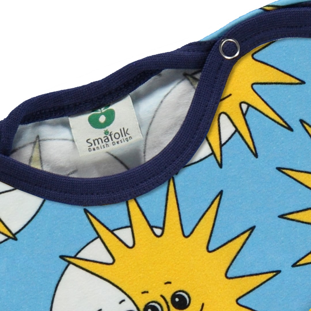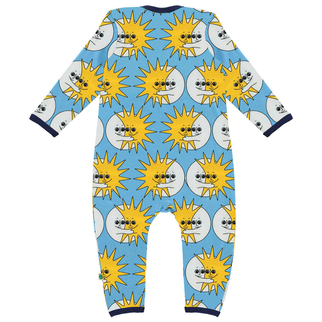 Strampler mit Sonnen und Monden, hergestellt aus organischem und dehnbarem Baumwolljersey. Dieser Strampler ist nach OEKO-TEX Standard 100® zertifiziert, was bedeutet, dass der Strampler hergestellt und auf Schadstoffe getestet wurde, sodass Sie sich um die Haut und Gesundheit Ihres Kindes kümmern können.