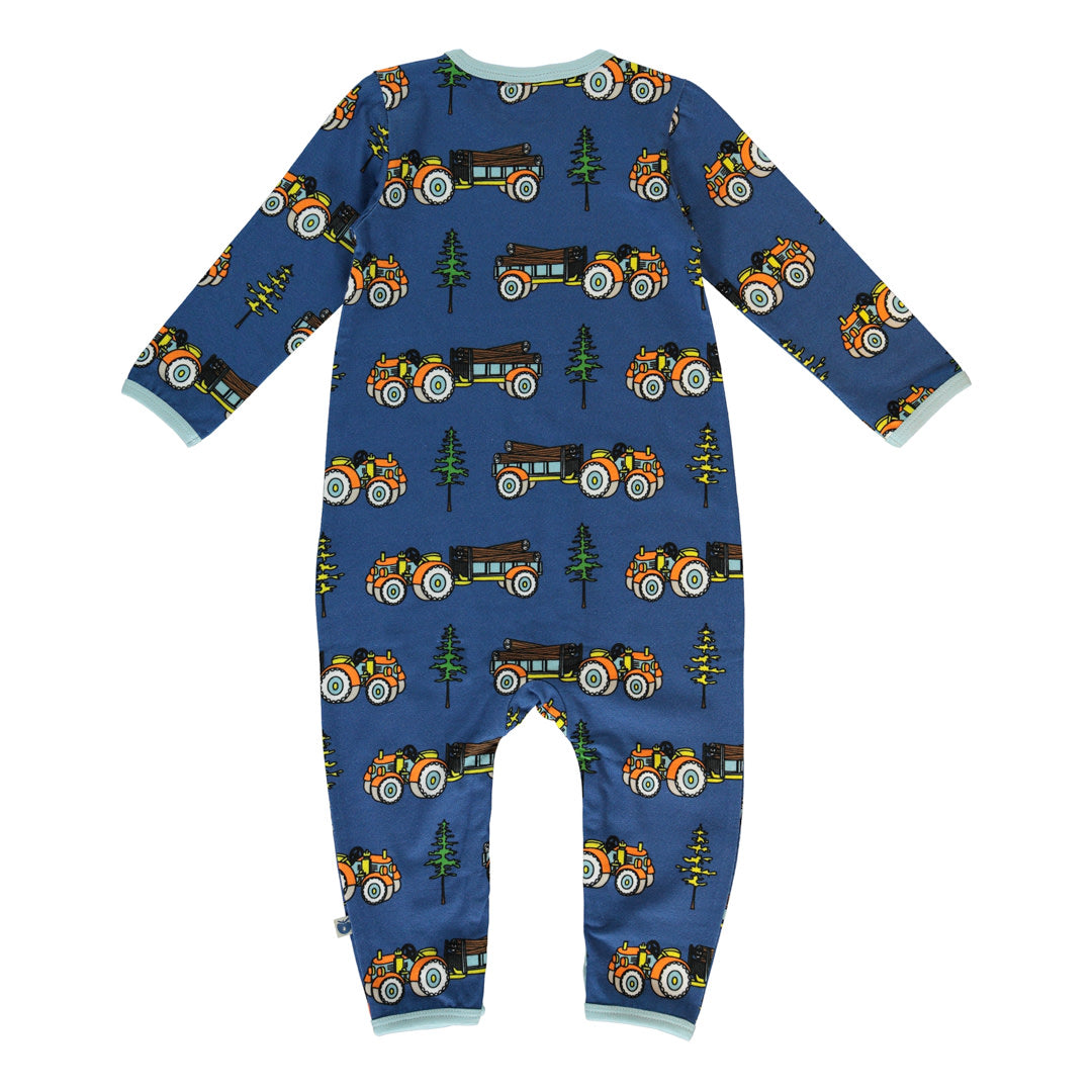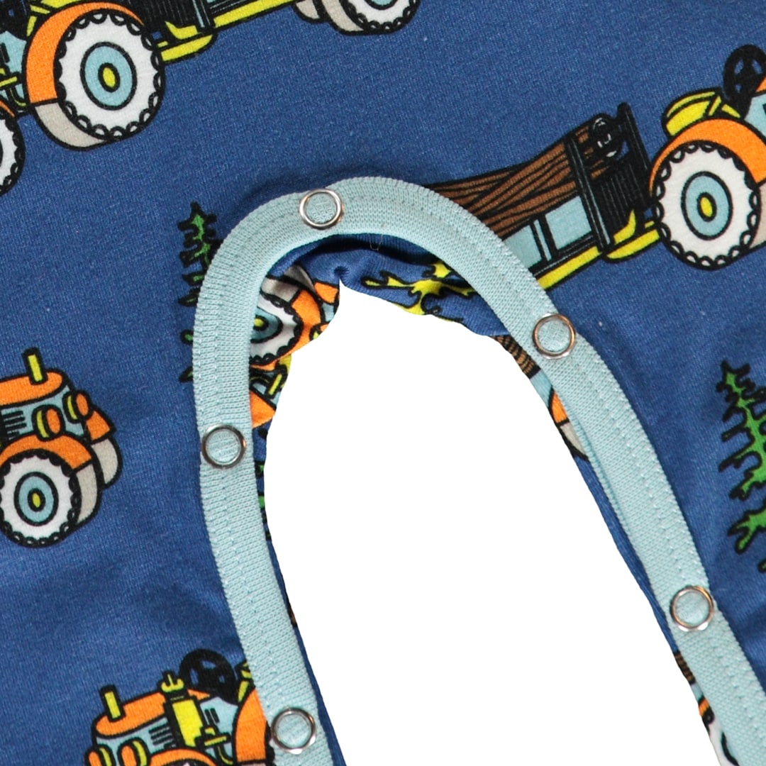 Einteiler für Babys mit Traktor, hergestellt aus dehnbarem Bio-Baumwolljersey. Dieser Overall ist nach OEKO-TEX Standard 100® zertifiziert, was bedeutet, dass der Anzug hergestellt und auf Schadstoffe getestet wurde, sodass Sie sich um die Haut und Gesundheit Ihres Kindes kümmern können.