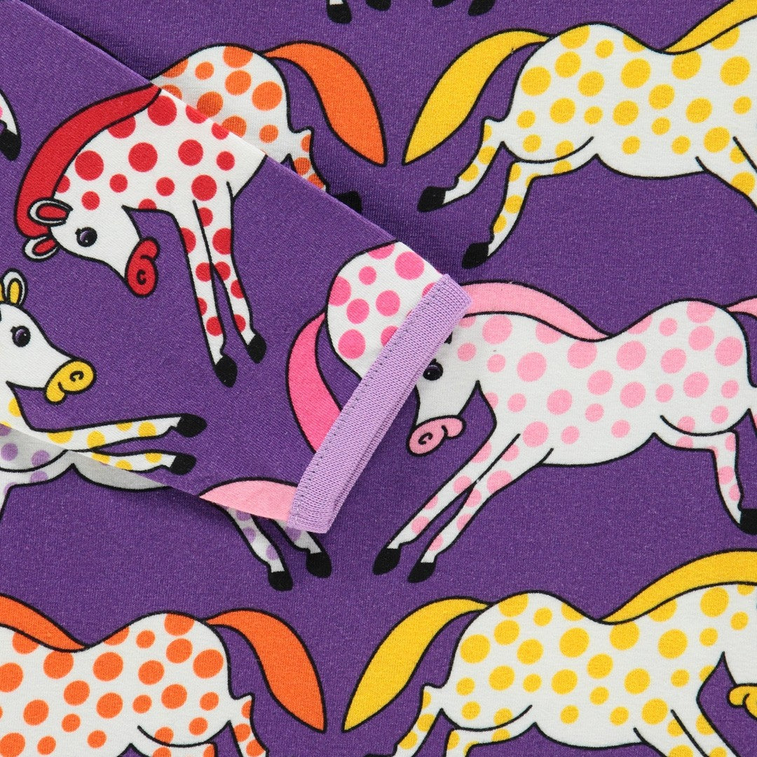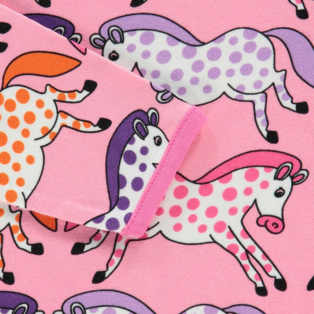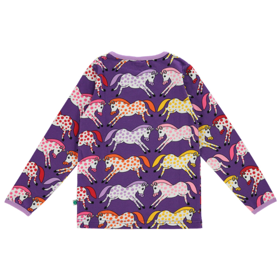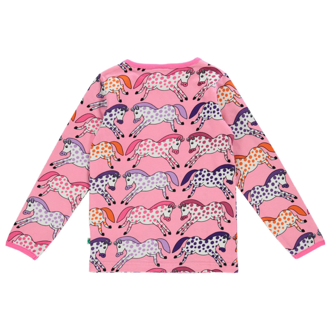 Langarmshirt mit Pferde, hergestellt aus organischem und dehnbarem Baumwolljersey. Dieses Top ist nach OEKO-TEX Standard 100® zertifiziert, was bedeutet, dass das Top hergestellt und auf schädliche Chemikalien getestet wurde, um die Haut und Gesundheit Ihres Kindes zu schützen.