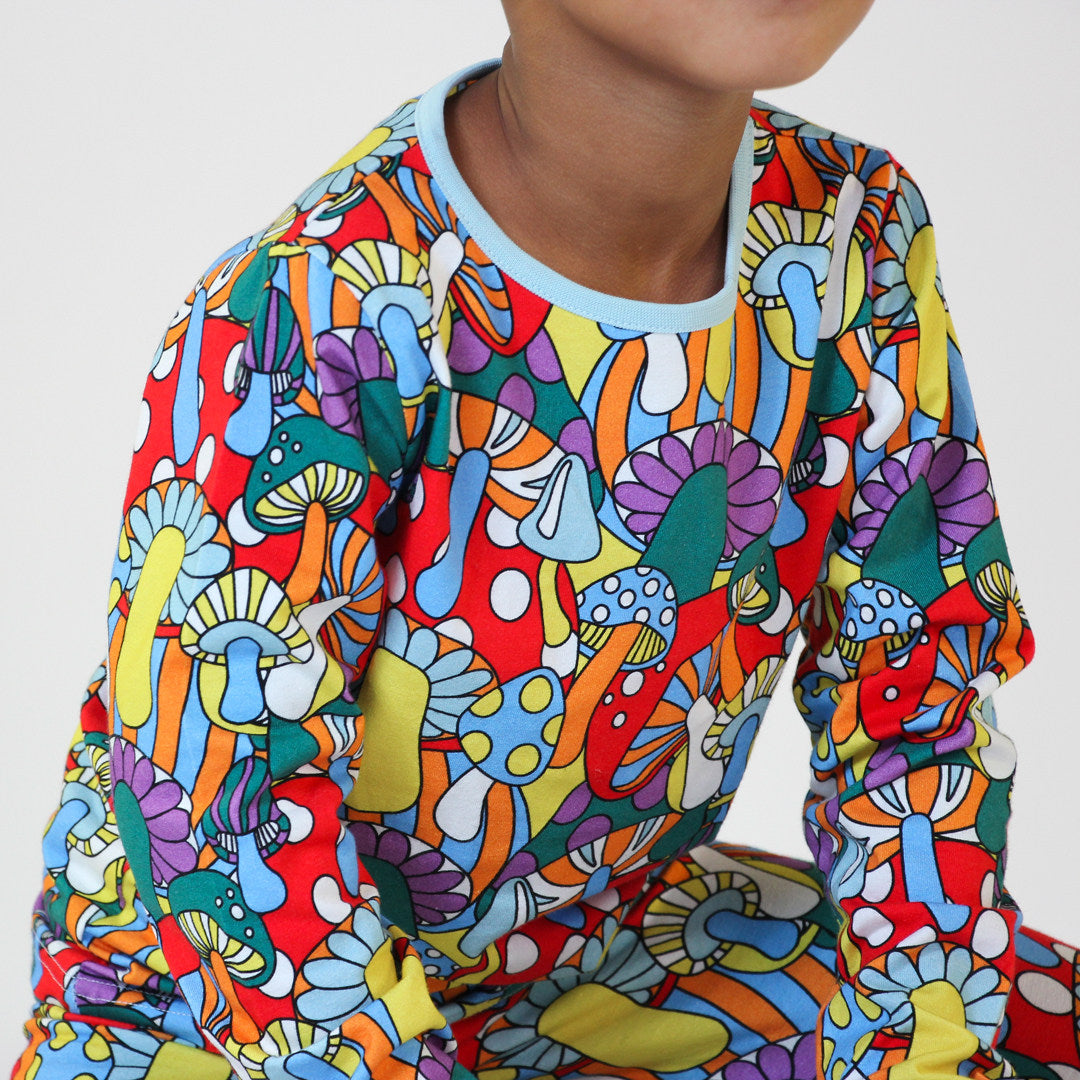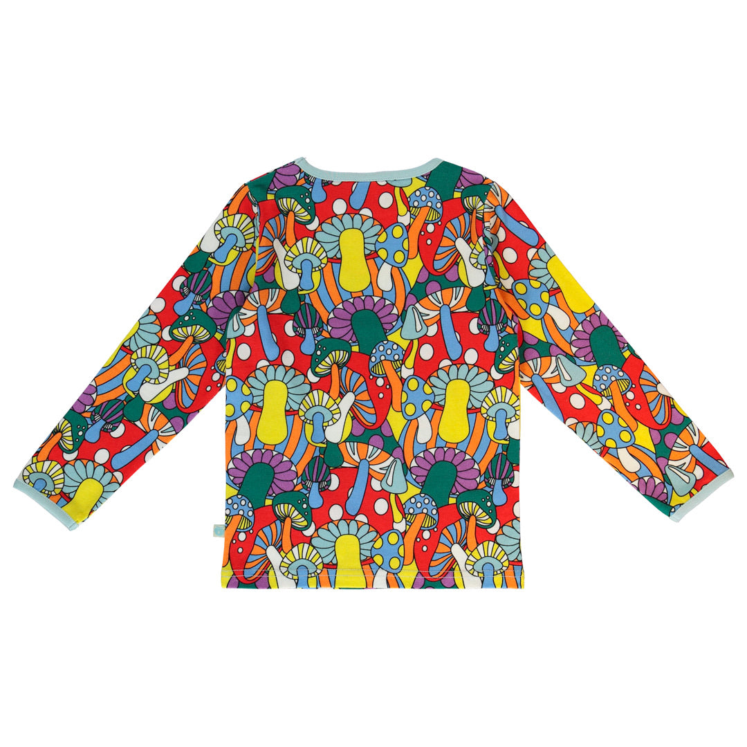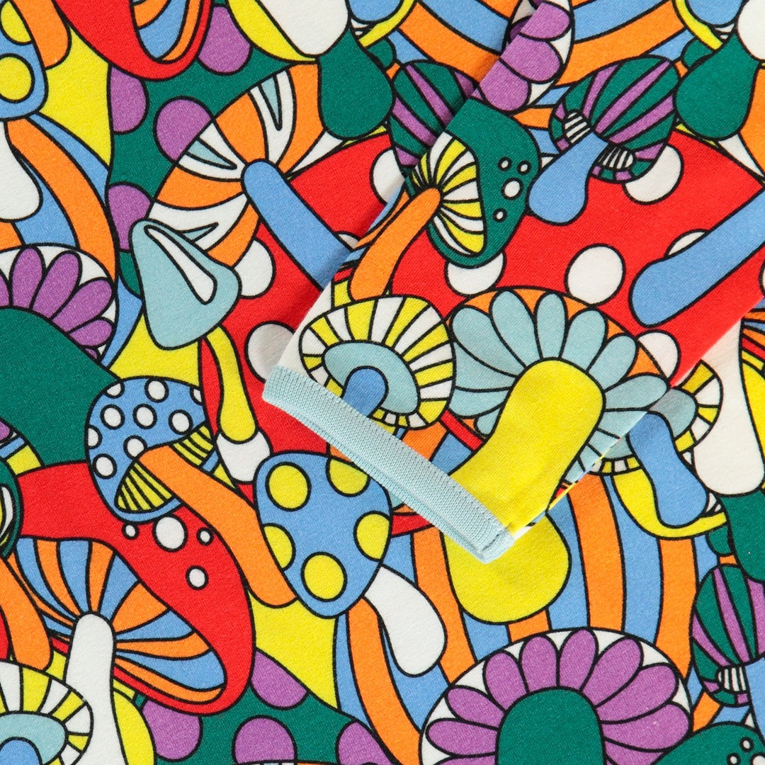 Langarmbluse mit Pilzen, hergestellt aus dehnbarem Bio-Baumwolljersey. Diese Bluse ist nach OEKO-TEX Standard 100® zertifiziert, was bedeutet, dass die Bluse hergestellt und auf Schadstoffe getestet wurde, sodass Sie sich um die Haut und Gesundheit Ihres Kindes kümmern können.