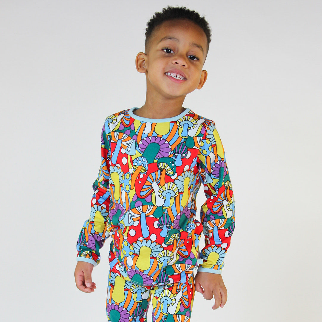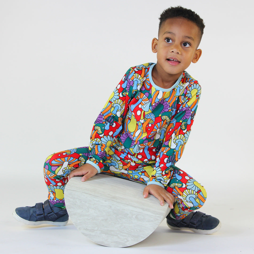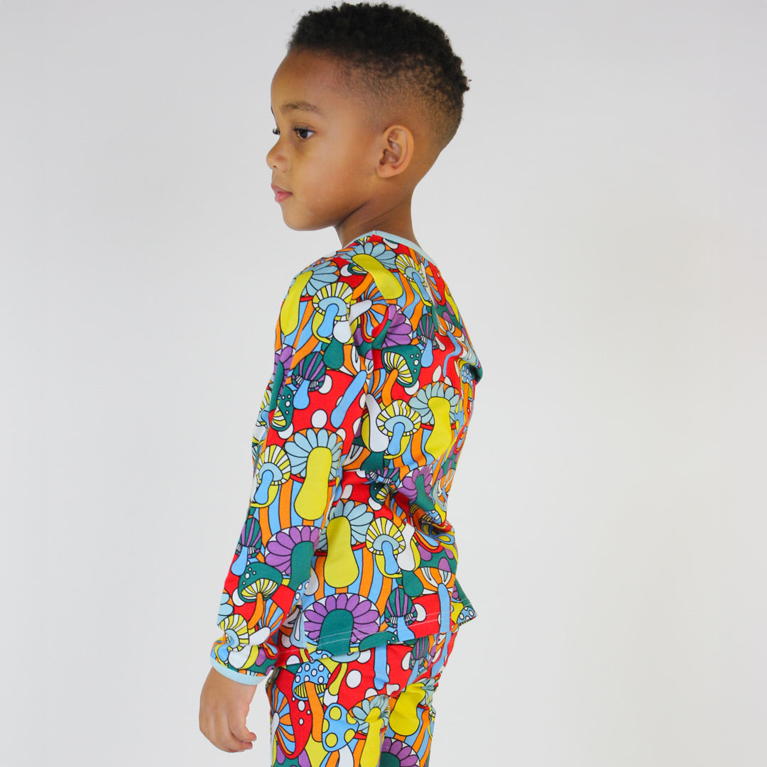 Langarmbluse mit Pilzen, hergestellt aus dehnbarem Bio-Baumwolljersey. Diese Bluse ist nach OEKO-TEX Standard 100® zertifiziert, was bedeutet, dass die Bluse hergestellt und auf Schadstoffe getestet wurde, sodass Sie sich um die Haut und Gesundheit Ihres Kindes kümmern können.