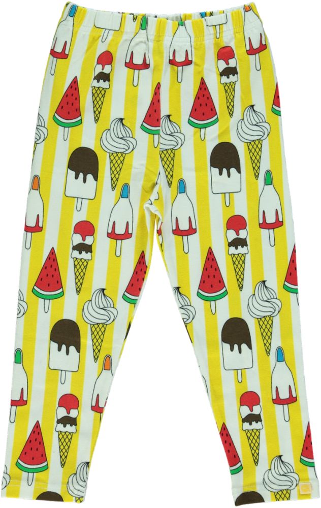 Leggings with an icecream print.The model has elastic at the waistThe motive on the leggings illustrates an ice cream, so the child can make a story about the motive themselfthe model is made of 95% organic cotton 5% elasthan