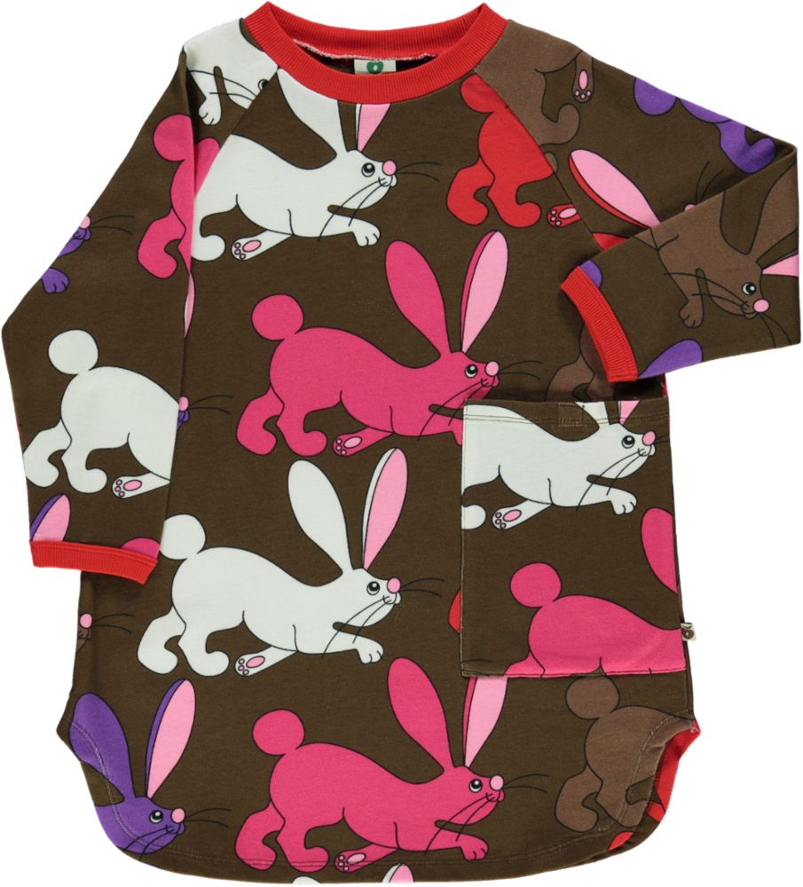 Das Sweatshirt wurde in Dänemark entworfen und aus 100 % bester Bio-Baumwolle hergestellt. Das Sweatshirt hat weiche Rippen an Handgelenken und Hüften der Fantasie freien Lauf lassen, gleichzeitig kann sich das Kind frei bewegen und warm halten. Sweatshirt ist ideal für die kälteren Tage und Übergänge. Sweatshirtkleid mit Hasenaufdruck in Småfolks ganz eigenem Retro-Stil.Das Kleid hat eine große Tasche auf der Hüfte.