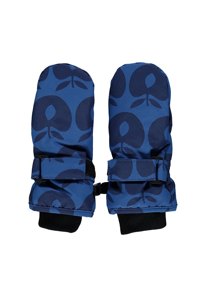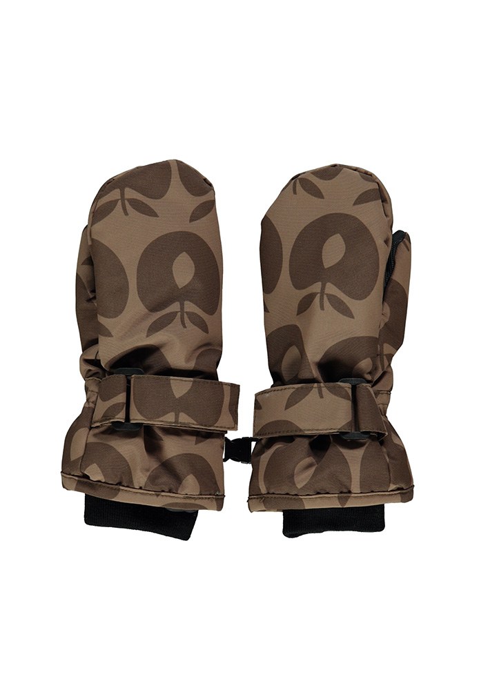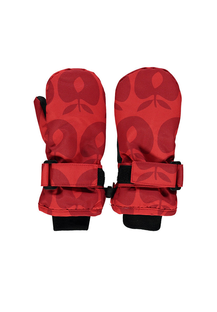 Fäustlinge mit Äpfeln. Diese Fäustlinge haben einen verstellbaren Klettverschluss am Handgelenk und können mit einer kleinen Schnalle zusammengesteckt werden. Die Handschuhe haben eine dicke, strapazierfähige Beschichtung an den Handflächen und ein Rippband an den Handgelenken, das das Eindringen von kaltem Wind und Schnee verhindert.