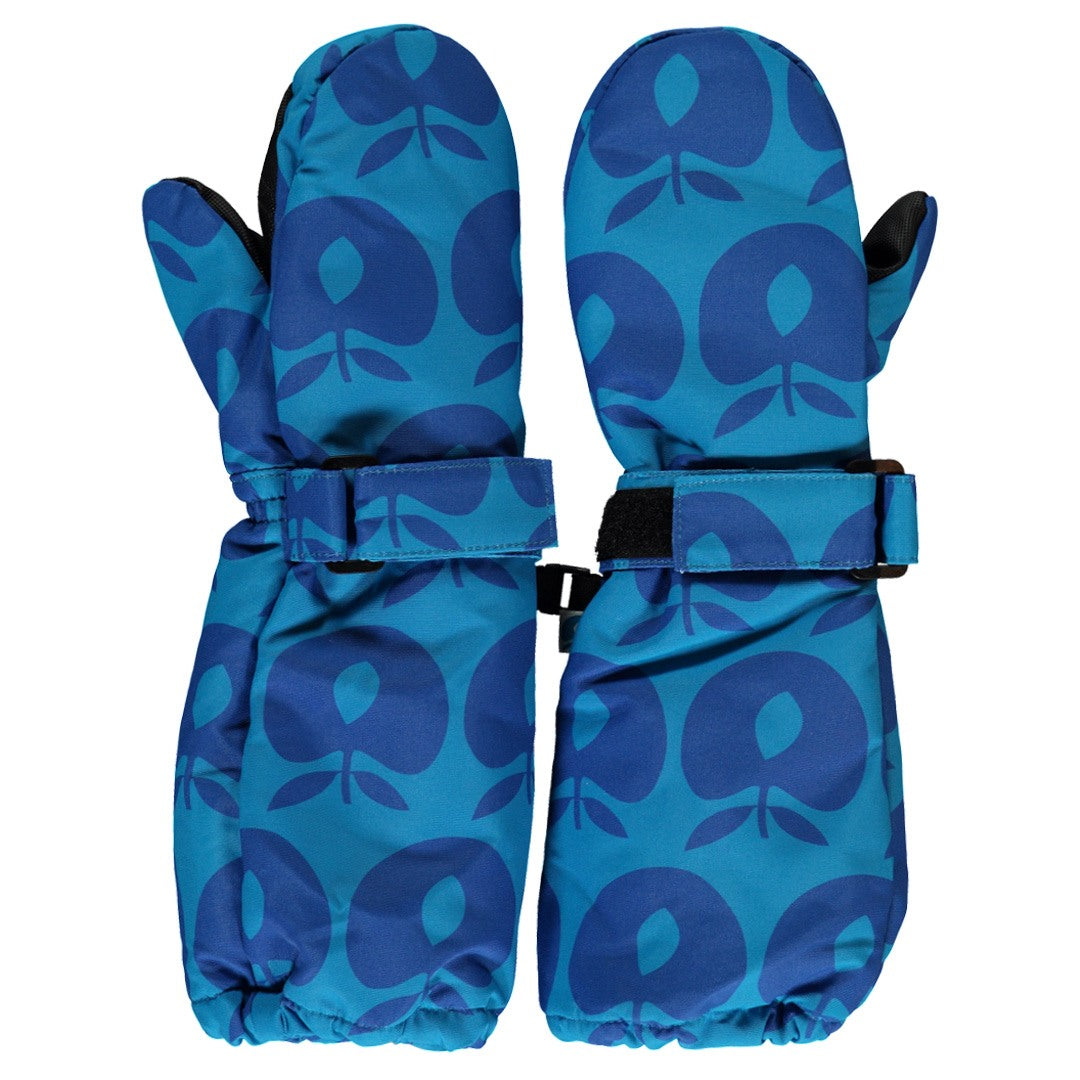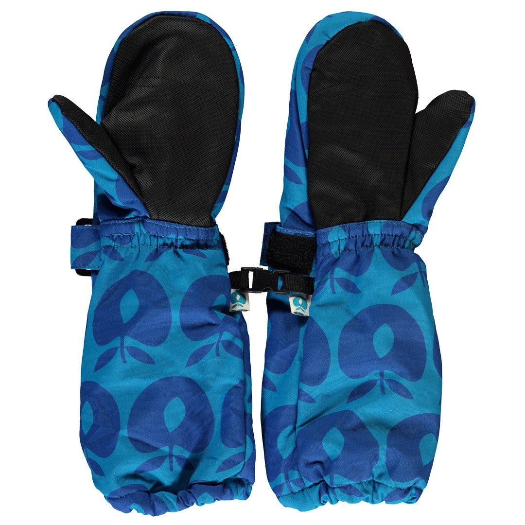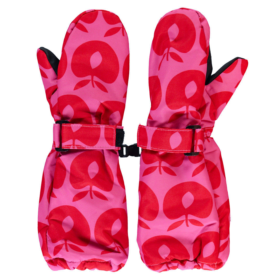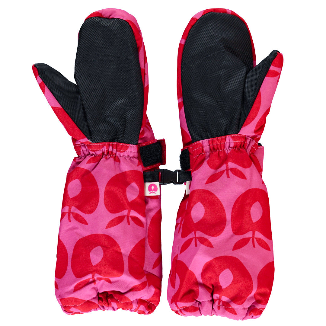 Fäustlinge mit Äpfeln. Diese Fäustlinge haben einen verstellbaren Klettverschluss am Handgelenk und können mit einer kleinen Schnalle zusammengesteckt werden. Die Handschuhe haben eine dicke, strapazierfähige Beschichtung an den Handflächen und einen längeren Schaftteil an den Handgelenken, das das Eindringen von kaltem Wind und Schnee verhindert.