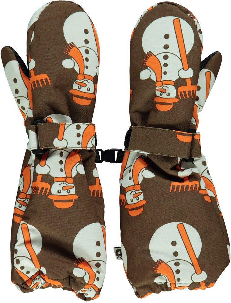 Fäustlinge mit Schneemännern. Diese Fäustlinge haben einen verstellbaren Klettverschluss am Handgelenk und können mit einer kleinen Schnalle zusammengesteckt werden. Die Handschuhe haben eine dicke, strapazierfähige Beschichtung an den Handflächen und einen längeren Schaftteil an den Handgelenken, das das Eindringen von kaltem Wind und Schnee verhindert.