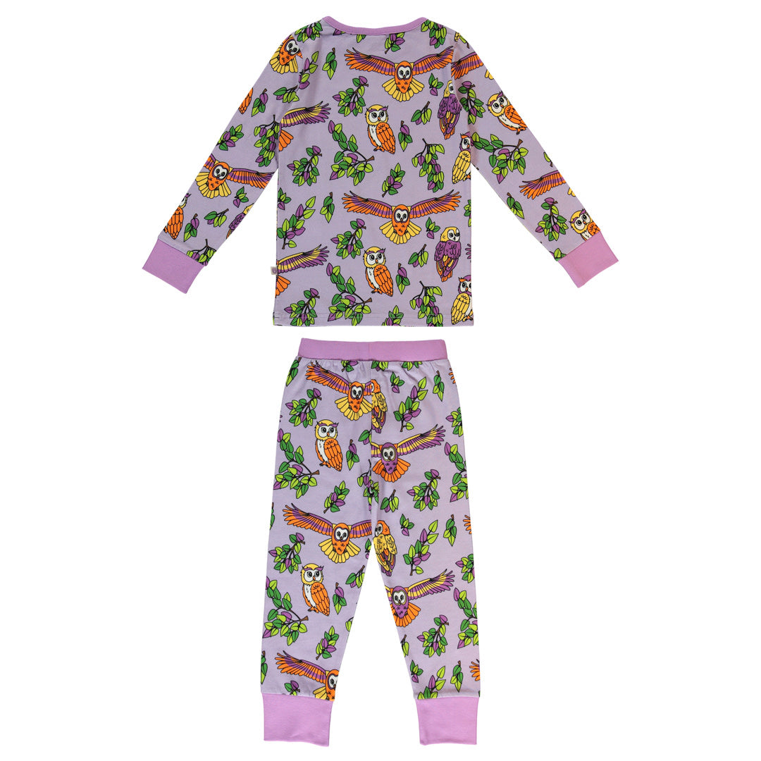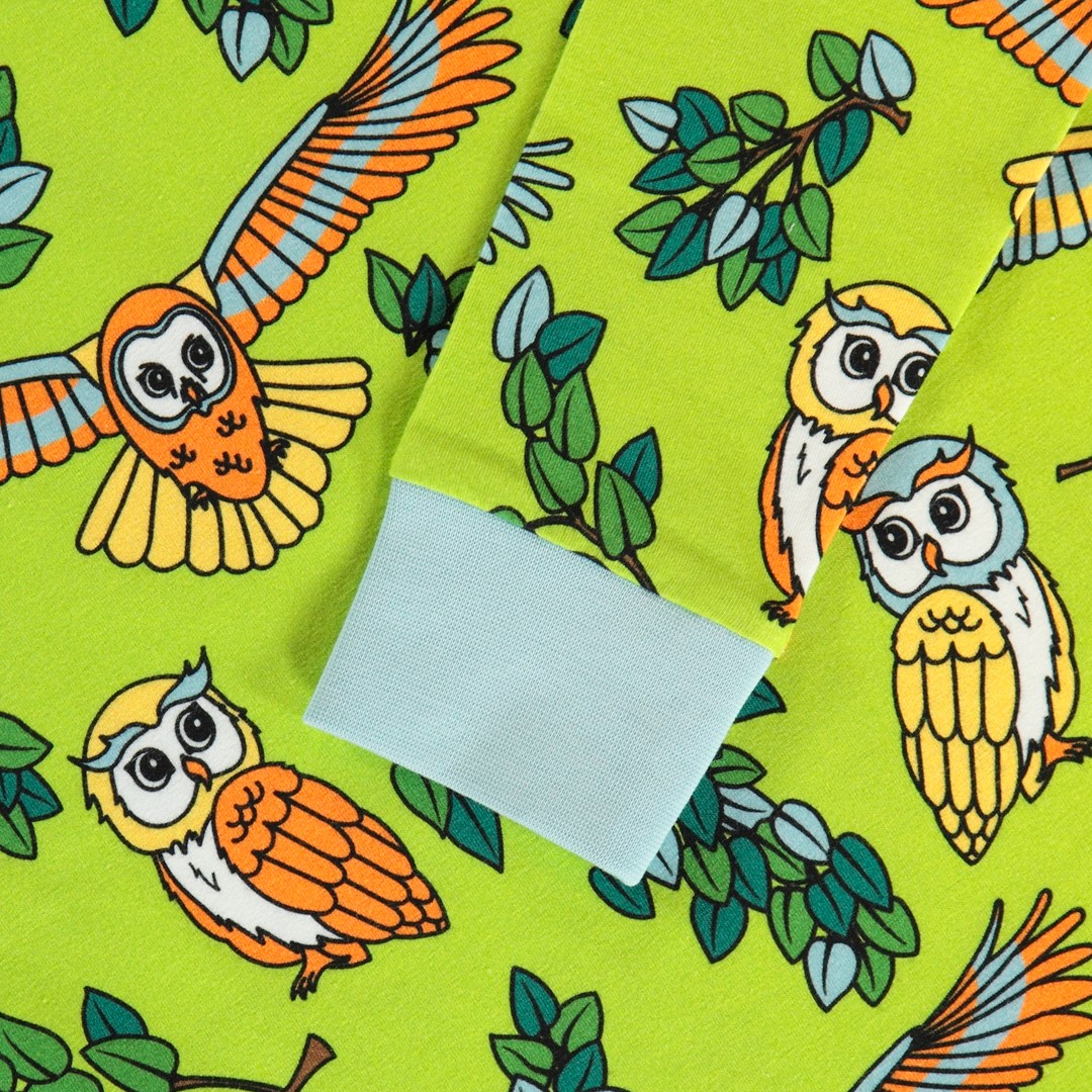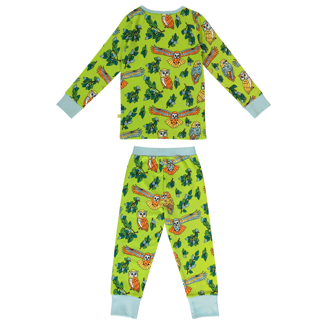 Nachtwäscheset mit Eulen, hergestellt aus organischem und dehnbarem Baumwolljersey. Das Set ist nach OEKO-TEX Standard 100® zertifiziert, was bedeutet, dass die Nachtwäsche auf Schadstoffe produziert und geprüft wird, sodass Sie sich um die Haut und Gesundheit Ihres Kindes kümmern können.