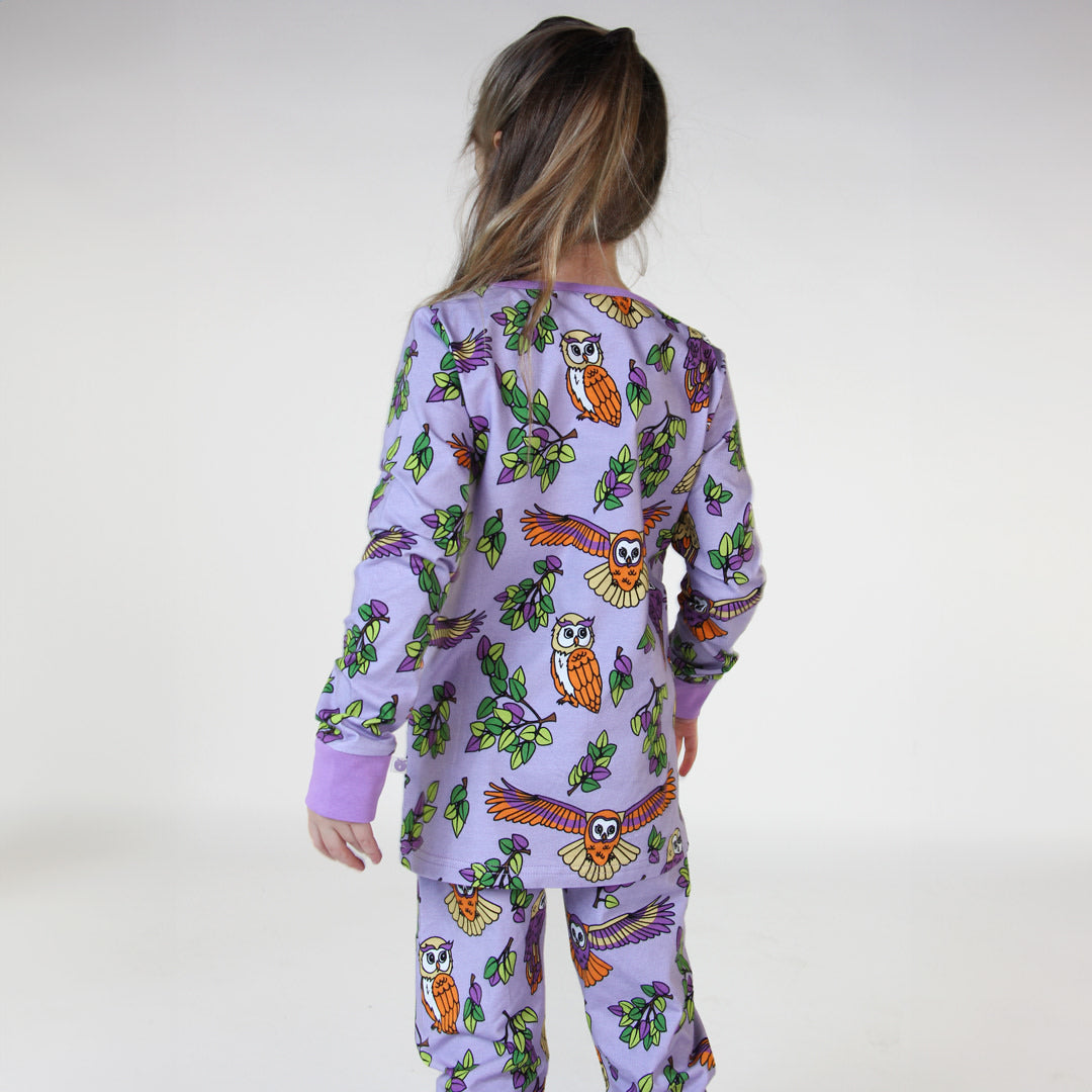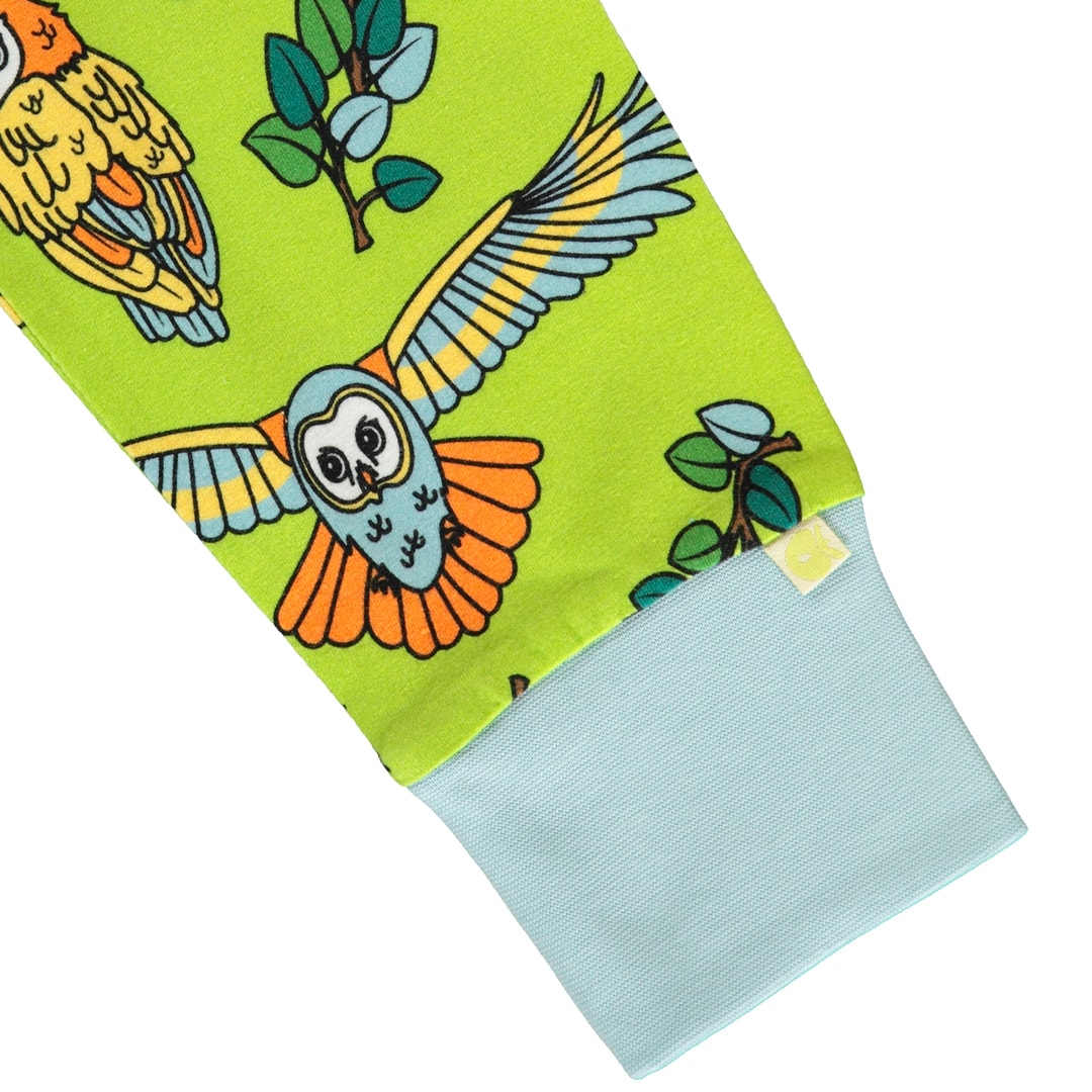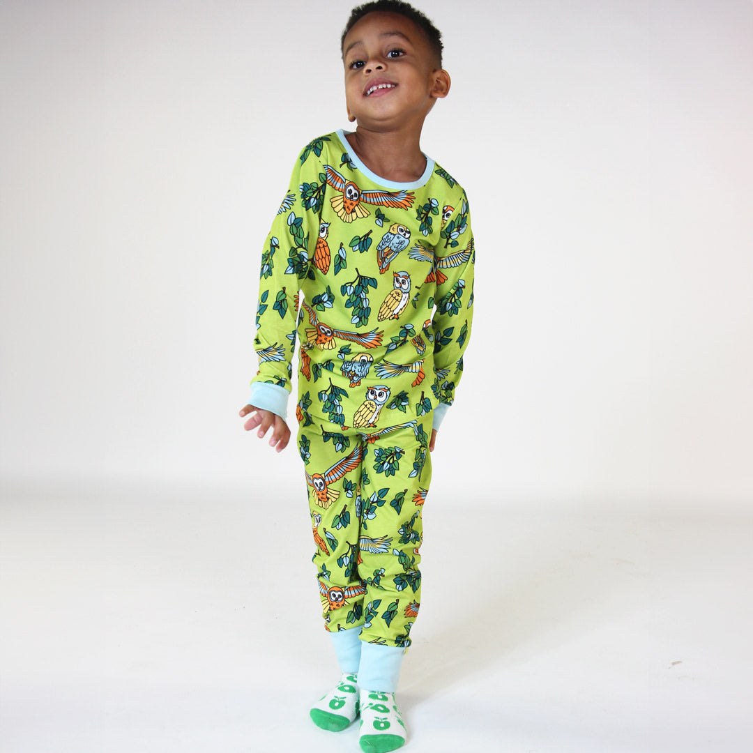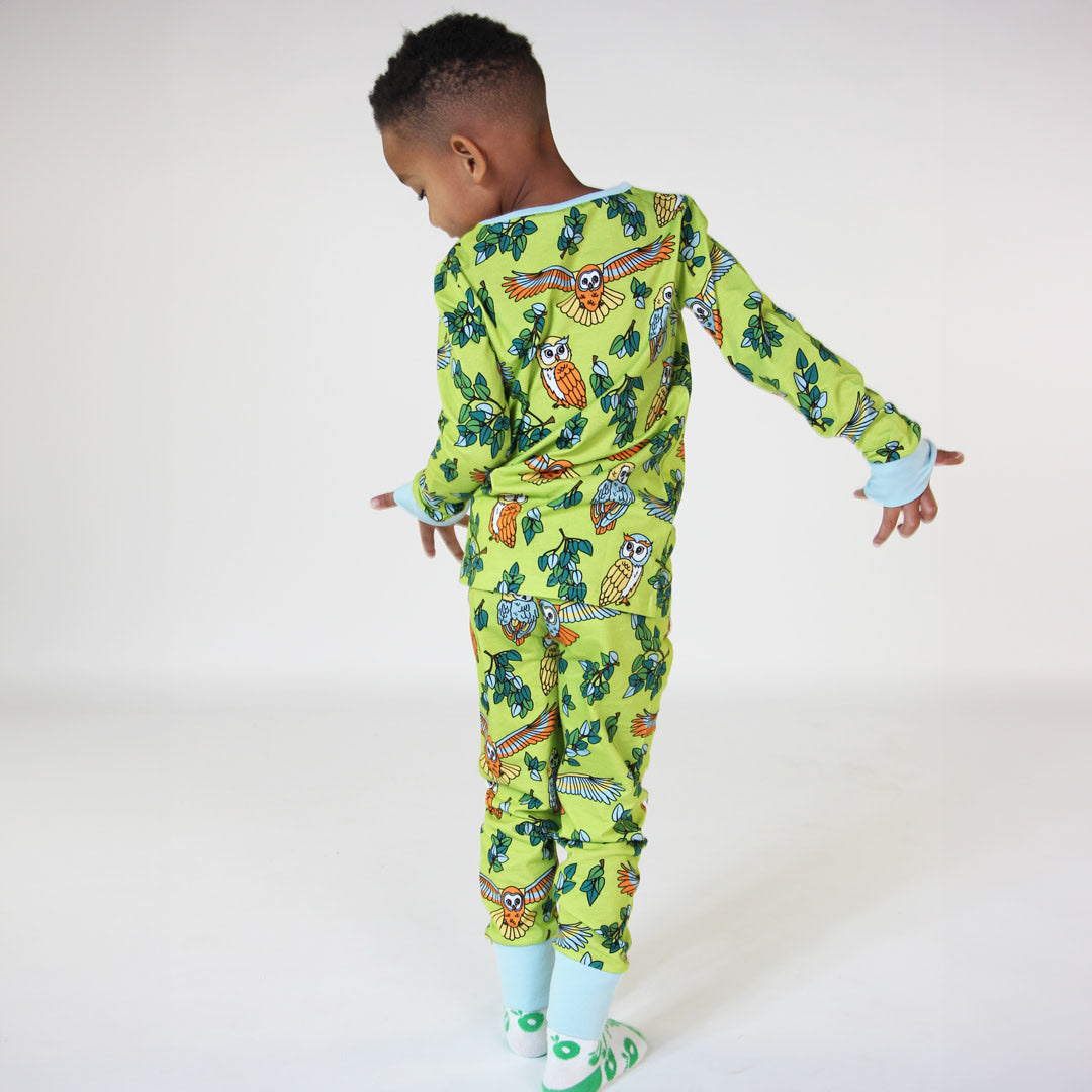 Nachtwäscheset mit Eulen, hergestellt aus organischem und dehnbarem Baumwolljersey. Das Set ist nach OEKO-TEX Standard 100® zertifiziert, was bedeutet, dass die Nachtwäsche auf Schadstoffe produziert und geprüft wird, sodass Sie sich um die Haut und Gesundheit Ihres Kindes kümmern können.