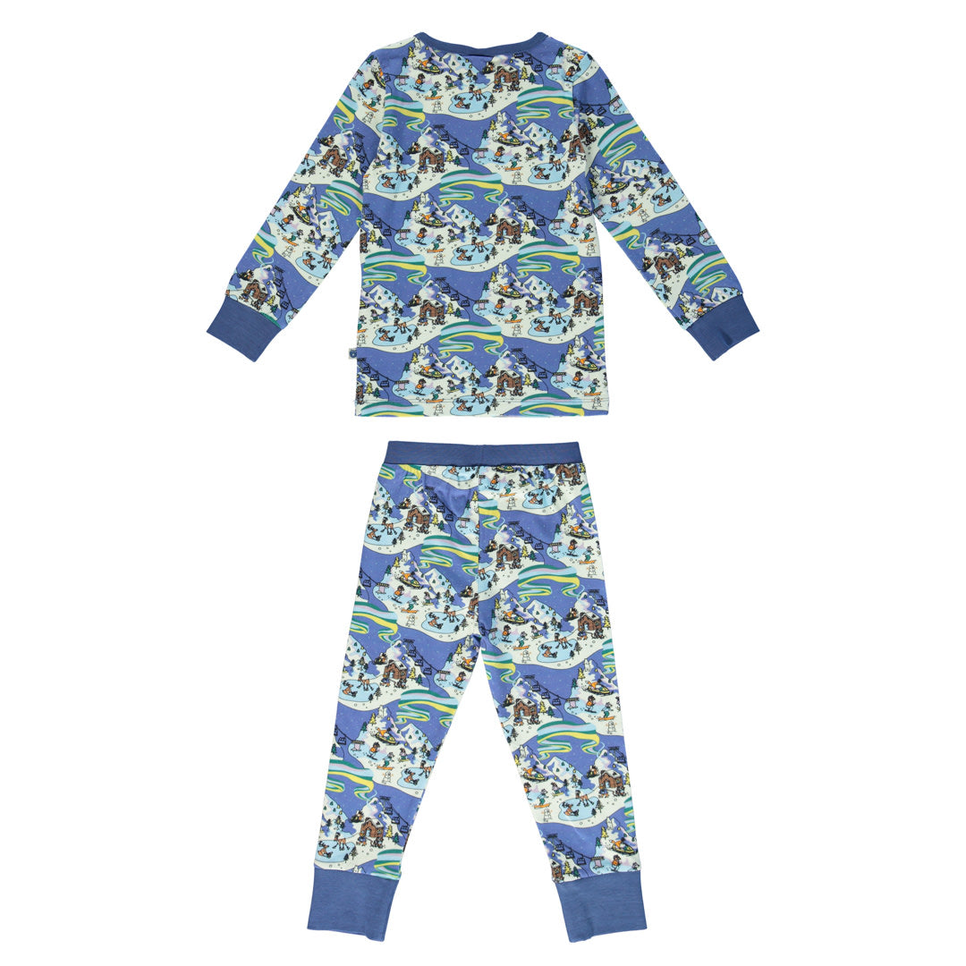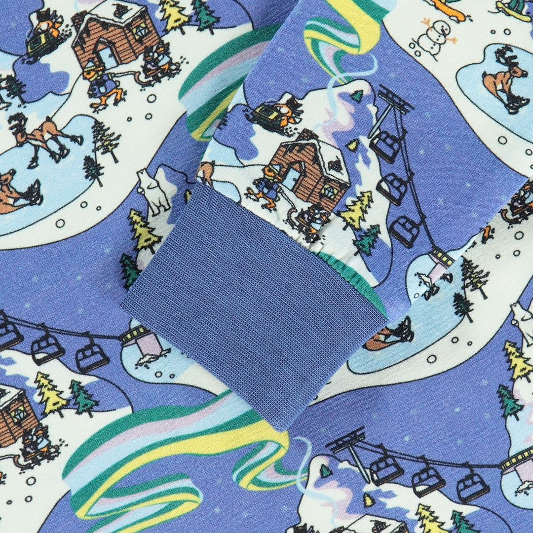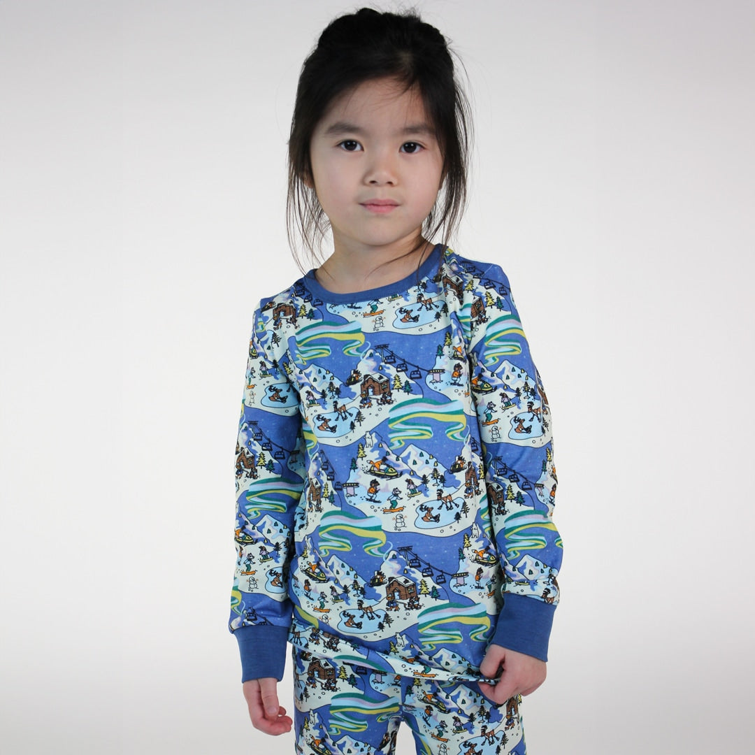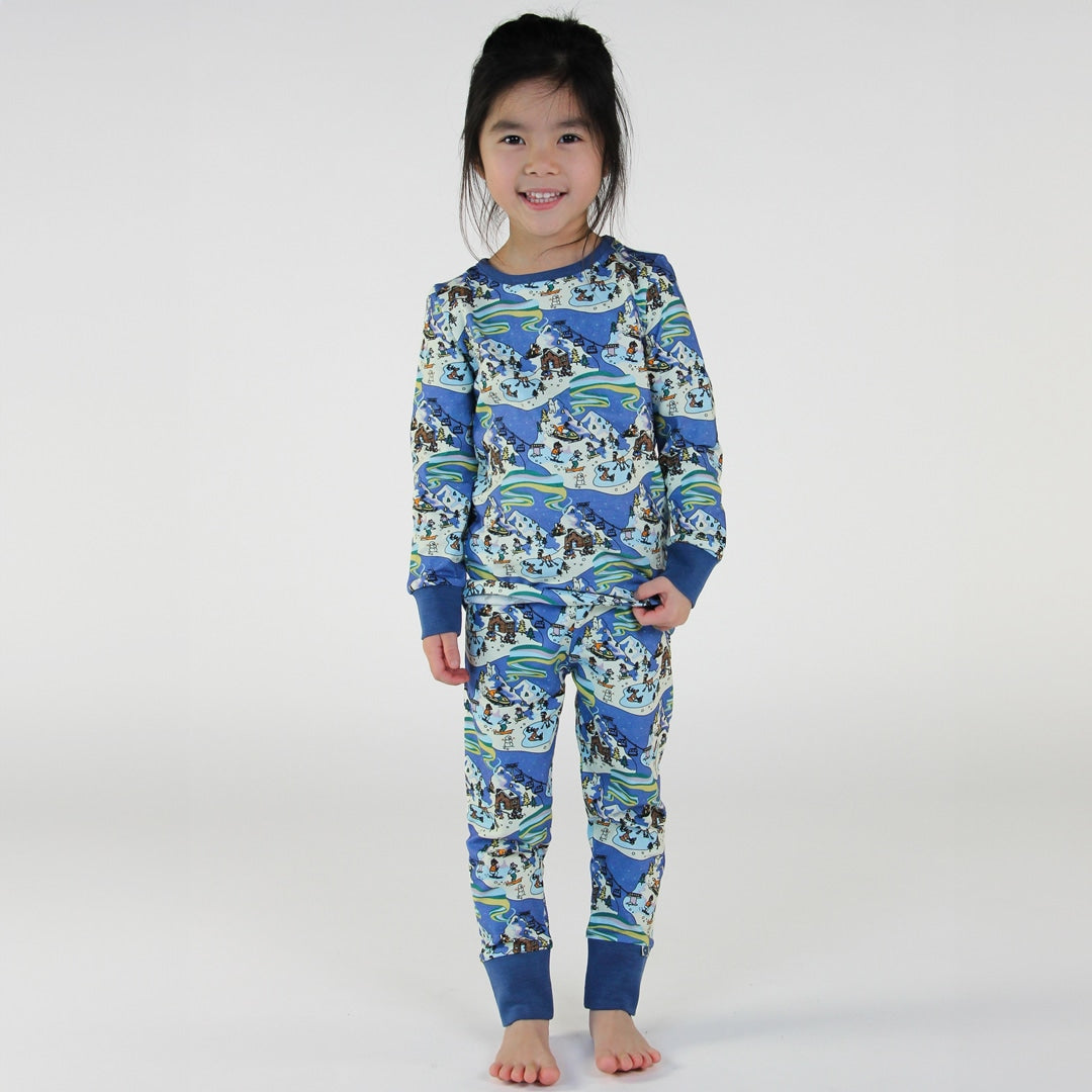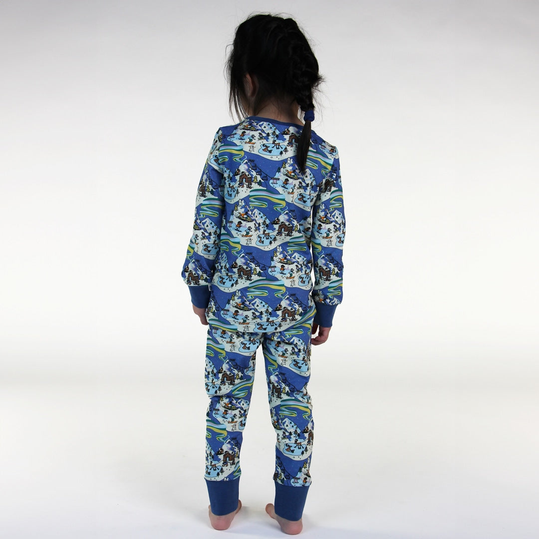 Nachtwäscheset mit Winterlandschaft, hergestellt aus organischem und dehnbarem Baumwolljersey. Das Set ist nach OEKO-TEX Standard 100® zertifiziert, was bedeutet, dass die Nachtwäsche auf Schadstoffe produziert und geprüft wird, sodass Sie sich um die Haut und Gesundheit Ihres Kindes kümmern können.