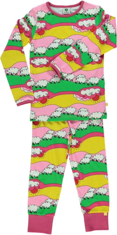 Nightwear with sheep print.The nightwear set is two-piece, hascomfortable elastic at the waist and also has awide rib at the foot.the nightwear set is produced in100% organic cotton.