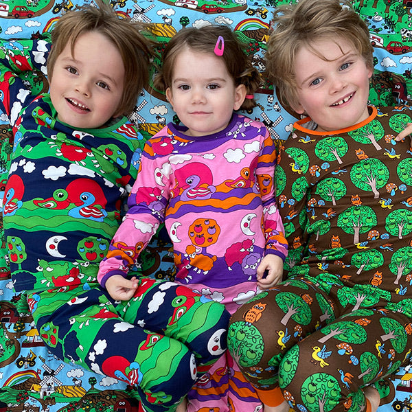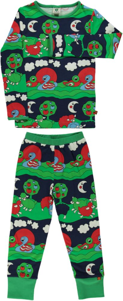 Die Nachtwäsche wird in Dänemark entworfen und aus 100 % bester Bio-Baumwolle und Elasthan hergestellt, was das Set dehnbar und weich macht und gleichzeitig die Passform behält Taille und hat eine breite Rippe am Fuß. Småfolk's Nachtwäsche ist in schönen hellen Farben, in denen Ihr Kind sicher und fest schlafen kann, während sich das Kind gleichzeitig frei bewegen kann.Småfolk's Nachtwäsche-Set ist ideal für lange Vormittags am Wochenende, wo das Kind in der weichsten Umgebung spielen und frühstücken kann. Nachtwäsche mit Landschaftsdruck in Småfolks ganz eigenem Retro-Stil.