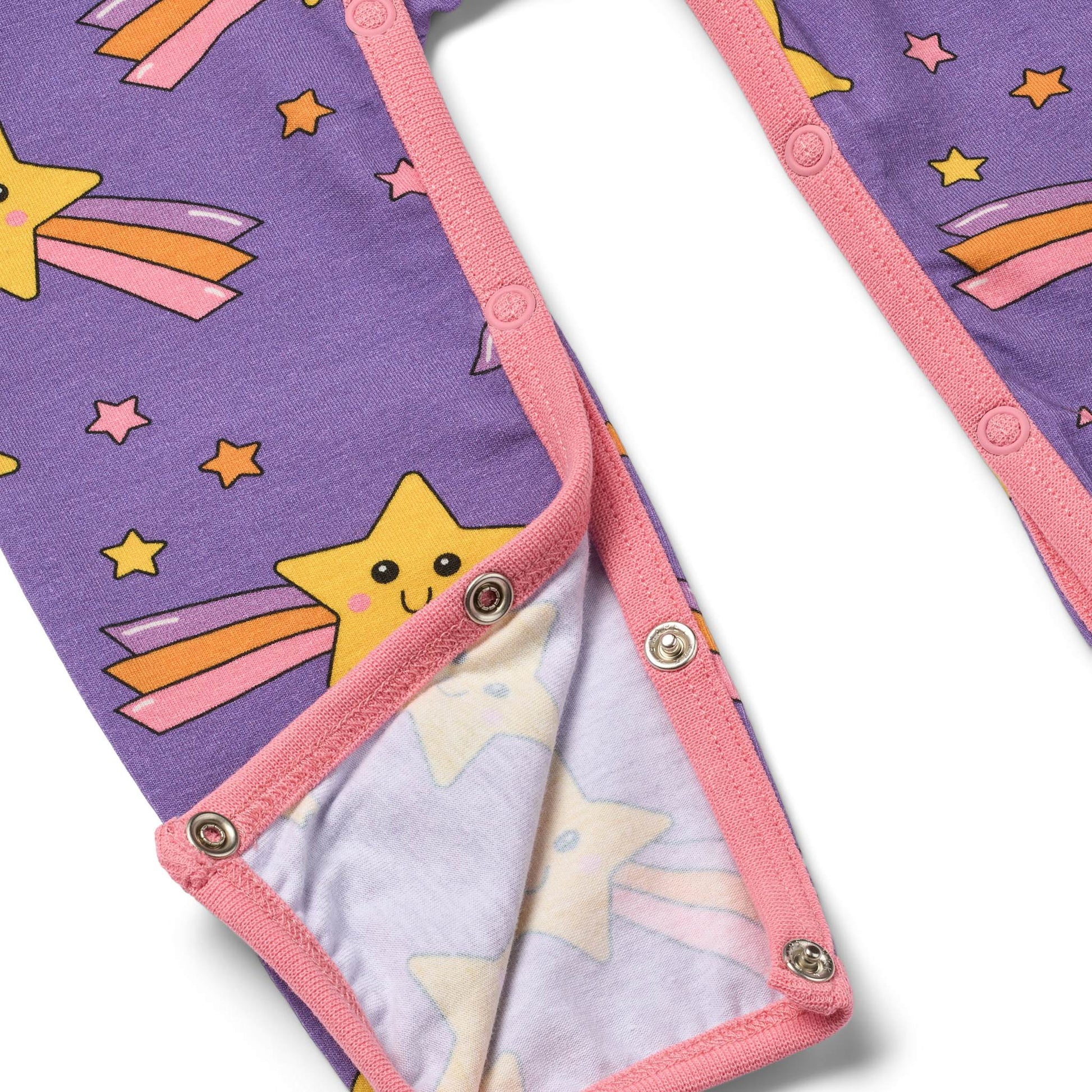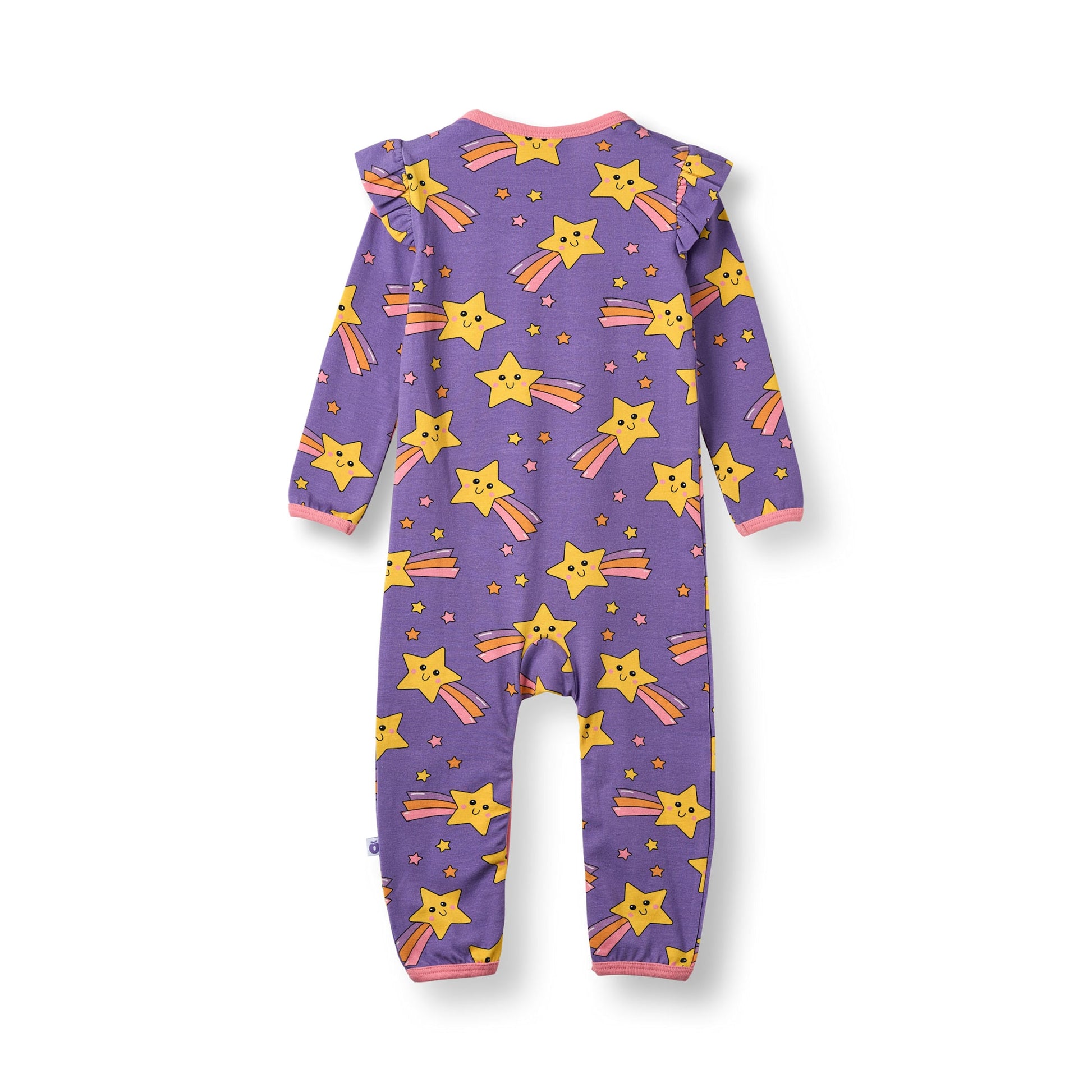 Einteiler für Babys mit Sternschnuppen, hergestellt aus dehnbarem Bio-Baumwolljersey. Dieser Overall ist nach OEKO-TEX Standard 100® zertifiziert, was bedeutet, dass der Anzug hergestellt und auf Schadstoffe getestet wurde, sodass Sie sich um die Haut und Gesundheit Ihres Kindes kümmern können.