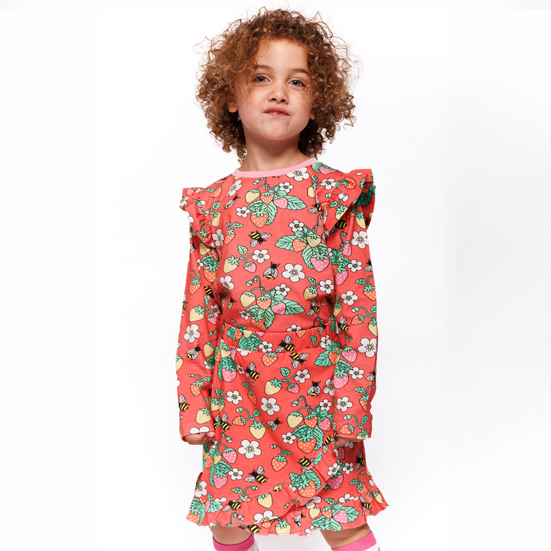 Rock mit Erdbeeren, hergestellt aus dehnbarem Bio-Baumwolljersey. Dieses Kleid ist nach OEKO-TEX Standard 100® zertifiziert, was bedeutet, dass das Kleid hergestellt und auf Schadstoffe getestet wurde, sodass Sie sich um die Haut und Gesundheit Ihres Kindes kümmern können.