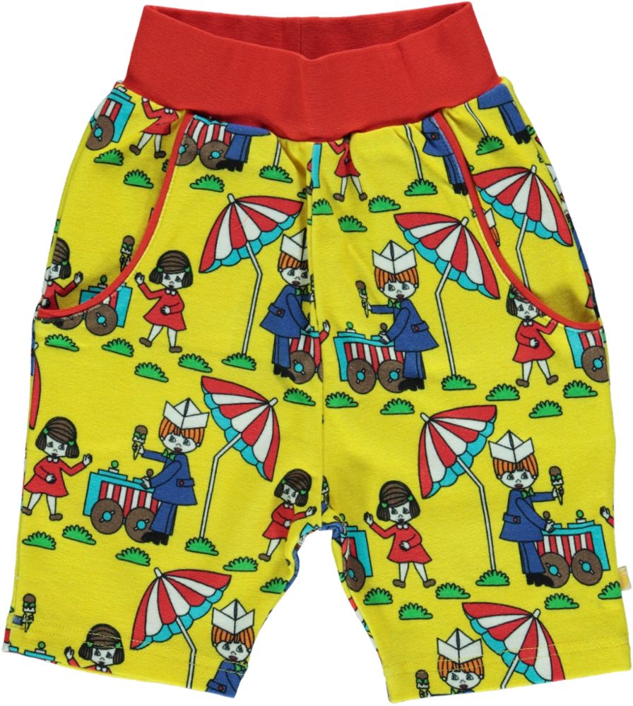 Shorts with a print of an icecream booth.The model has elastic at the waistThe motive on the shorts illustrates an ice cream so the child can make a story about the motive themself. the model is made of 95% organic cotton 5% elasthan