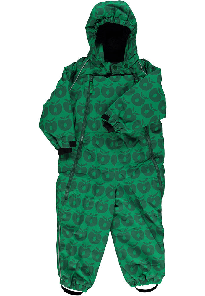 Schneeanzug für Kleinkinder mit Äpfeln von Größe 6–12 Monate bis 3–4 Jahre. Dieser Overall hat vorne zwei Reißverschlüsse, die bis weit in die Beine reichen, sowie einen Klettverschluss vorne, der dafür sorgt, dass das Kind rund um Körper und Hals gut geschützt ist. Der Anzug verfügt über Klettverschlüsse an den Handgelenken, sodass die Ärmel problemlos in einige Handschuhe passen, sowie über eine abnehmbare Kapuze mit Teddyfleece. Der Anzug hat hinten einen Gummizug für eine bessere Passform. Der Schneeanzug verfügt über abnehmbare Gummibänder an den Füßen und reflektierende Paspeln vorne und hinten an den Armen und an der Unterseite der Hosenbeine.