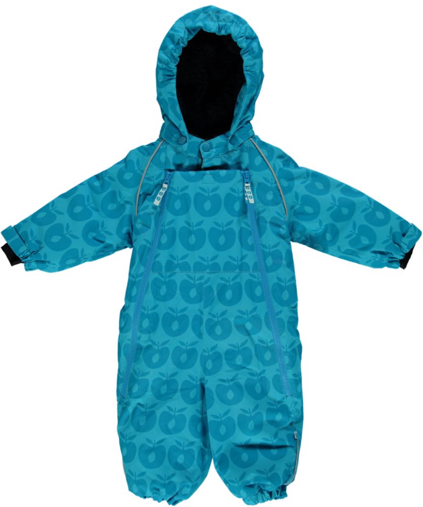 Schneeanzug für Kleinkinder mit Äpfeln von Größe 6–12 Monate bis 3–4 Jahre. Dieser Overall hat vorne zwei Reißverschlüsse, die bis weit in die Beine reichen, sowie einen Klettverschluss vorne, der dafür sorgt, dass das Kind rund um Körper und Hals gut geschützt ist. Der Anzug verfügt über Klettverschlüsse an den Handgelenken, sodass die Ärmel problemlos in einige Handschuhe passen, sowie über eine abnehmbare Kapuze mit Teddyfleece. Der Anzug hat hinten einen Gummizug für eine bessere Passform. Der Schneeanzug verfügt über abnehmbare Gummibänder an den Füßen und reflektierende Paspeln vorne und hinten an den Armen und an der Unterseite der Hosenbeine.