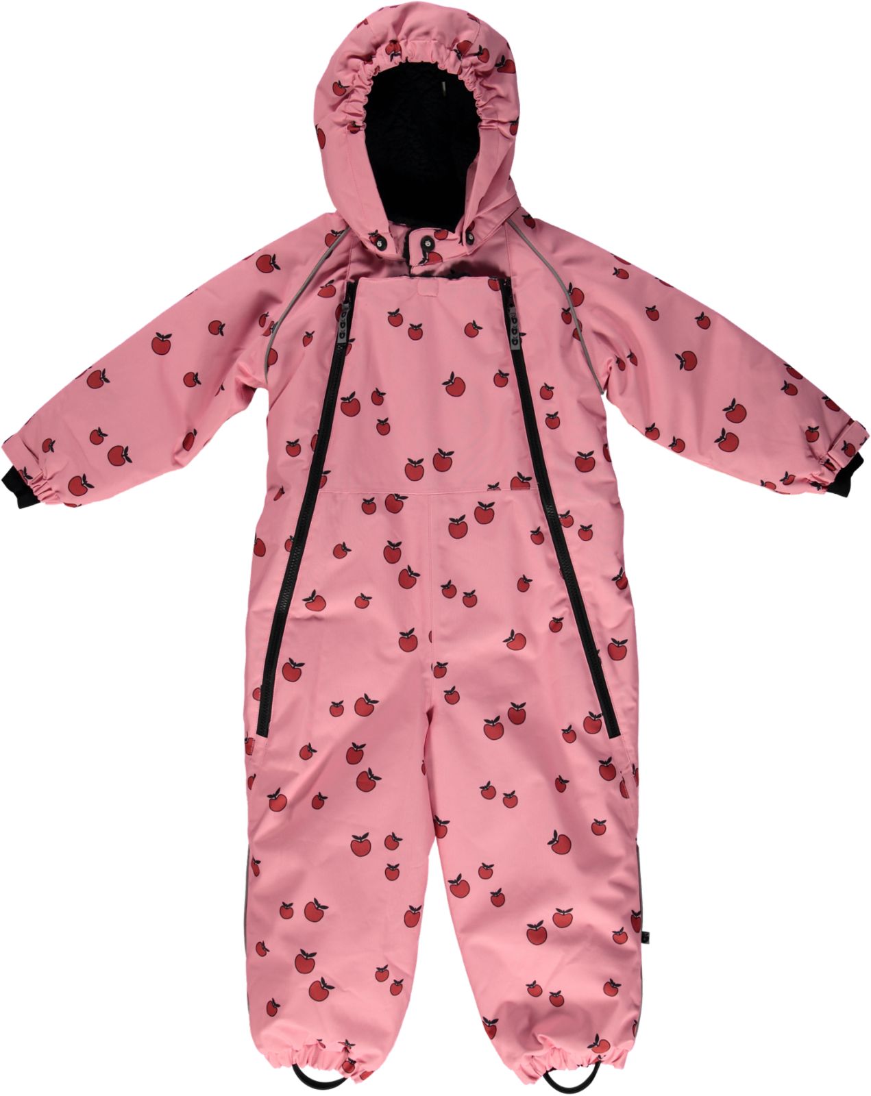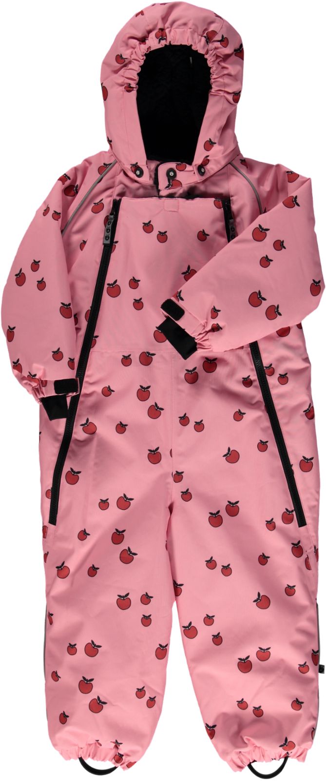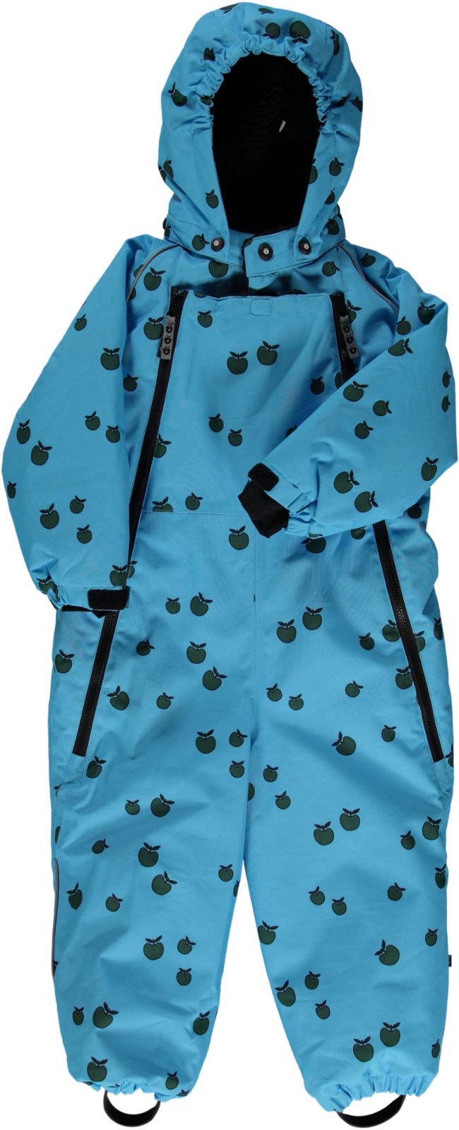 Schneeanzug für Kleinkinder mit Äpfeln von Größe 6–12 Monate bis 3–4 Jahre. Dieser Overall hat vorne zwei Reißverschlüsse, die bis weit in die Beine reichen, sowie einen Klettverschluss vorne, der dafür sorgt, dass das Kind rund um Körper und Hals gut geschützt ist. Der Anzug verfügt über Klettverschlüsse an den Handgelenken, sodass die Ärmel problemlos in einige Handschuhe passen, sowie über eine abnehmbare Kapuze mit Teddyfleece. Der Anzug hat hinten einen Gummizug für eine bessere Passform. Der Schneeanzug verfügt über abnehmbare Gummibänder an den Füßen und reflektierende Paspeln vorne und hinten an den Armen und an der Unterseite der Hosenbeine.