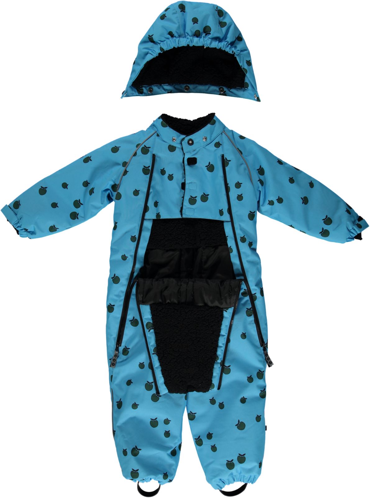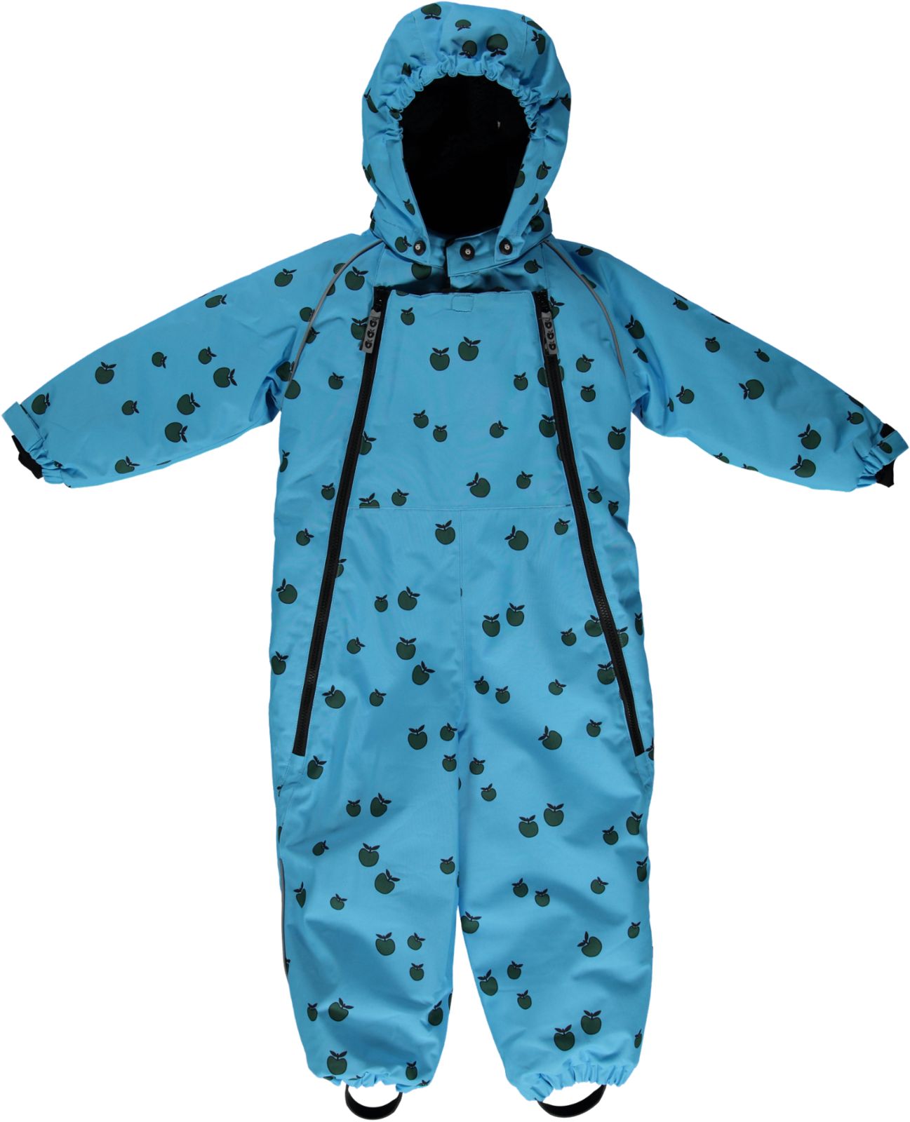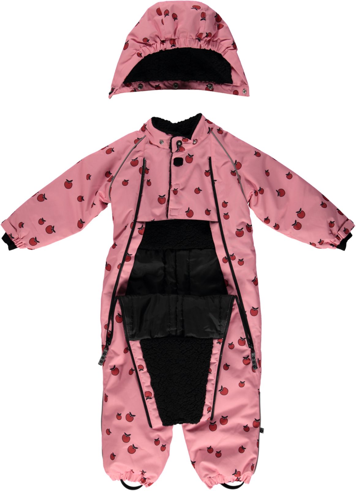 Schneeanzug für Kleinkinder mit Äpfeln von Größe 6–12 Monate bis 3–4 Jahre. Dieser Overall hat vorne zwei Reißverschlüsse, die bis weit in die Beine reichen, sowie einen Klettverschluss vorne, der dafür sorgt, dass das Kind rund um Körper und Hals gut geschützt ist. Der Anzug verfügt über Klettverschlüsse an den Handgelenken, sodass die Ärmel problemlos in einige Handschuhe passen, sowie über eine abnehmbare Kapuze mit Teddyfleece. Der Anzug hat hinten einen Gummizug für eine bessere Passform. Der Schneeanzug verfügt über abnehmbare Gummibänder an den Füßen und reflektierende Paspeln vorne und hinten an den Armen und an der Unterseite der Hosenbeine.