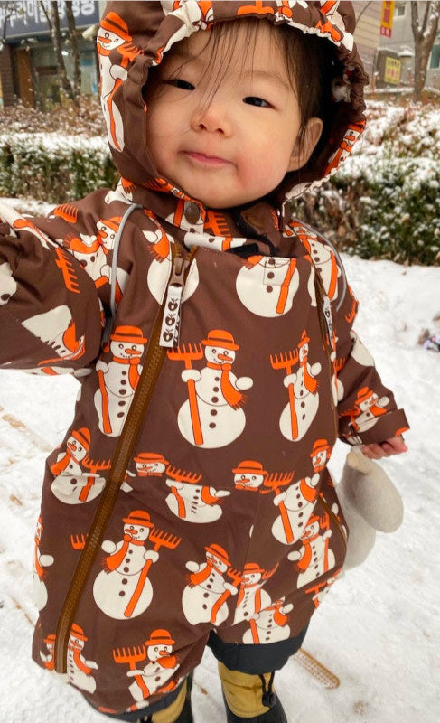 Schneeanzug für Kleinkinder mit Schneemännern von Größe 6–12 Monate bis 3–4 Jahre. Dieser Overall hat vorne zwei Reißverschlüsse, die bis weit in die Beine reichen, sowie einen Klettverschluss vorne, der dafür sorgt, dass das Kind rund um Körper und Hals gut geschützt ist. Der Anzug verfügt über Klettverschlüsse an den Handgelenken, sodass die Ärmel problemlos in einige Handschuhe passen, sowie über eine abnehmbare Kapuze mit Teddyfleece. Der Anzug hat hinten einen Gummizug für eine bessere Passform. Der Schneeanzug verfügt über abnehmbare Gummibänder an den Füßen und reflektierende Paspeln vorne und hinten an den Armen und an der Unterseite der Hosenbeine.