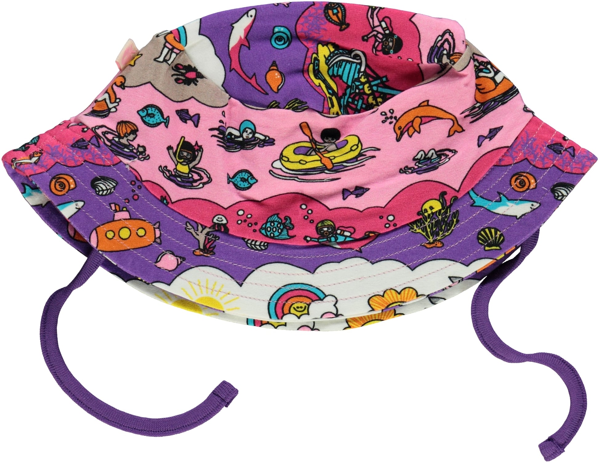 Sun hat with beach landscape print.sun hat with two cords to hold the hat onthe child's head. The sun hat isproduced in cotton and elastane