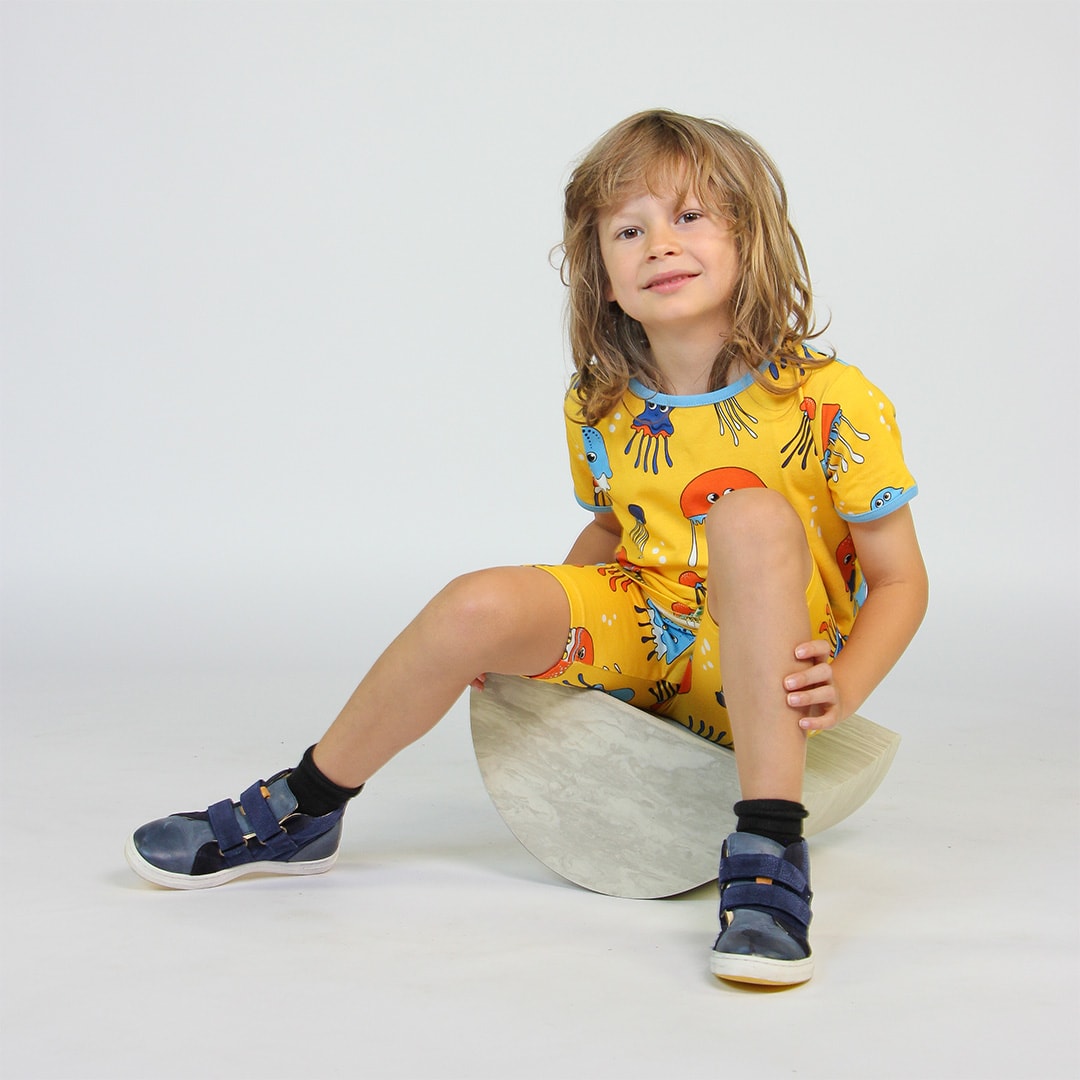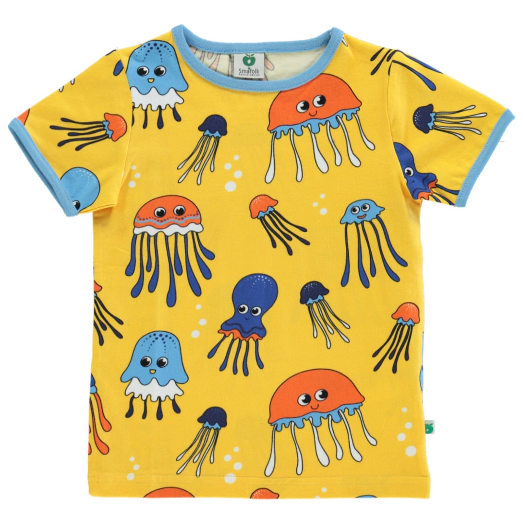 T-shirt mit Qualle, hergestellt aus organischem und dehnbarem Baumwolljersey. Dieses Top ist nach OEKO-TEX Standard 100® zertifiziert, was bedeutet, dass das Top hergestellt und auf schädliche Chemikalien getestet wurde, um die Haut und Gesundheit Ihres Kindes zu schützen. Dieses T-shirt hat eine normale Passform und Rippbündchen am Hals und an den Ärmeln. Die Top von Småfolk werden in Dänemark entworfen und halten unzähligen Abenteuern und endlosen Spielstunden stand und behalten auch nach mehrmaligem Gebrauch ihre Form und Farbe.