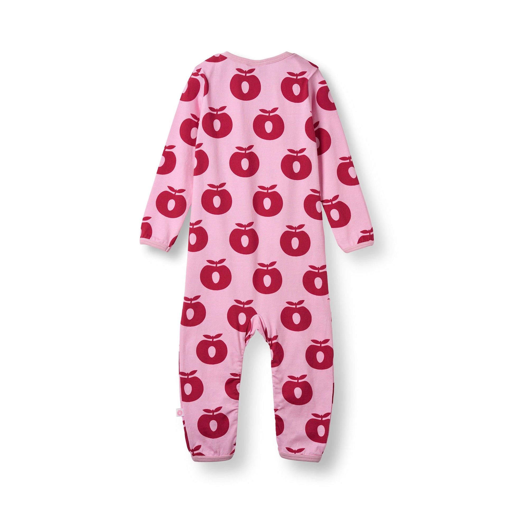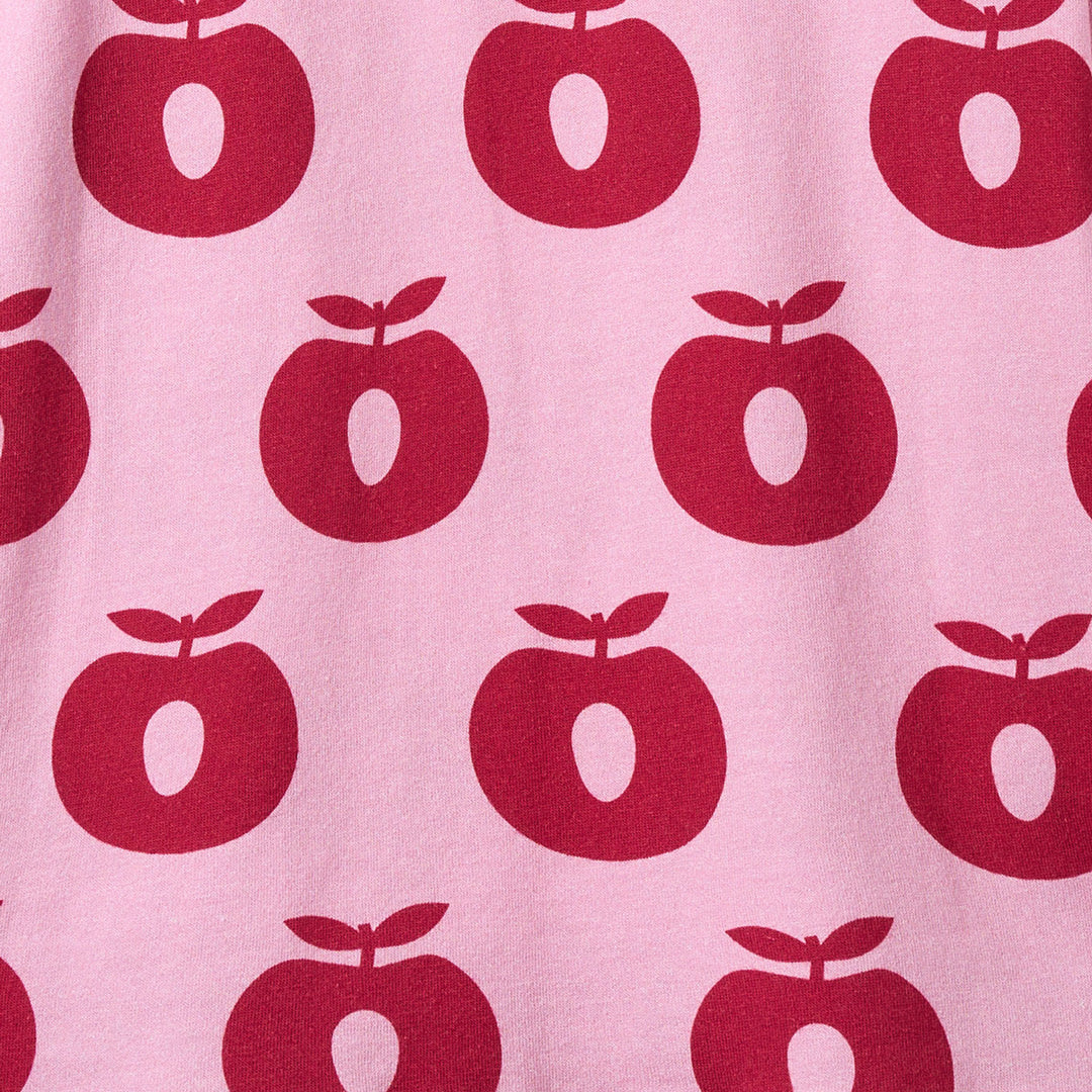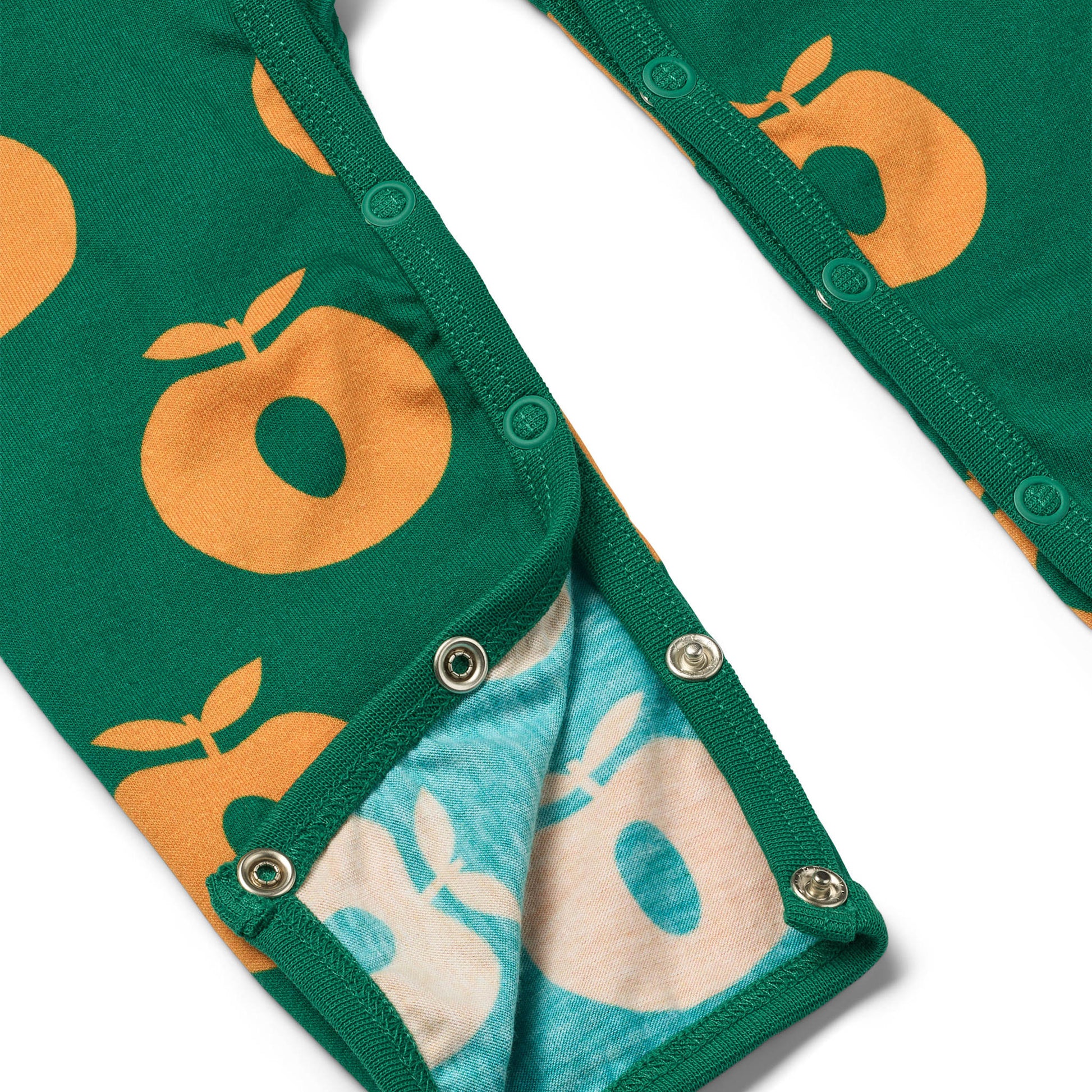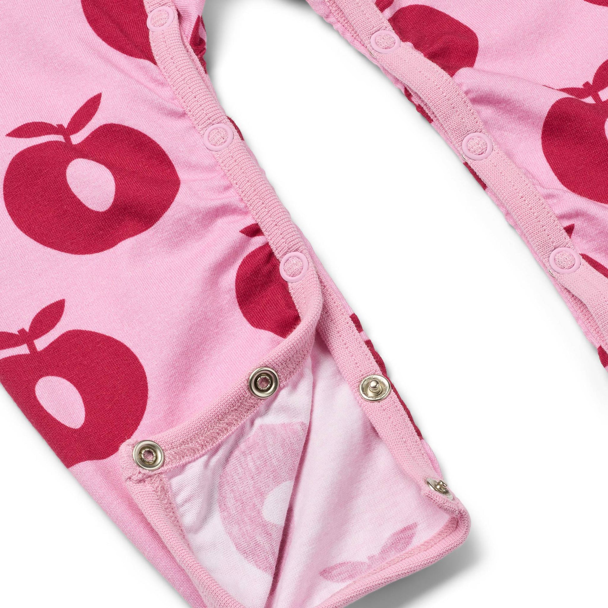 Einteiler für Babys mit Äpfeln, hergestellt aus dehnbarem Bio-Baumwolljersey. Dieser Overall ist nach OEKO-TEX Standard 100® zertifiziert, was bedeutet, dass der Anzug hergestellt und auf Schadstoffe getestet wurde, sodass Sie sich um die Haut und Gesundheit Ihres Kindes kümmern können.